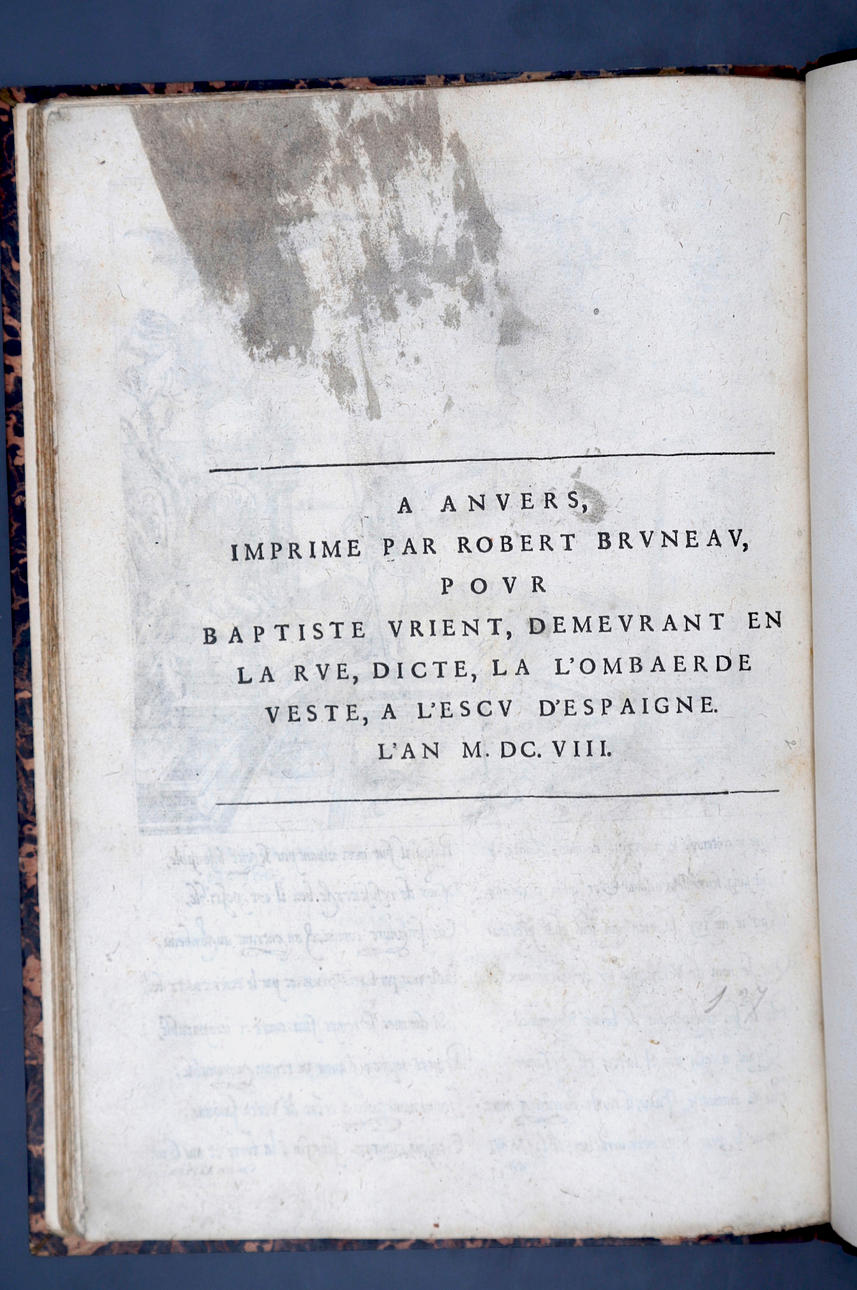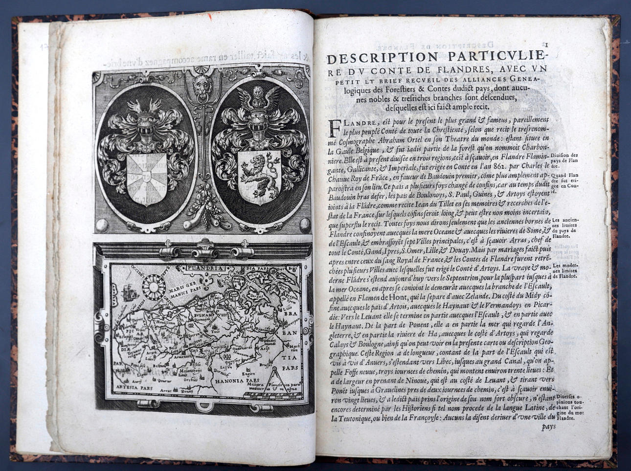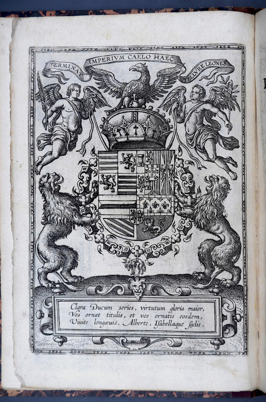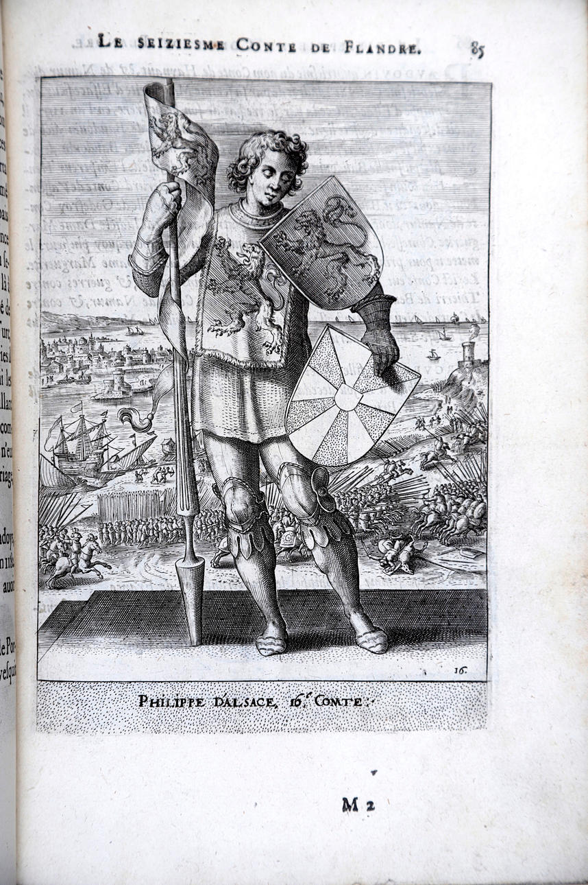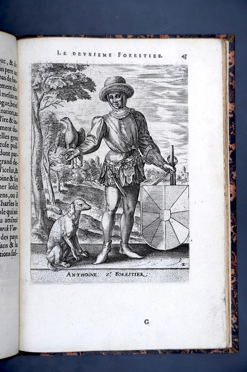 Corneille Martin, "Genealogies des forestiers et contes de Flandres avec brieue histoire de leurs vies / Recueillies de plus veritables et ancienes chroniques par Cornille Martin ; ornées des vrais pourtraicts et habits a la facon de leurs temps, tirés des anciens tableaux par Piere Balthasar", Amberes, Boutique Plantinienne, 1612. (6), 121 y (2) p. Con abundantes láminas de Pierre Balthazar (o Balten). Encuadernación en pasta valenciana.