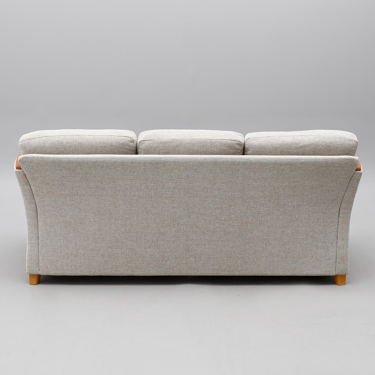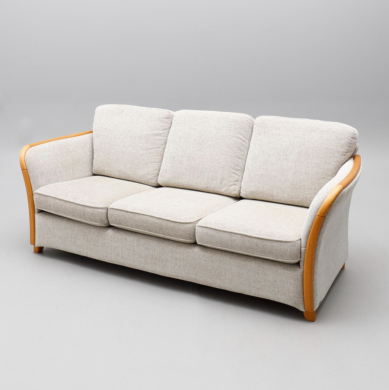 Roble. Tres plazas, cojines acolchados sueltos y dos almohadas extra. Longitud 195 cm, altura del asiento aproximadamente 42 cm.