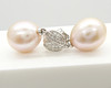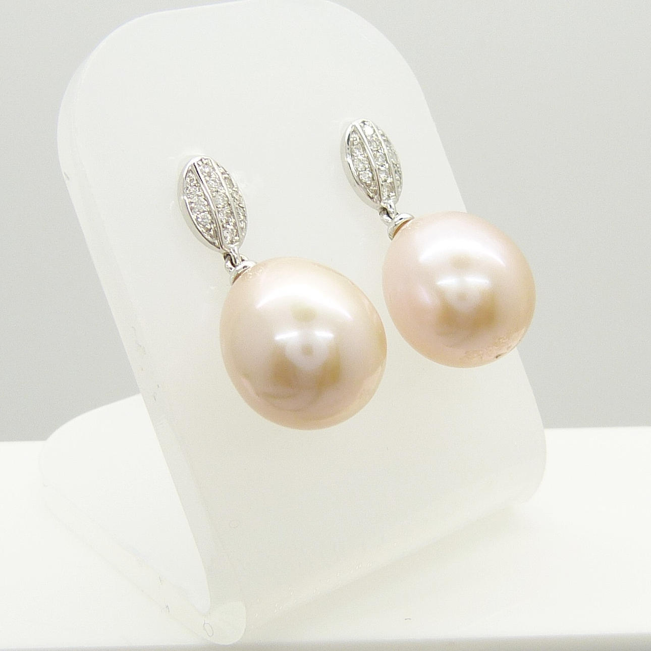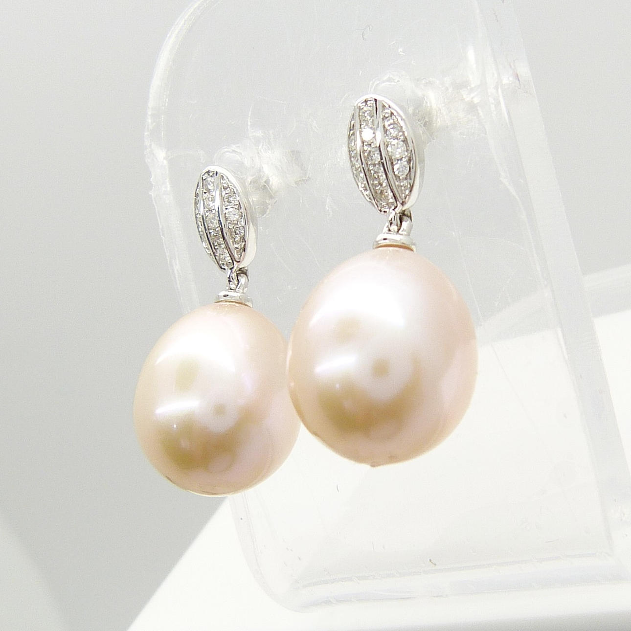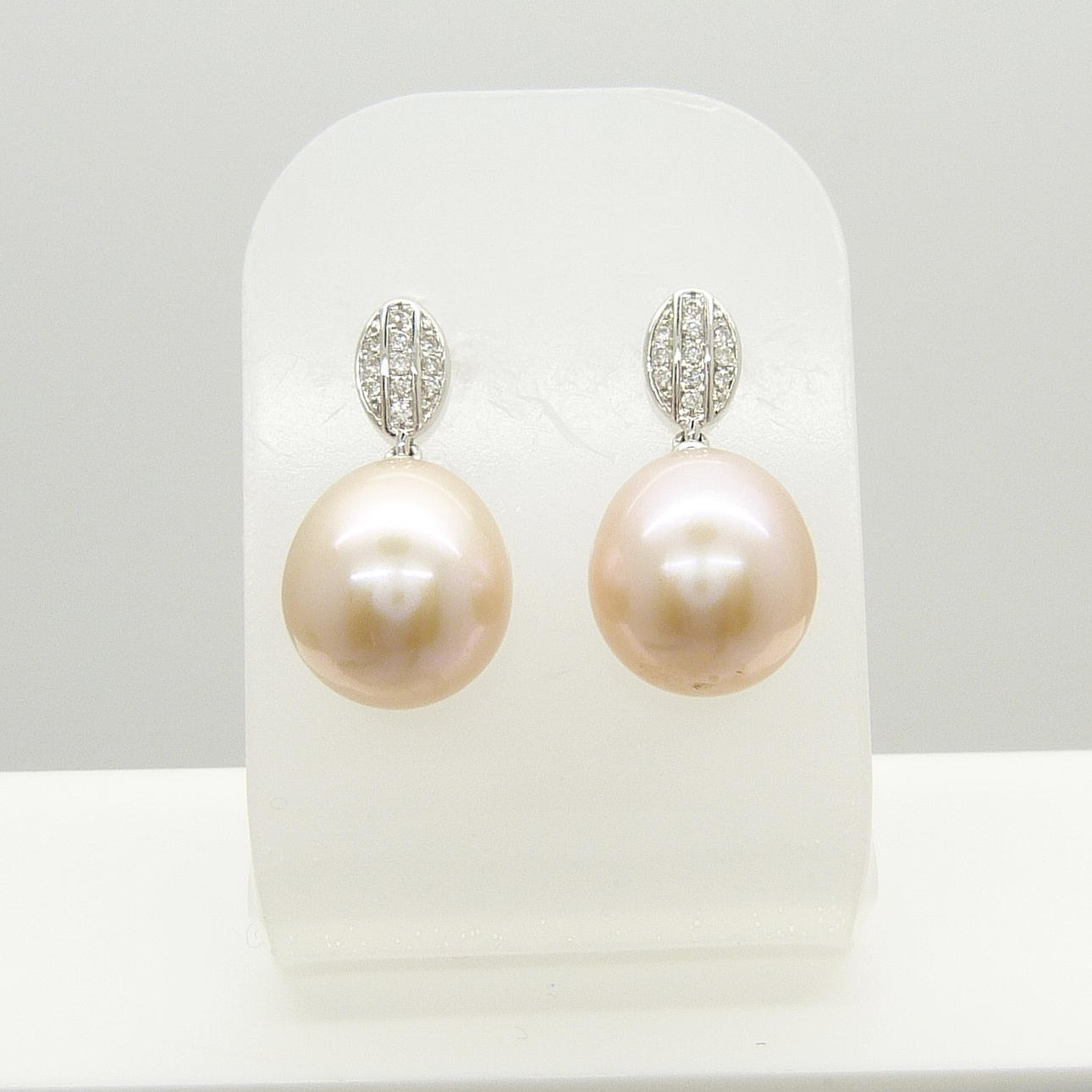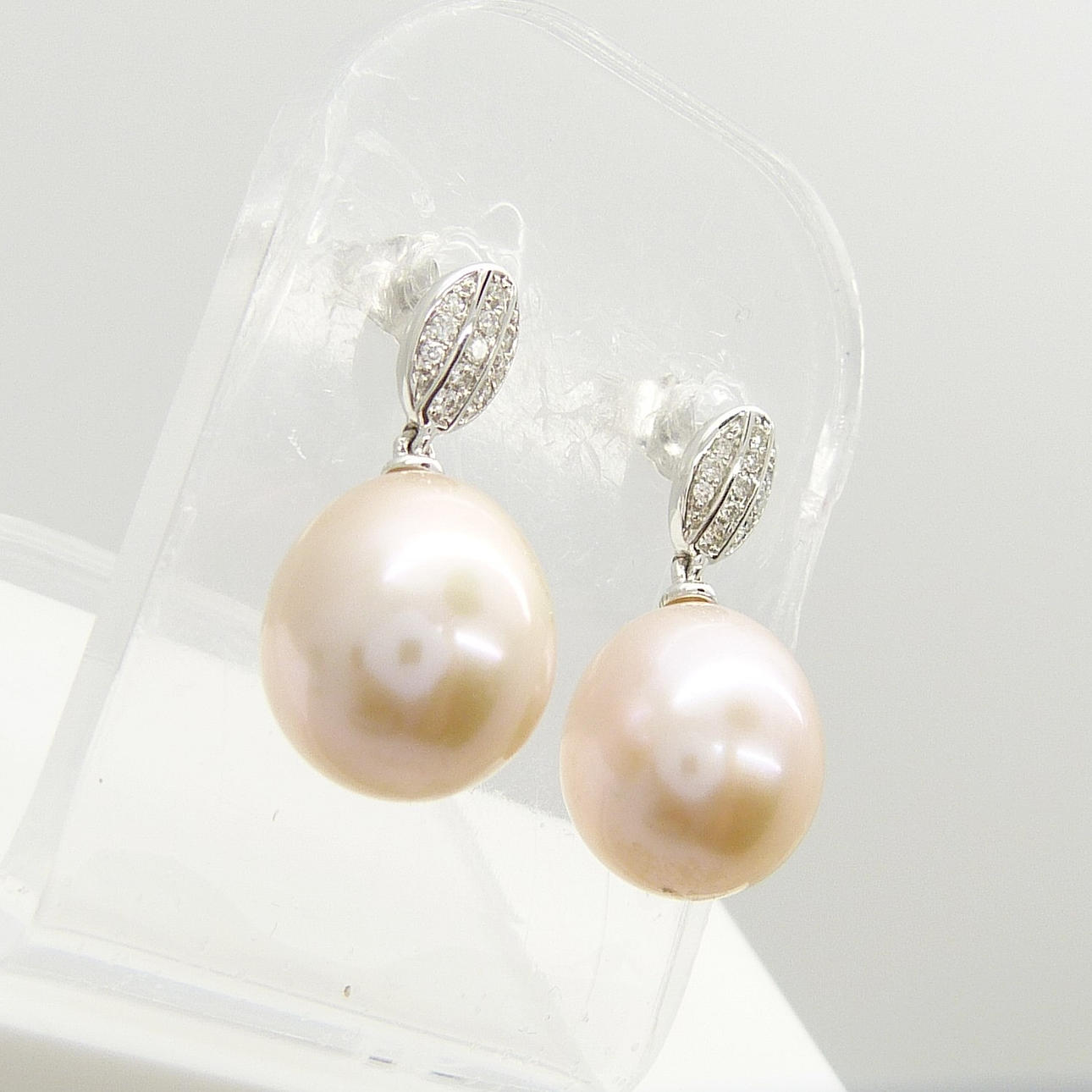 Un par de aretes estilo Art Deco de oro blanco de 9k engastados con perlas cultivadas ovaladas de color rosa/melocotón y fardos de DIAMANTE .