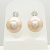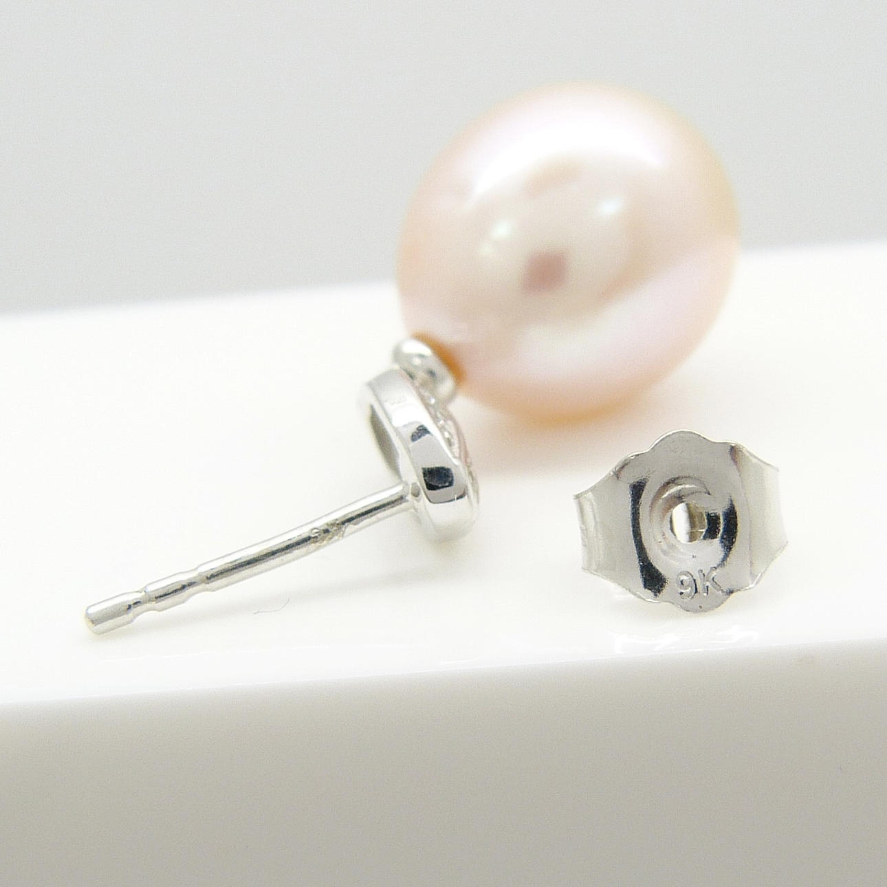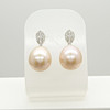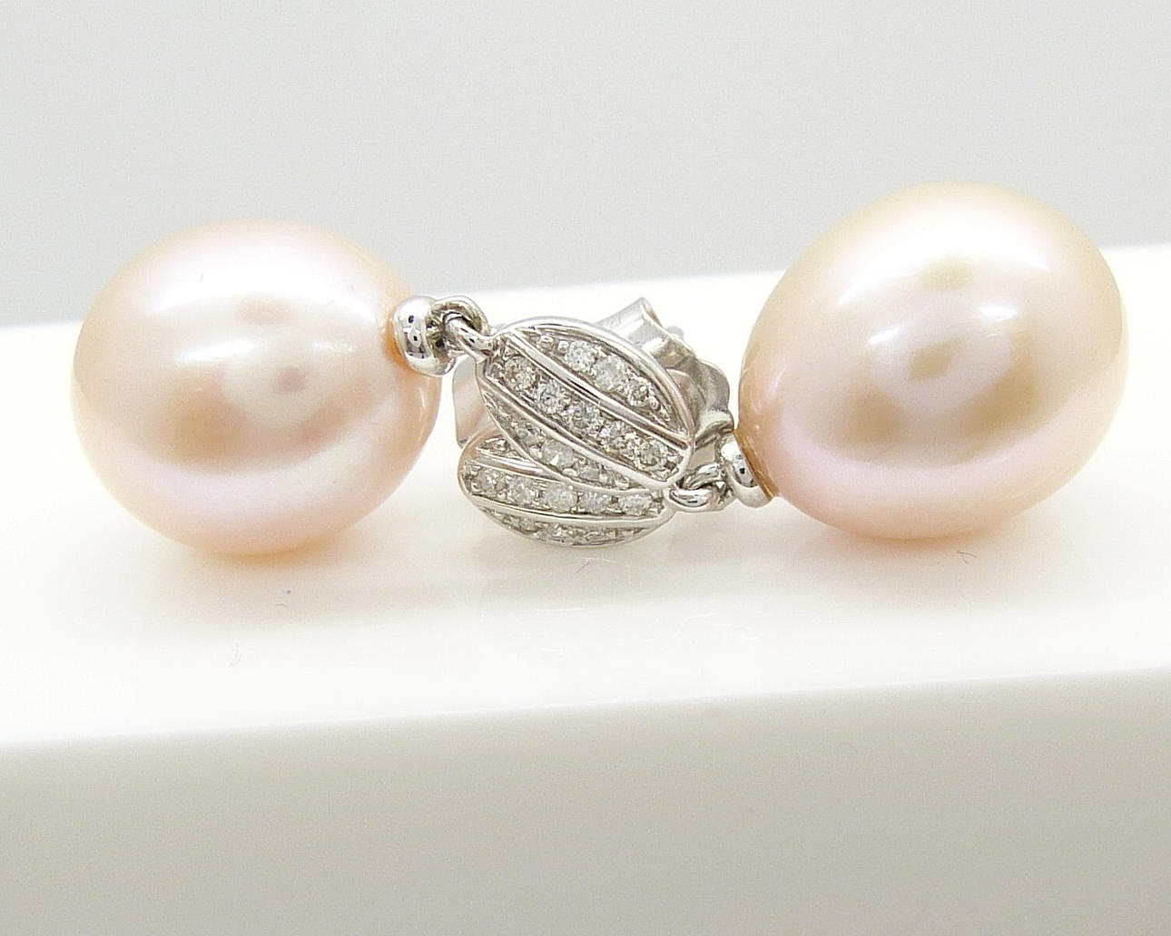 Suspendida en la parte inferior de cada arete de este par hay una perla cultivada en forma de pera de color melocotón/rosa de 11 x 10 mm aprox.