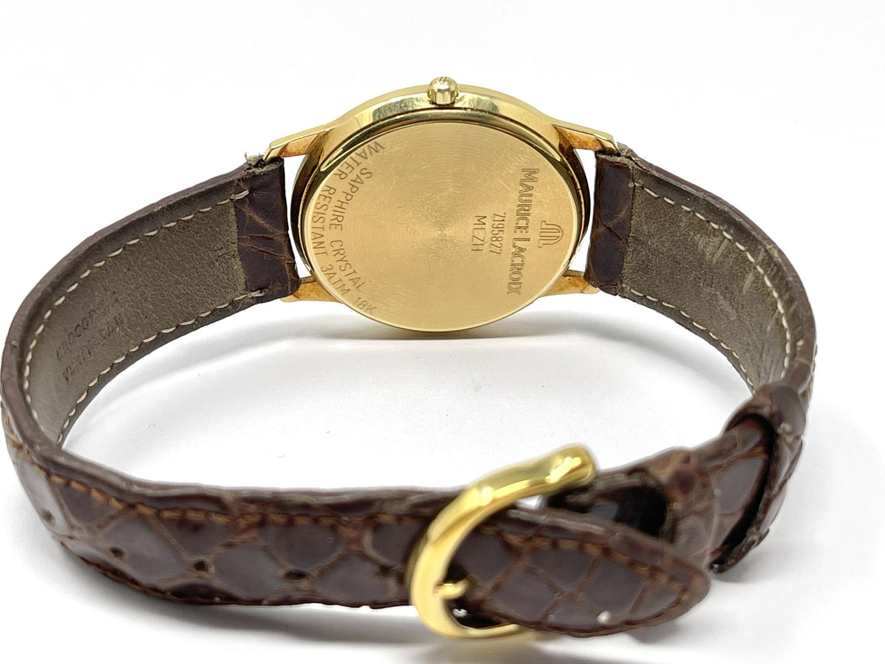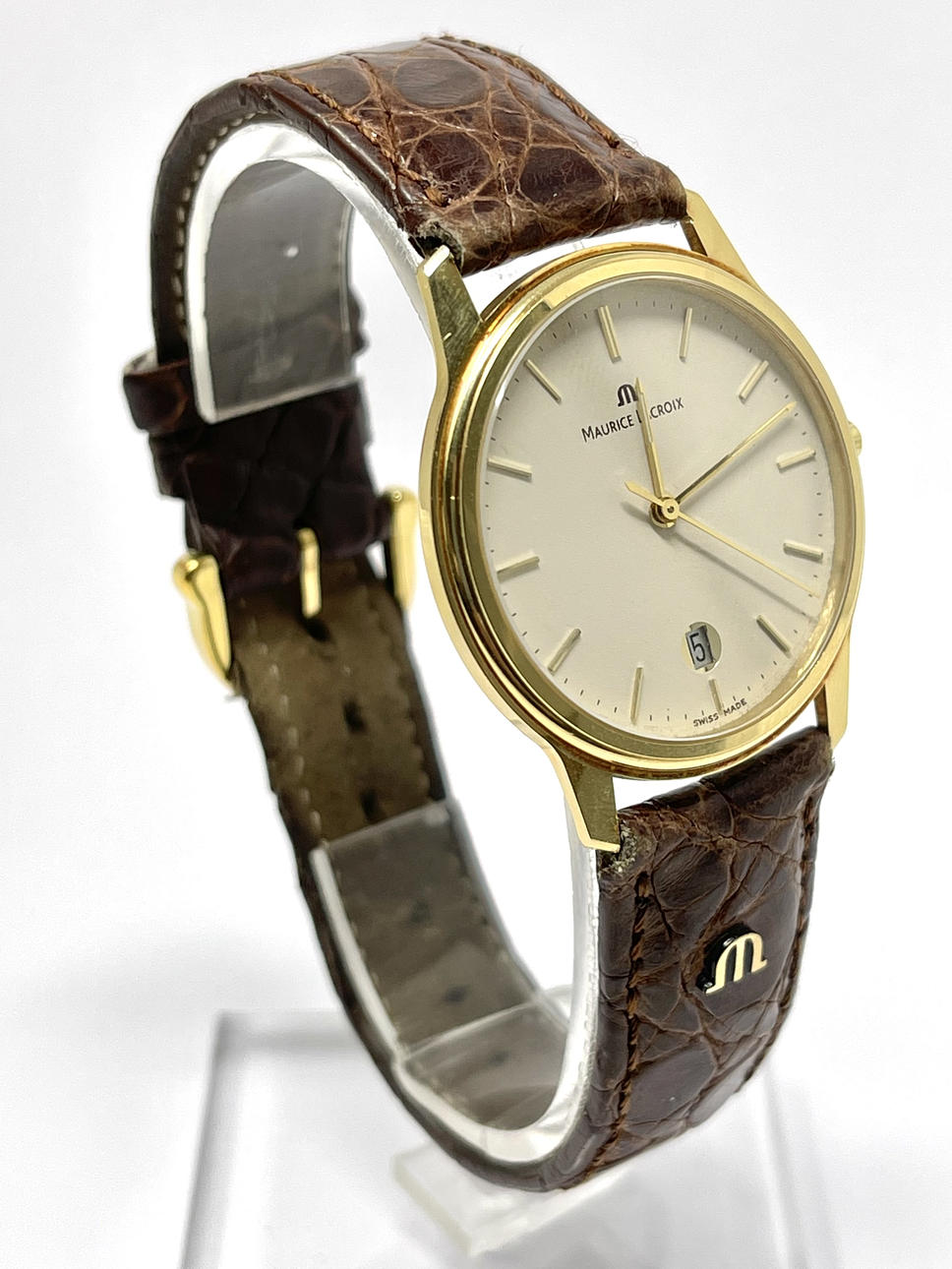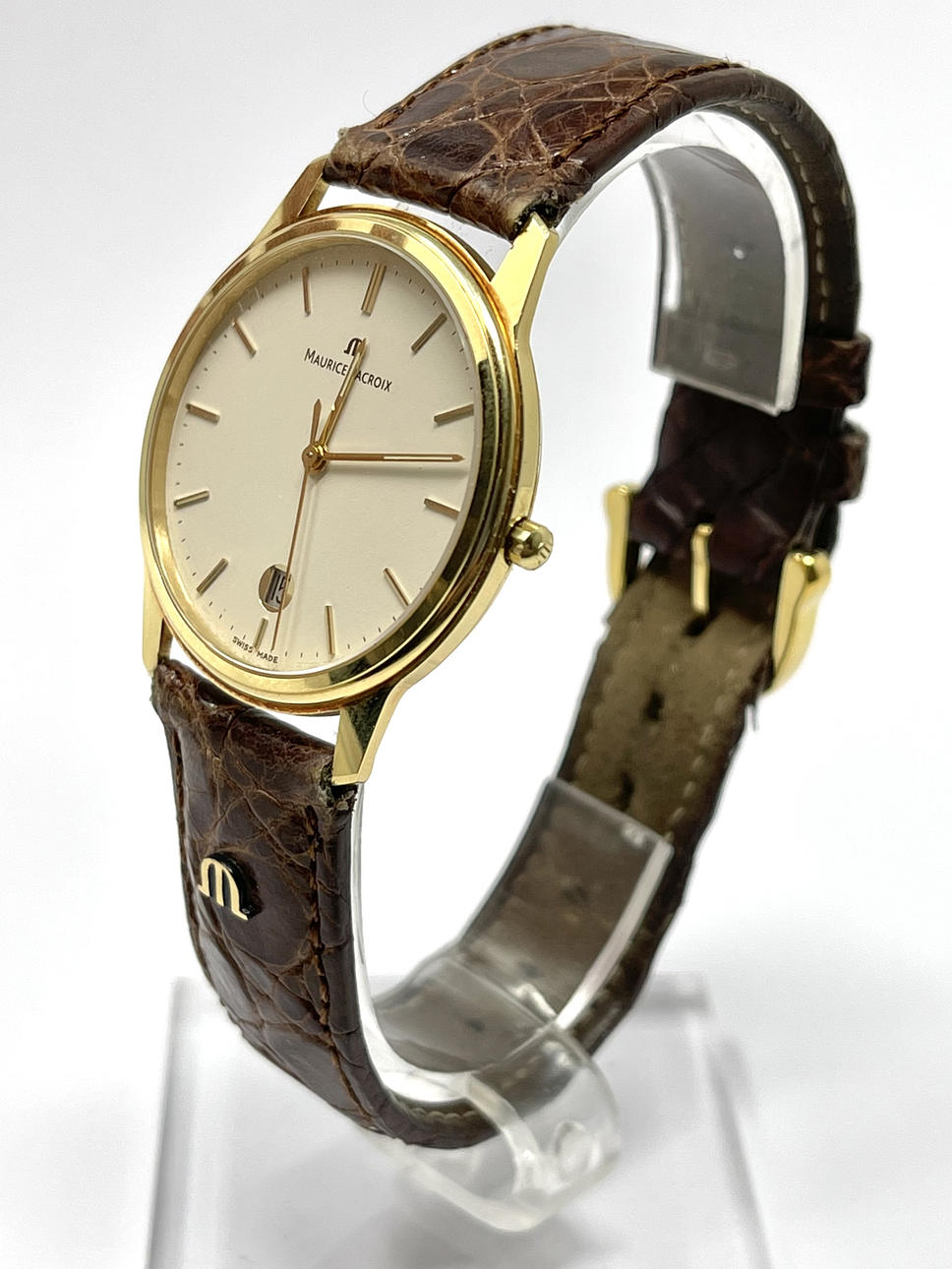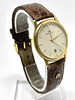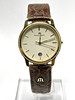 Caja de oro 18k con 34mm de diámetro. Esfera blanco porcelana con calendario a las seis. Movimiento de cuarzo. Correa de cuero original con cierre de hebilla.