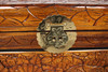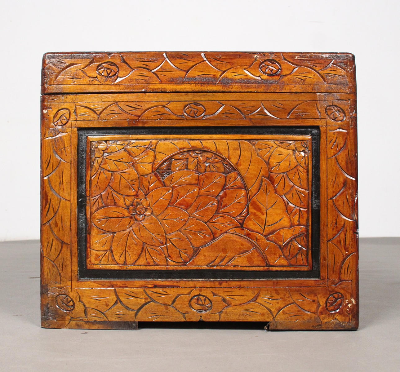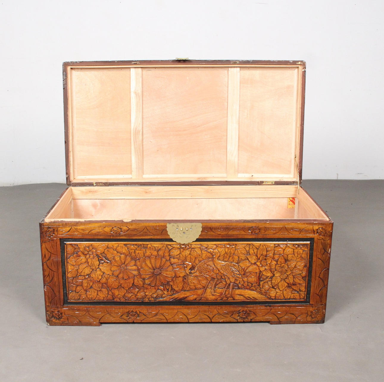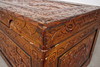 Arcón chino, fabricado en madera, tallado a mano, el cuerpo decorado con decoración floral, dimensiones aprox.: Al. 46 cm, An. 100 cm, Pr. 52 cm.