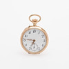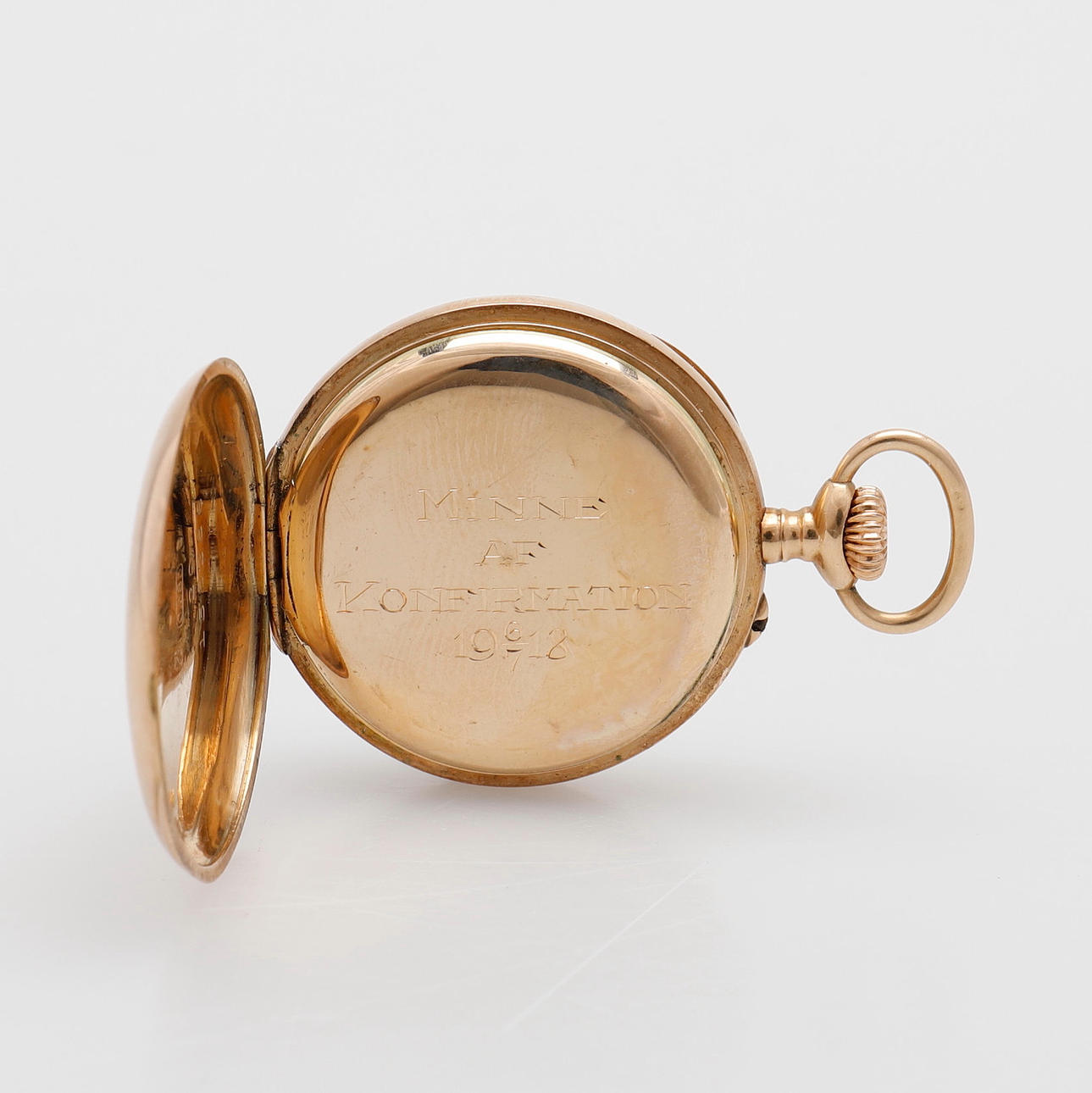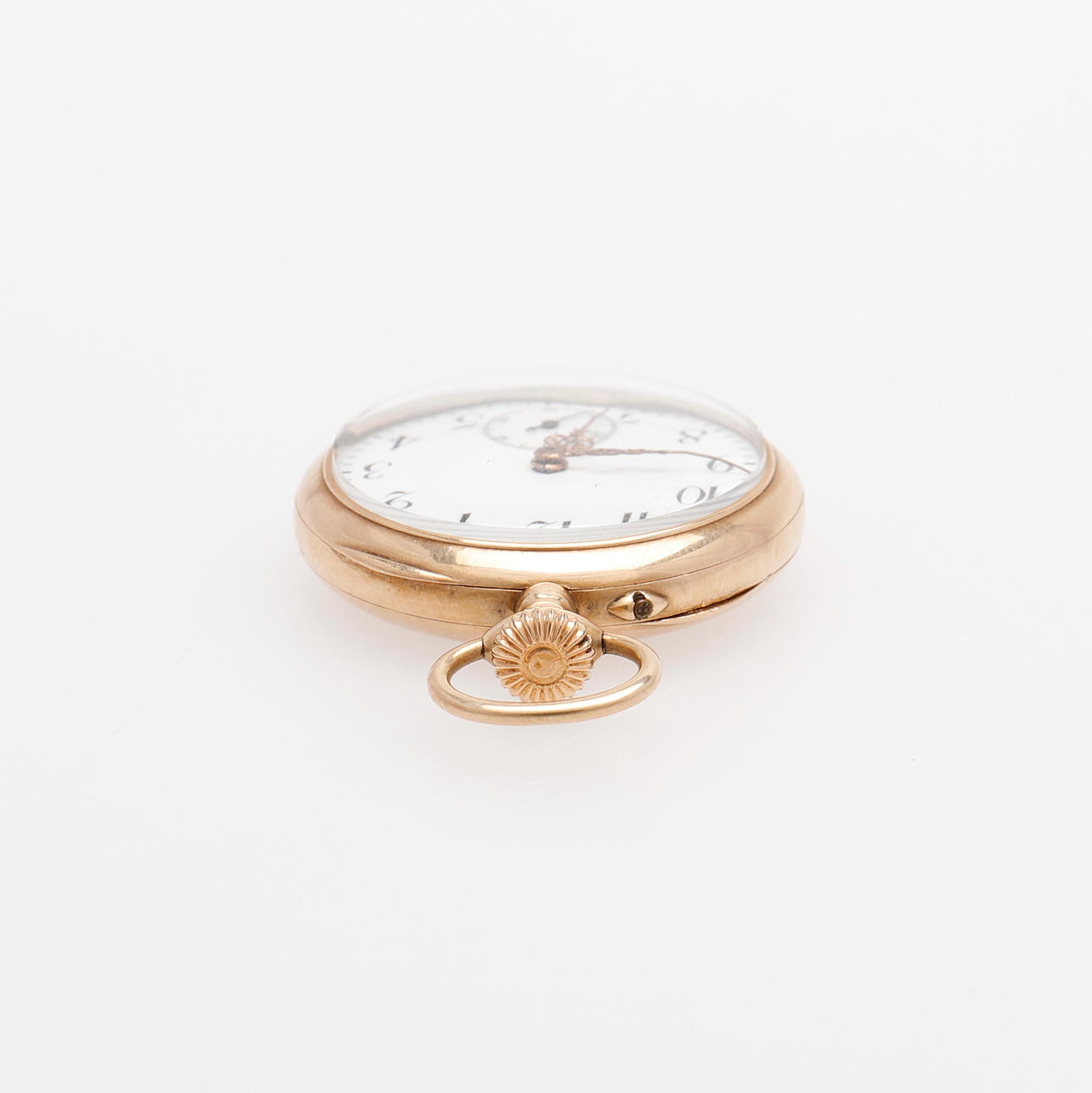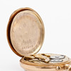 Oro de 14k, con tapa interior de oro de 14k, con corona de misión, esfera de esmalte blanco con segundero separado, década de 1910, diámetro aproximado de 3 cm, peso 23,7 gramos.