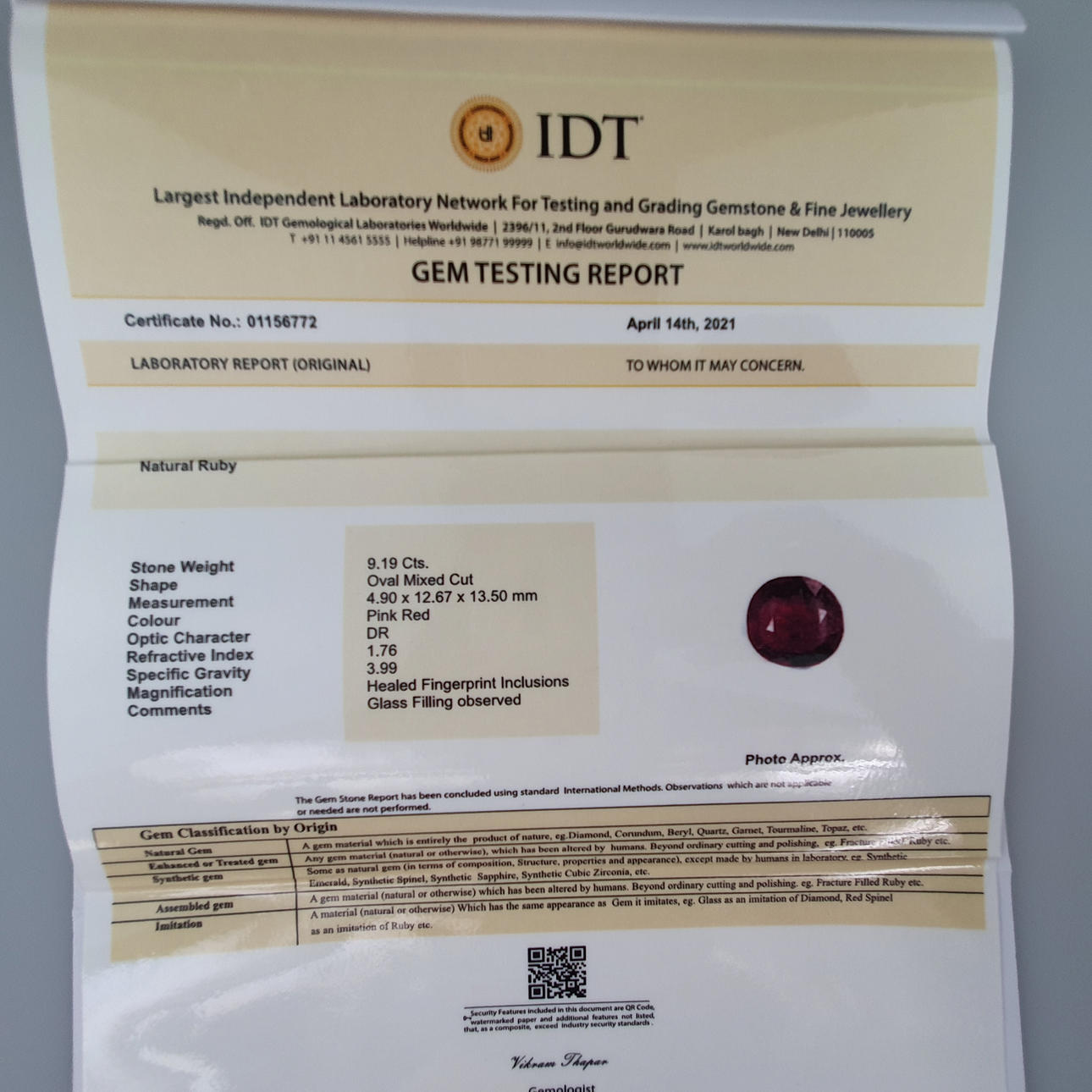 Certificado IDT de gema de rubí de 9,19 quilates.
