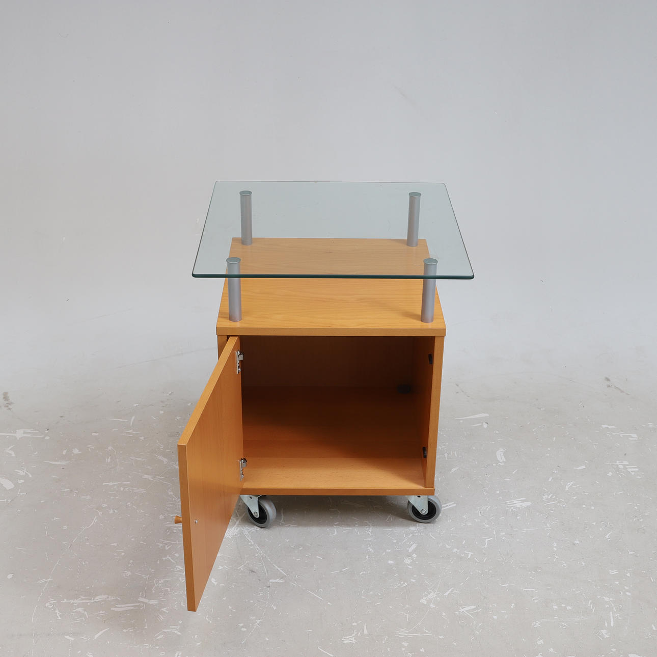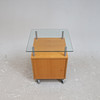 Mesa sobre ruedas con tapa de cristal. Altura aproximada de 63 cm, superficie de la mesa de aproximadamente 53 x 53 cm.
