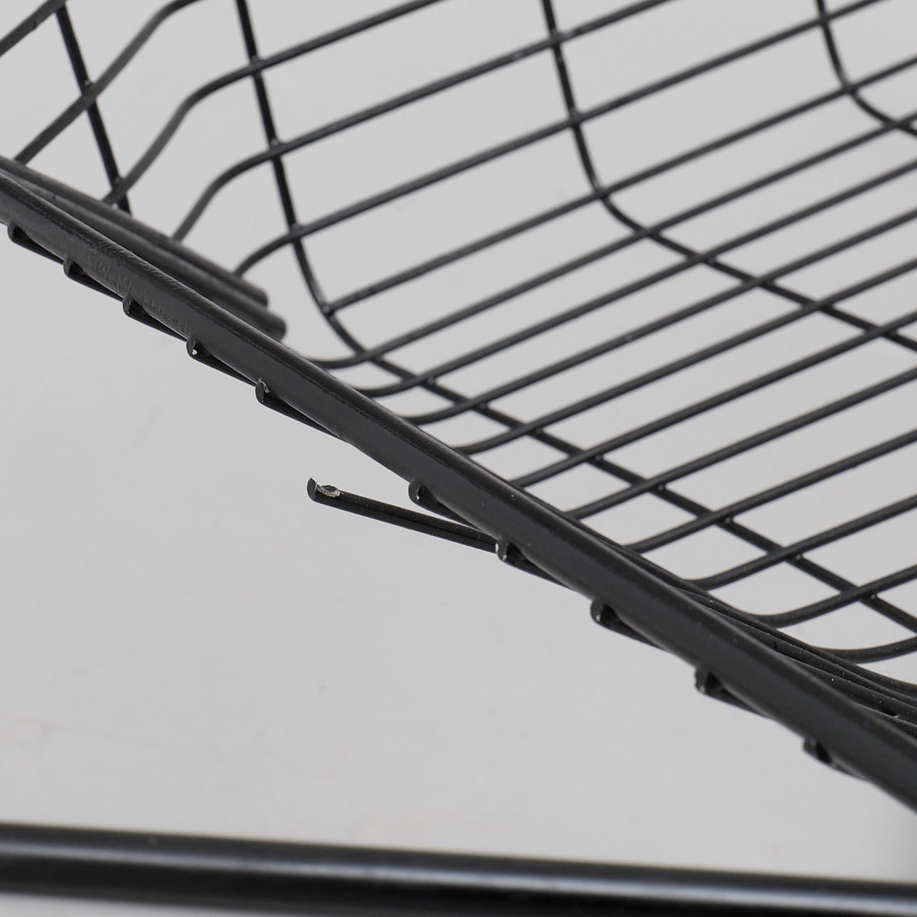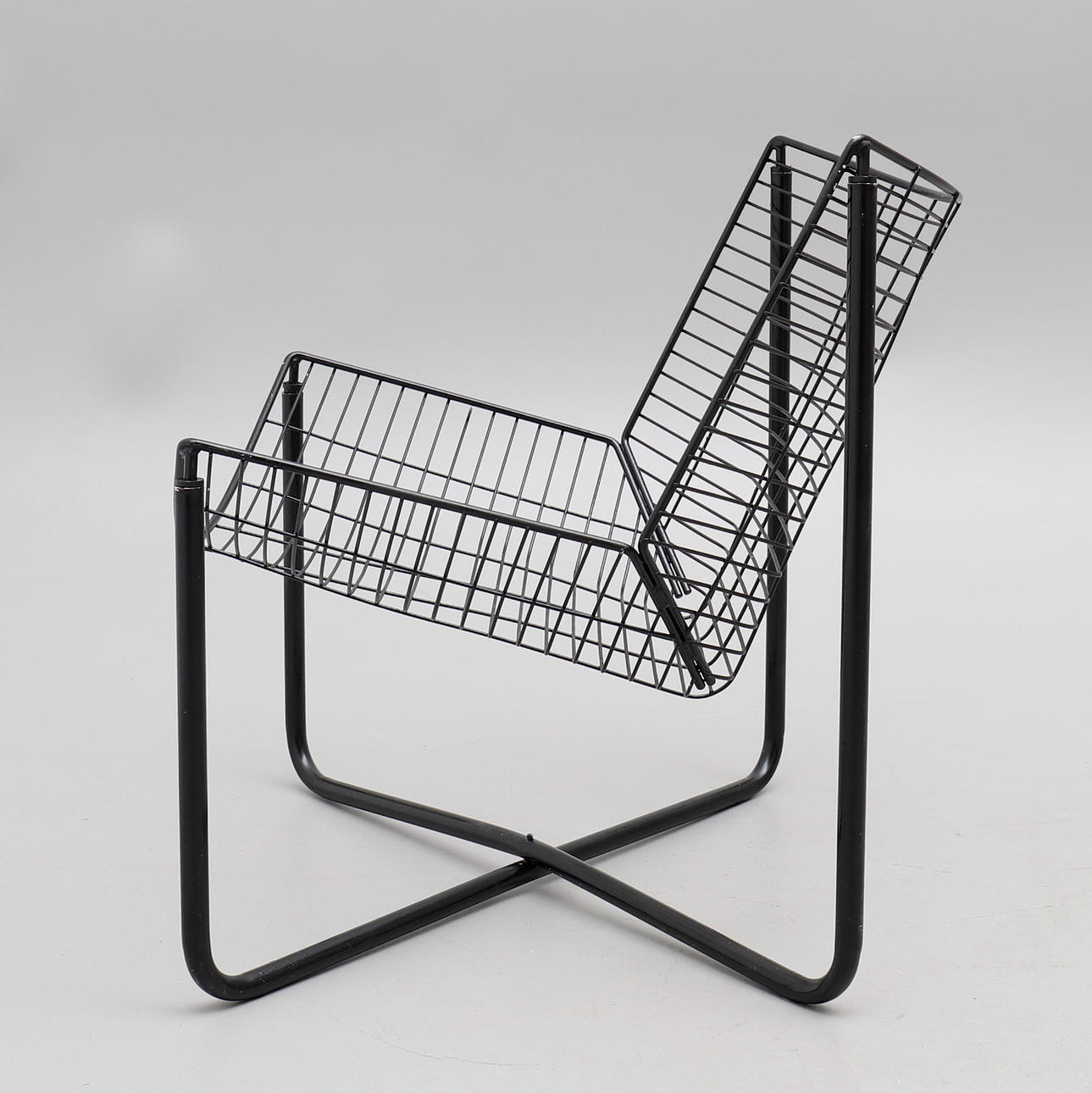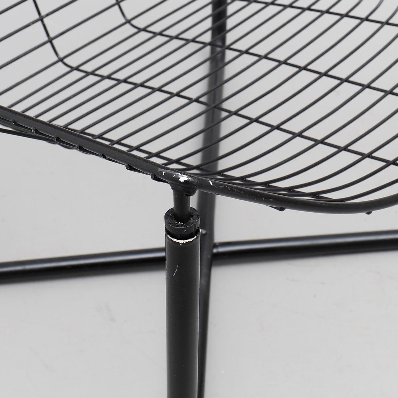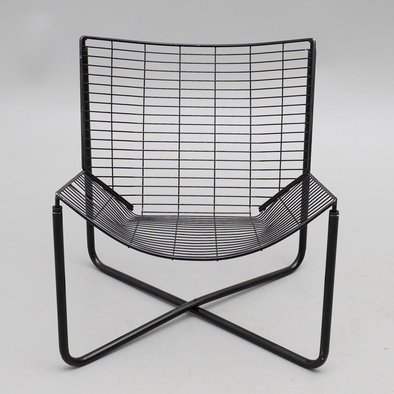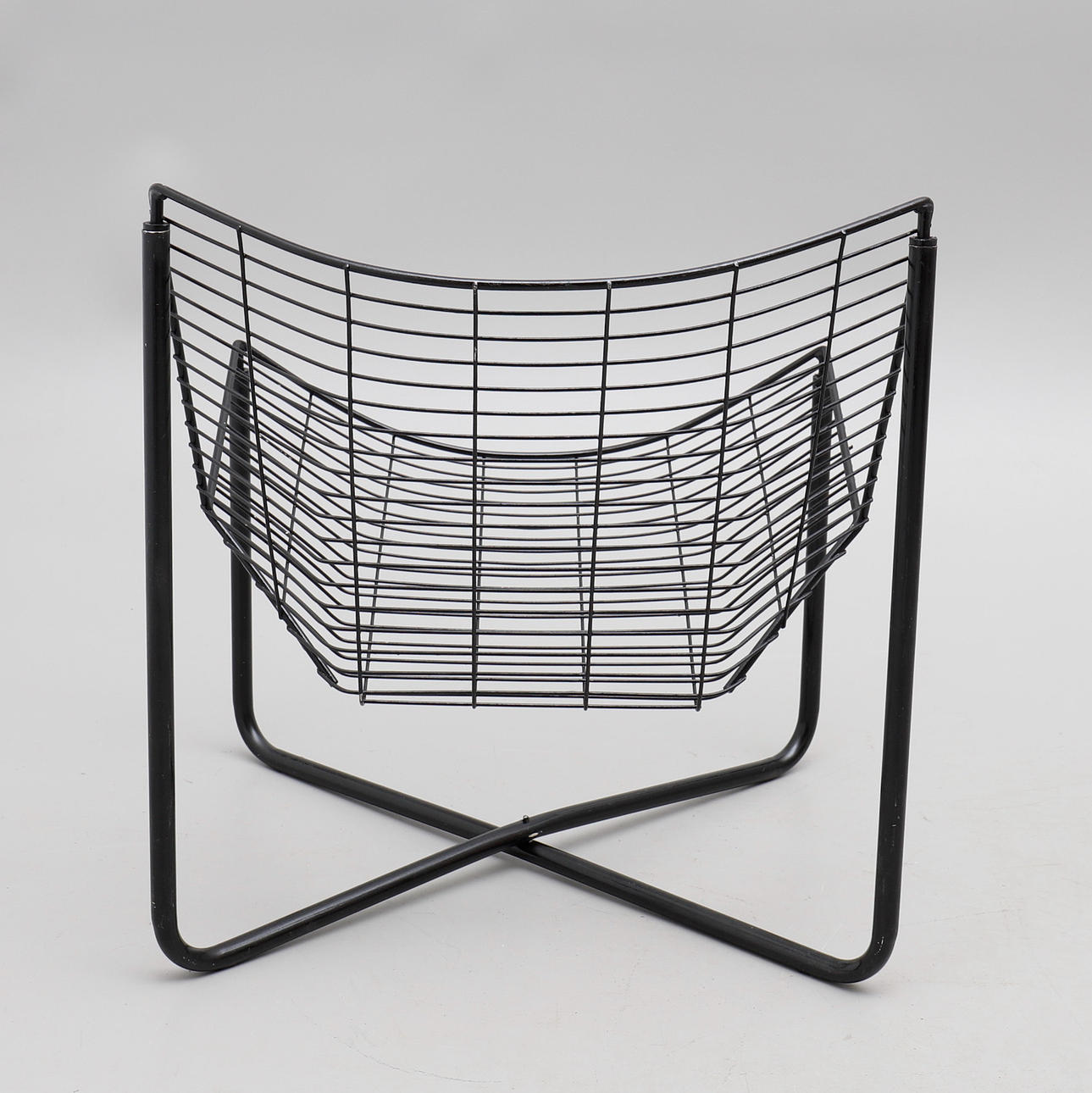 Malla metálica lacada en negro. Altura del asiento en el centro de la parte delantera aproximadamente 34 cm, altura total 71 cm.