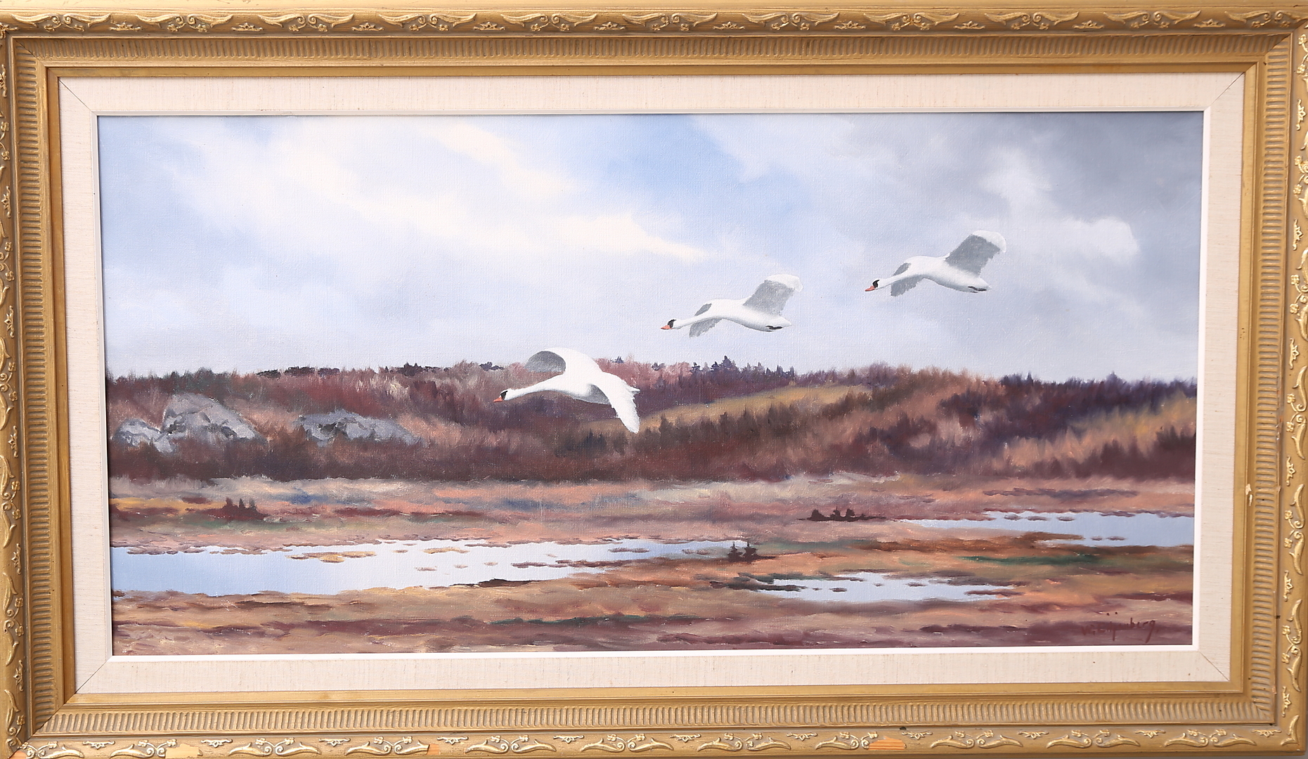 178696. W.LILJENBERG. hule, Tres cisnes aterrizando.