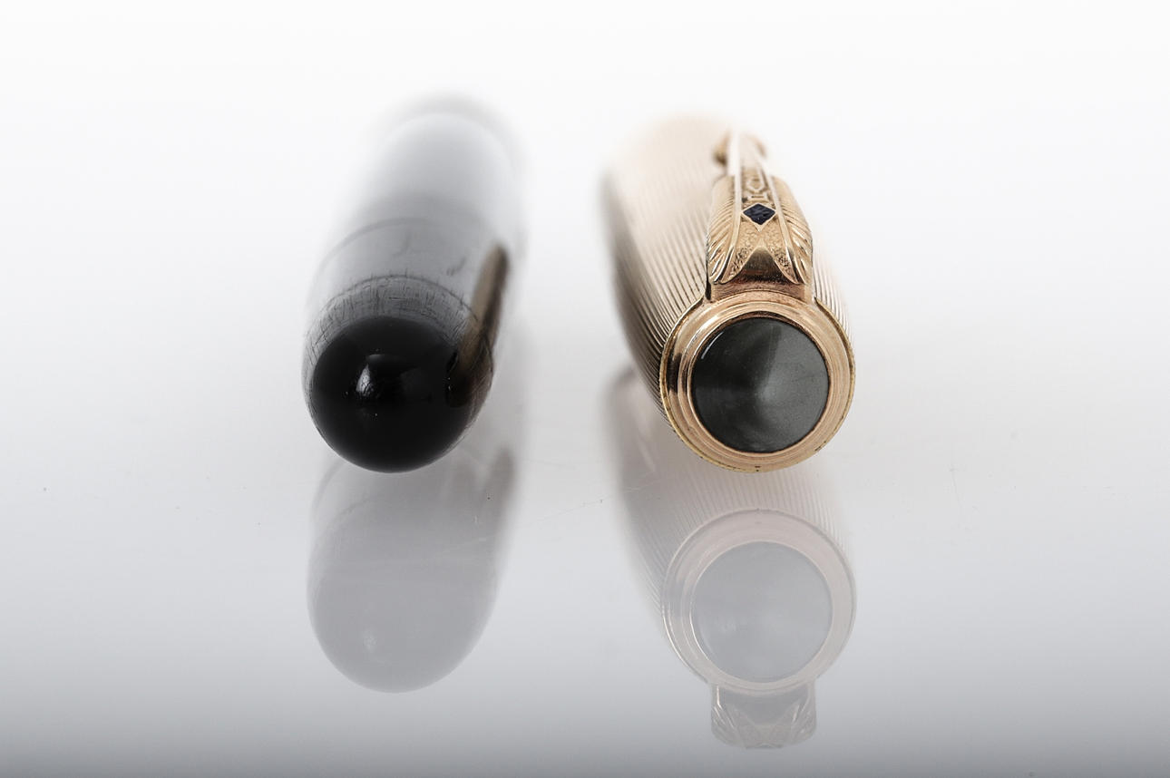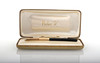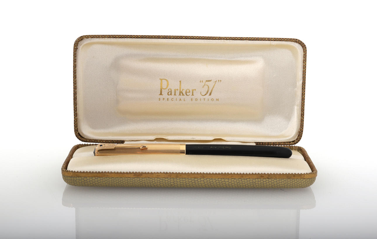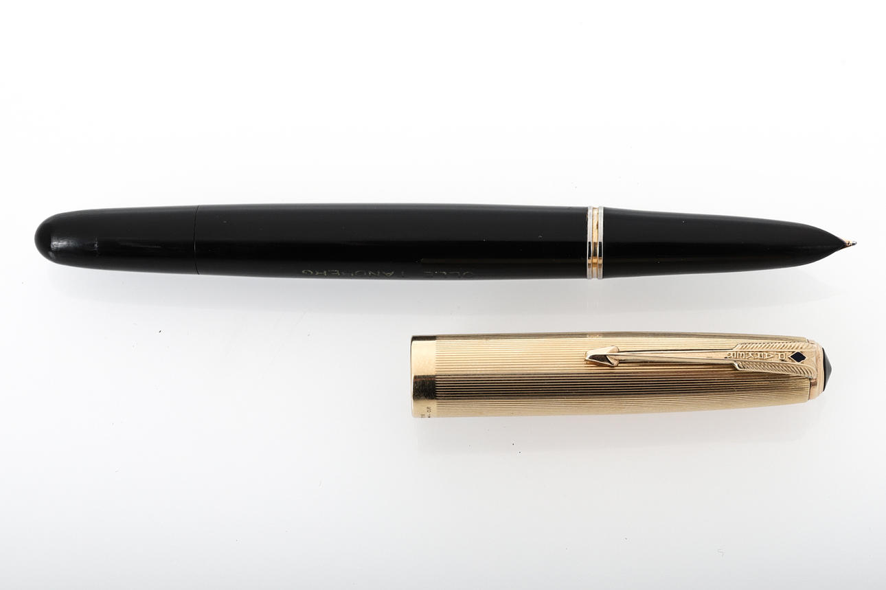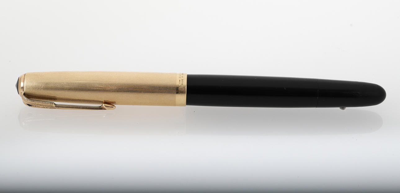 Pluma estilográfica Parker 51 Vacumatic, años 40/50, estuche negro, capuchón dorado rayado, plumín dorado en original, longitud aproximada 135 mm, estuche con interior original incluido.