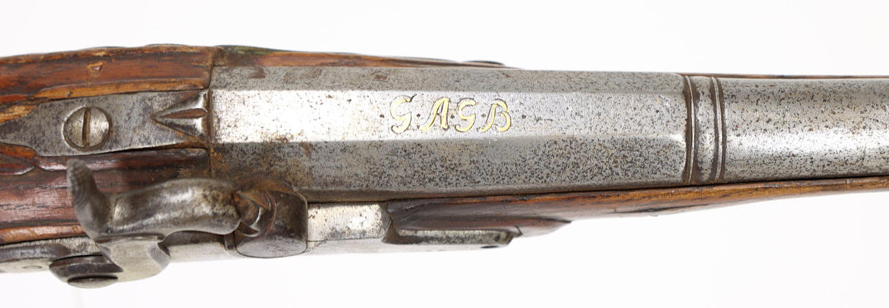 Longitud del cañón 25,5 cm. Pieza de cámara octogonal, cambiada de cerradura de pedernal, culata de madera con herrajes de latón, culata de madera. Barril marcado GAGB.