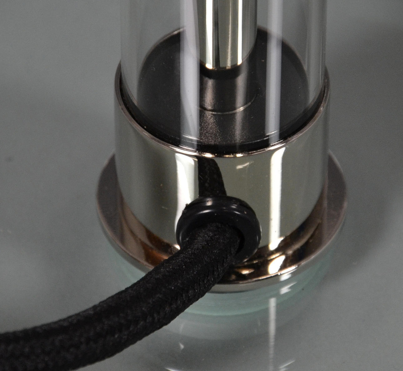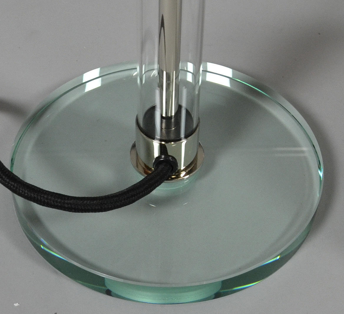 Metal pulido/níquel en la pantalla de cristal opal, base de cristal transparente.