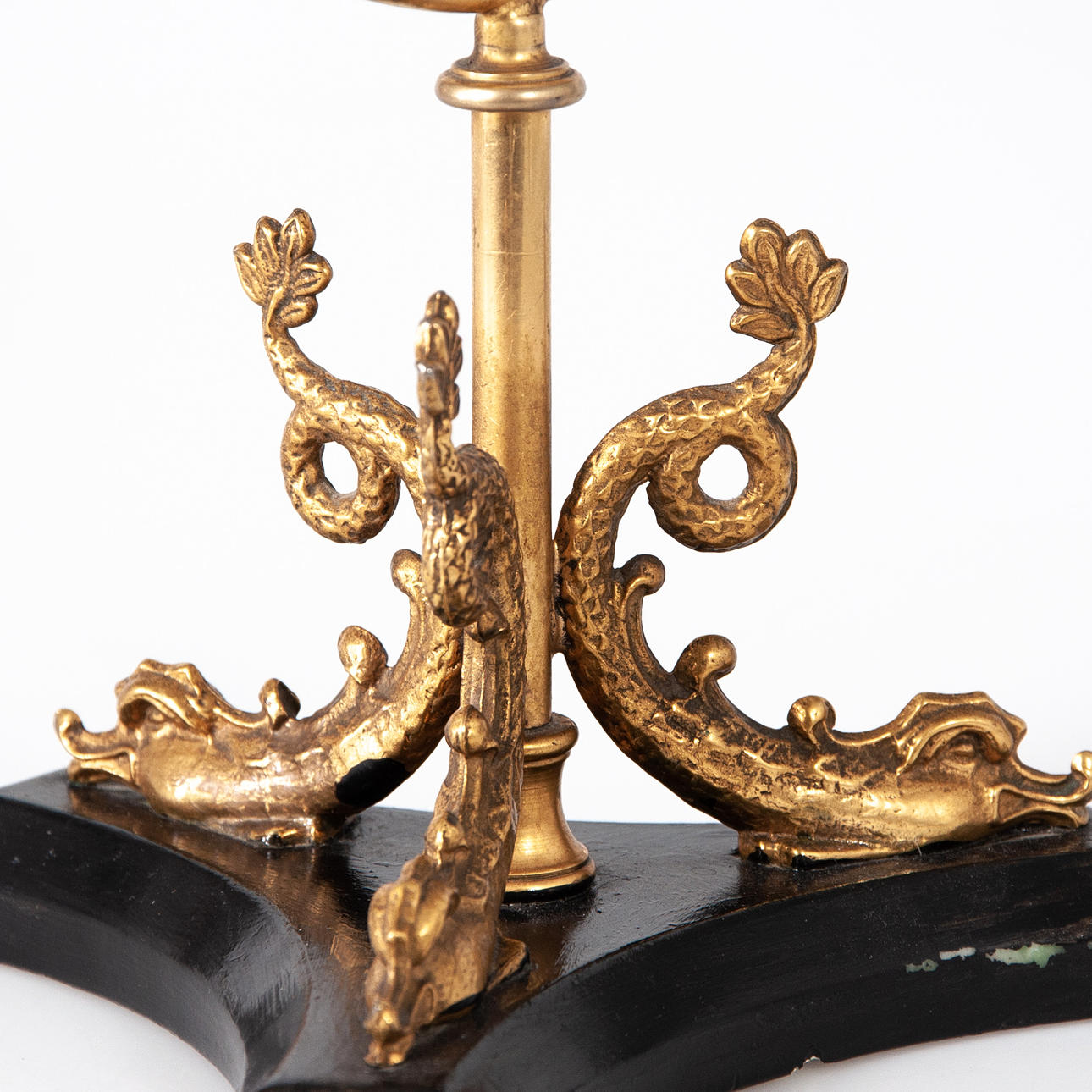 Alto 29 cm Decoración en forma de tres dragones sobre peana de madera pintada de negro.