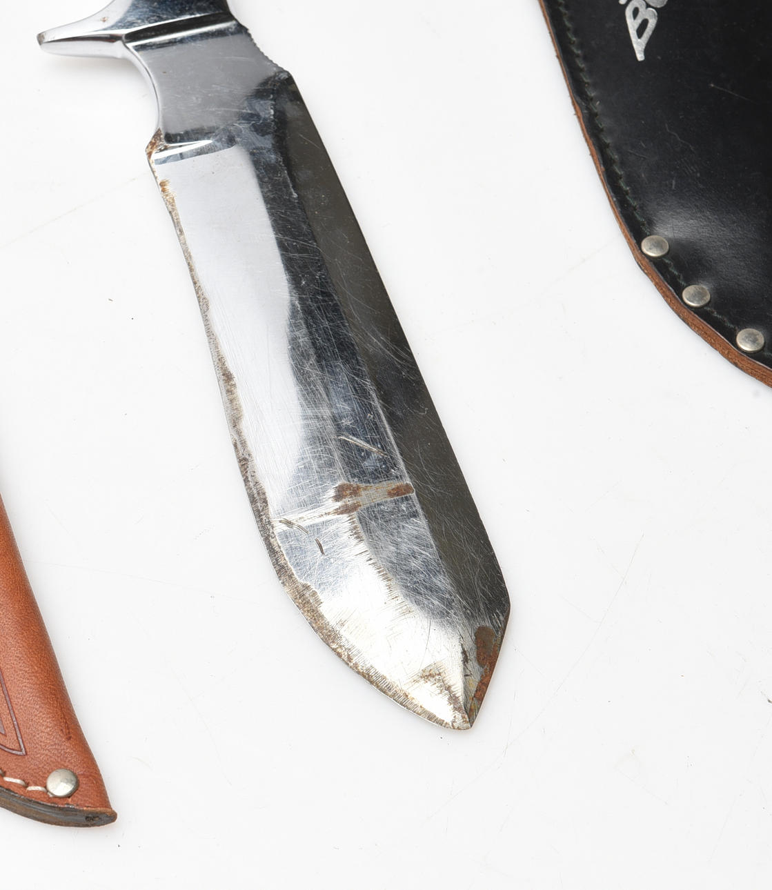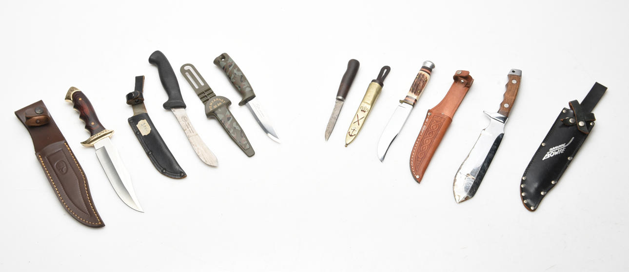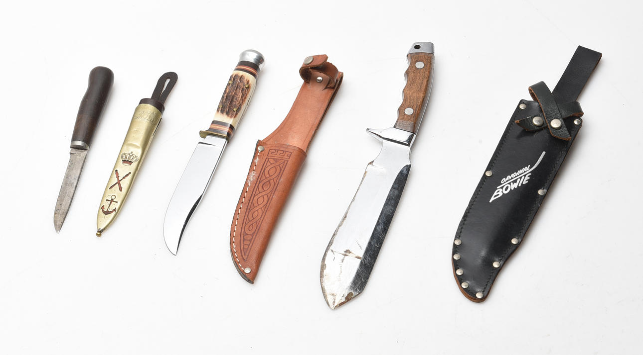 Entre otras cosas, Bowie grande, cuchillo carnicero Frost, Home Guard 50 años, cuchillo Eskilstun para barquero alto. Largo total aproximado 18-30 cm.