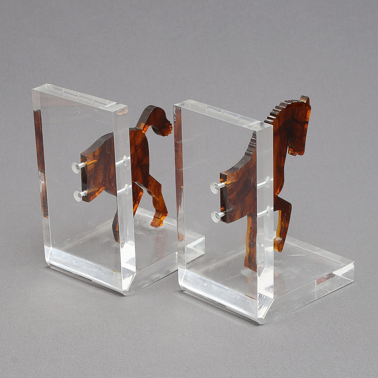 1842048. SOPORTE PARA LIBROS, 1 par, en forma de caballo, plexiglás.