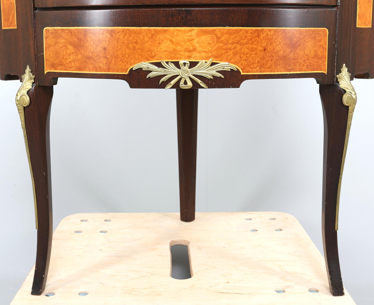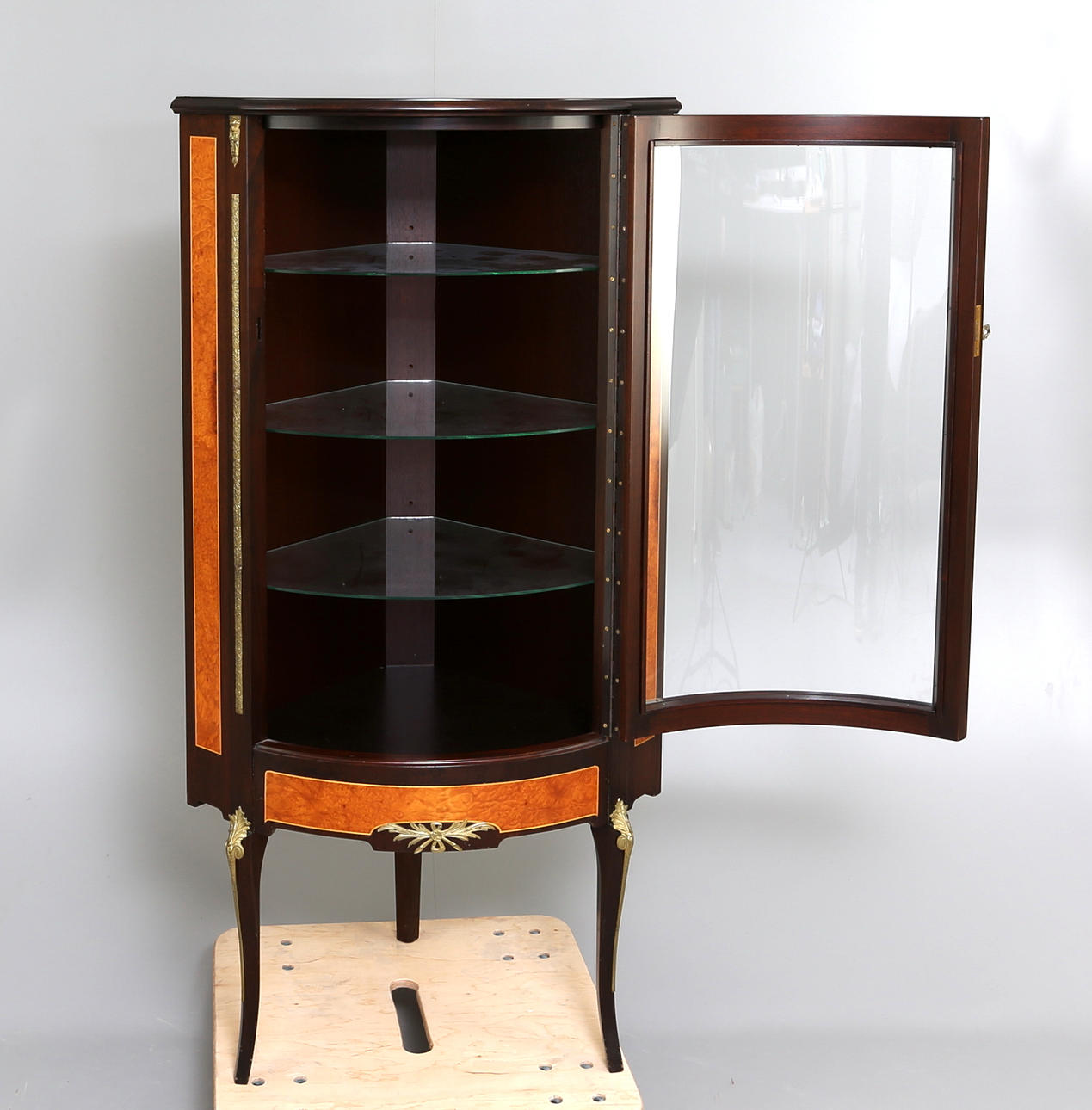 4 estantes, tres de los cuales son de cristal. Marquetería enchapada. Decorado con herrajes de latón. Ancho 70 cm, altura 140 cm, profundidad 52 cm. Llave disponible.