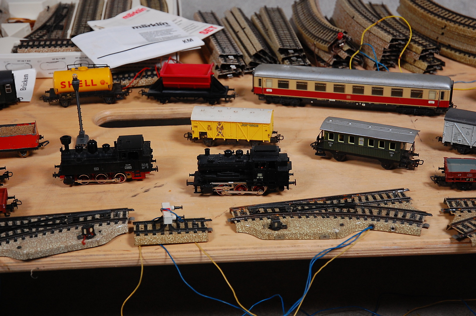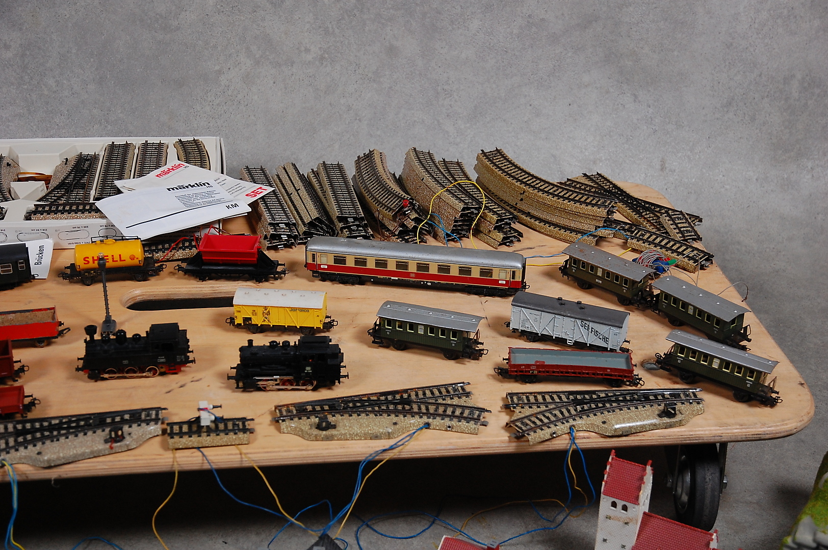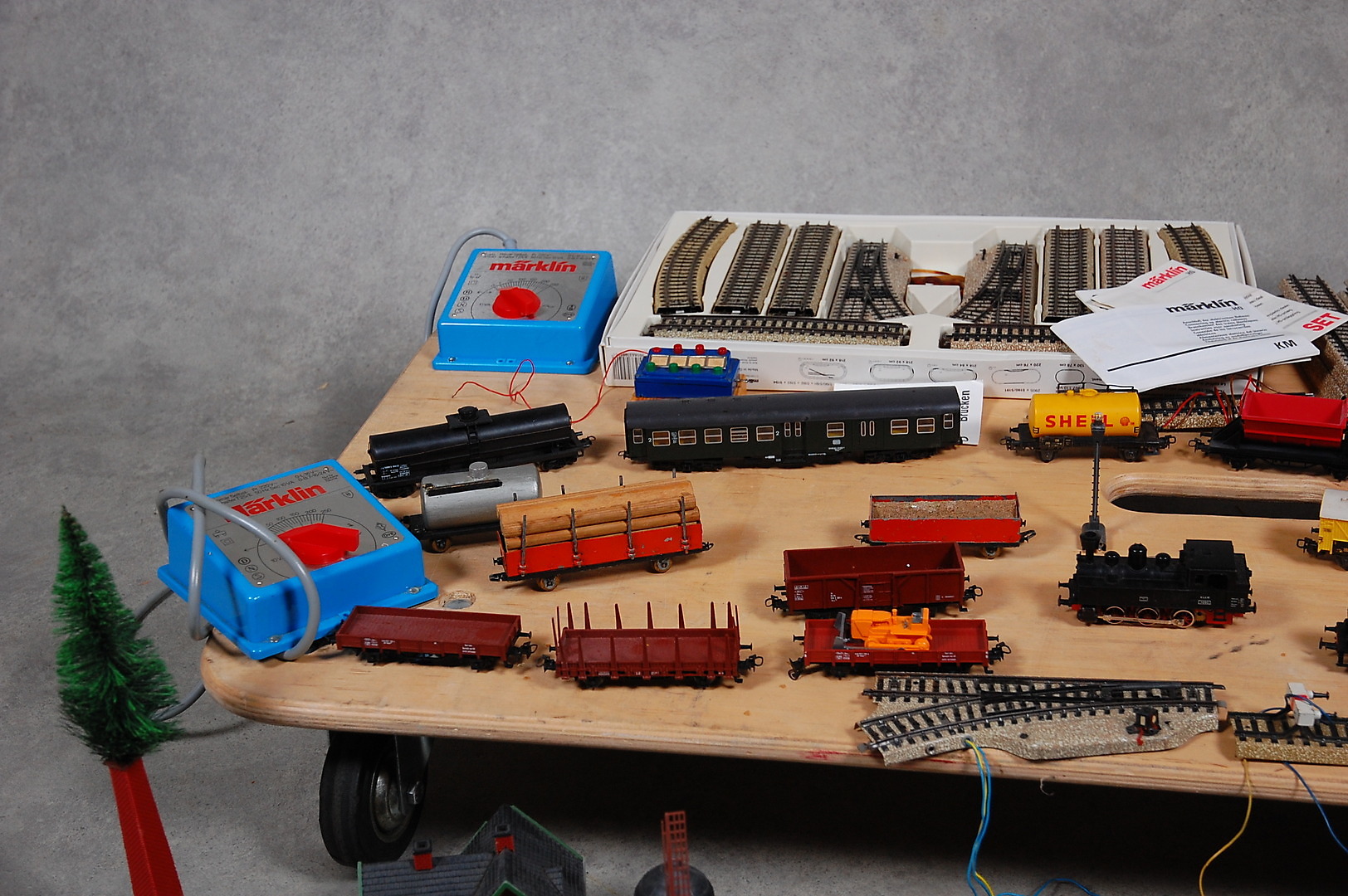 184604. MODELO DE TREN, Märklin, tren, locomotora, rieles, edificios, transformador.