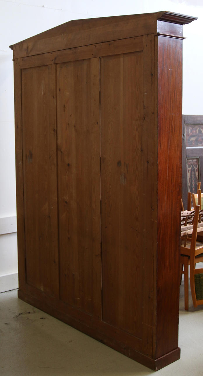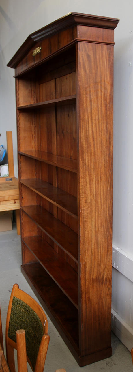 Librería con 5 estantes. Cresta con adorno dorado bruñido. Largo 150, ancho 28,5, alto 217 cm.