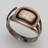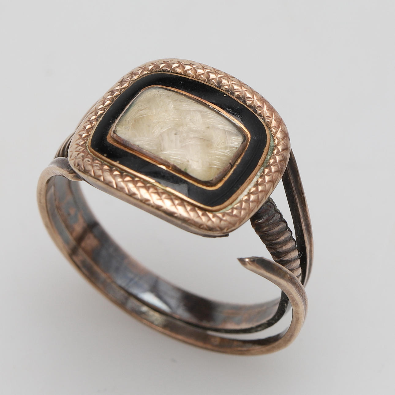 con panel de cabello tejido central, con marco de esmalte negro y borde sombreado, vástago de lengüeta de hombro dividido, sin marcar pero las pruebas de ácido indican oro de 9 quilates, tamaño del anillo P 3,9 g peso bruto total.