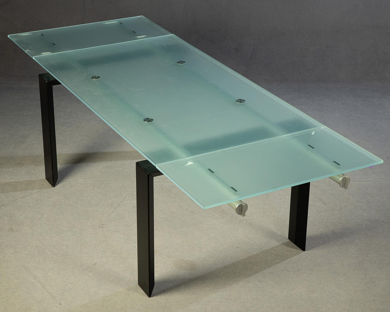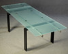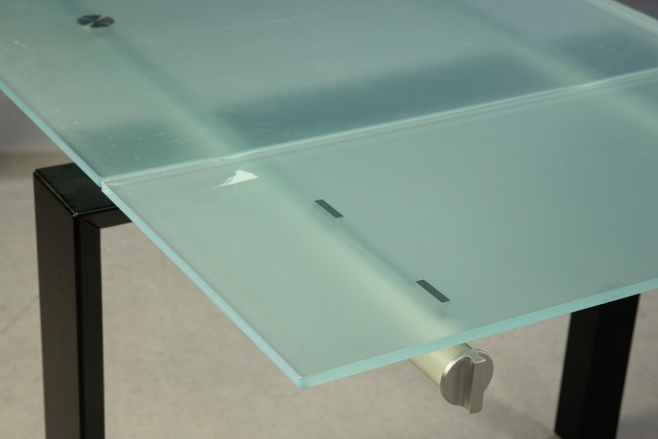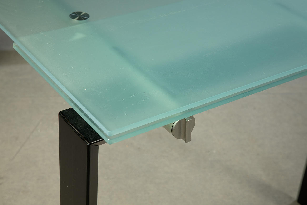Diseño: Decoma Design, Italia, años 90. Patas de metal pintado de negro y tubo de acero. Lateral con dos extensiones extraíbles. Tablero de mesa de vidrio esmerilado. Al x An x Pr: 74x155-239x90 cm.