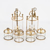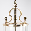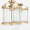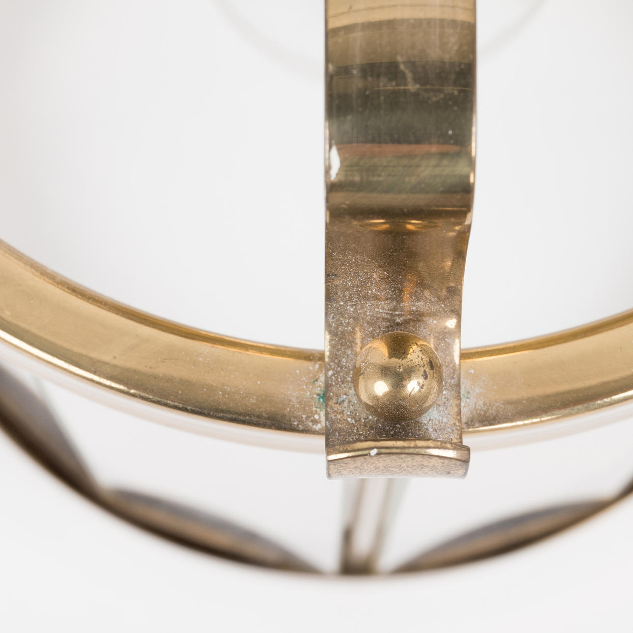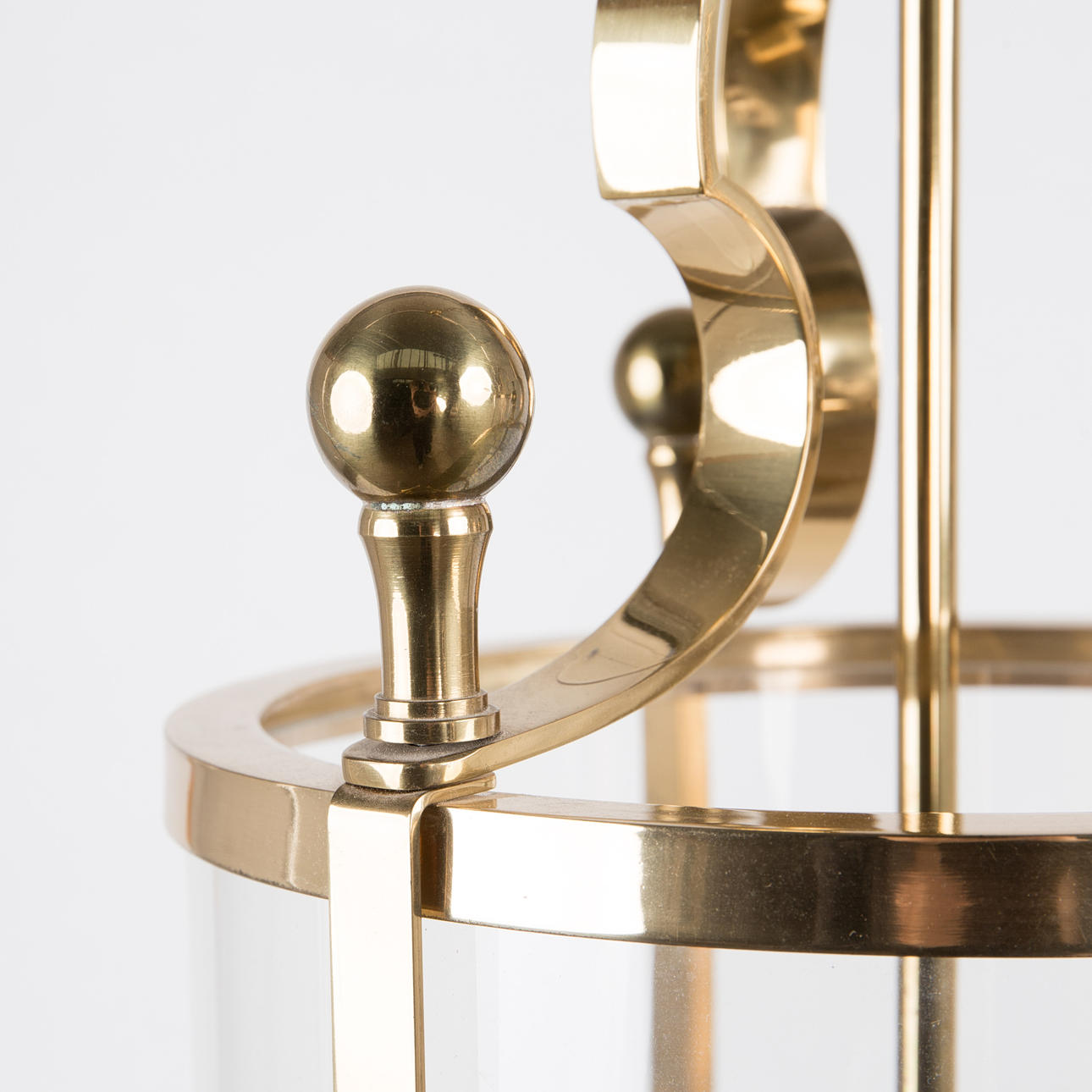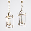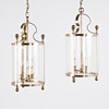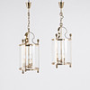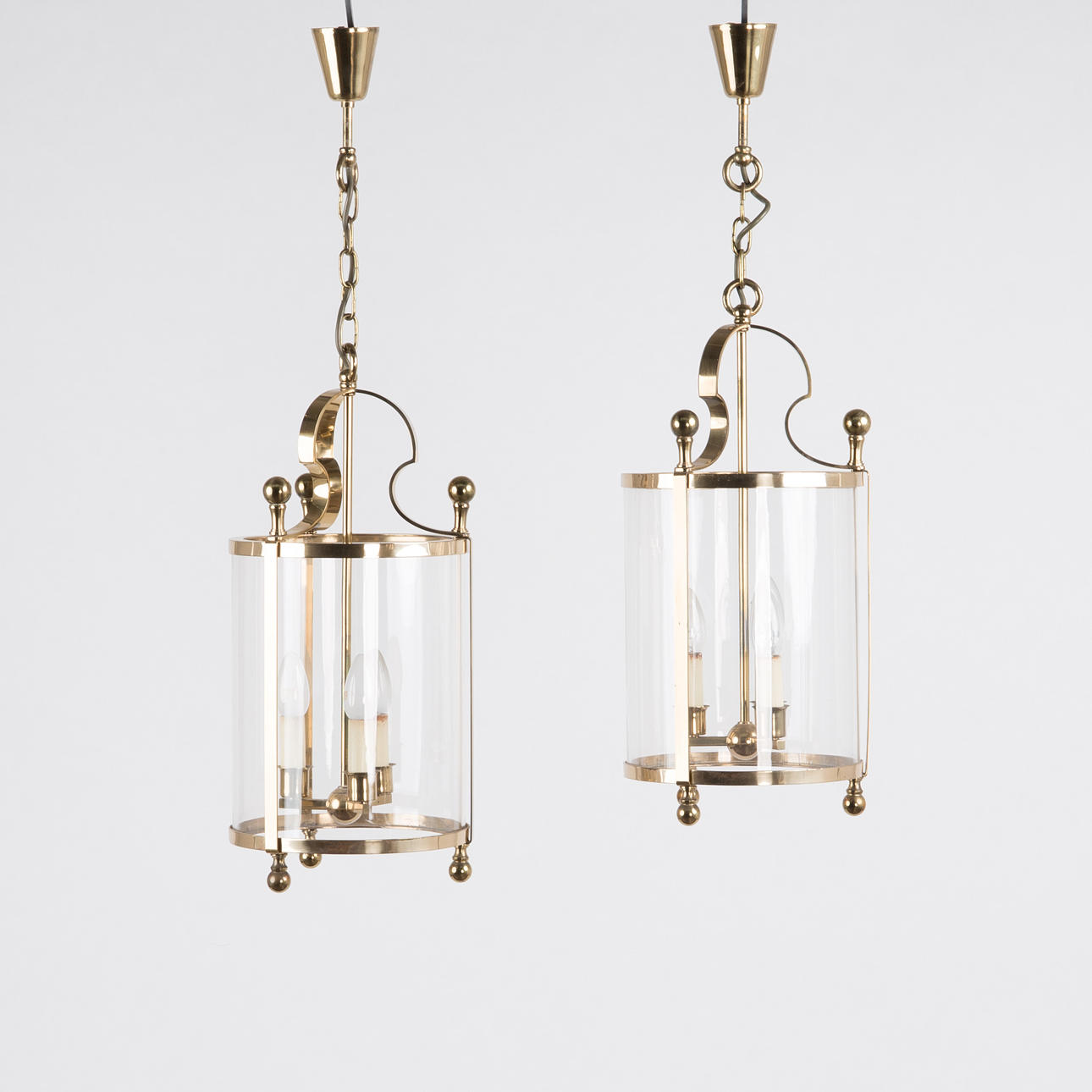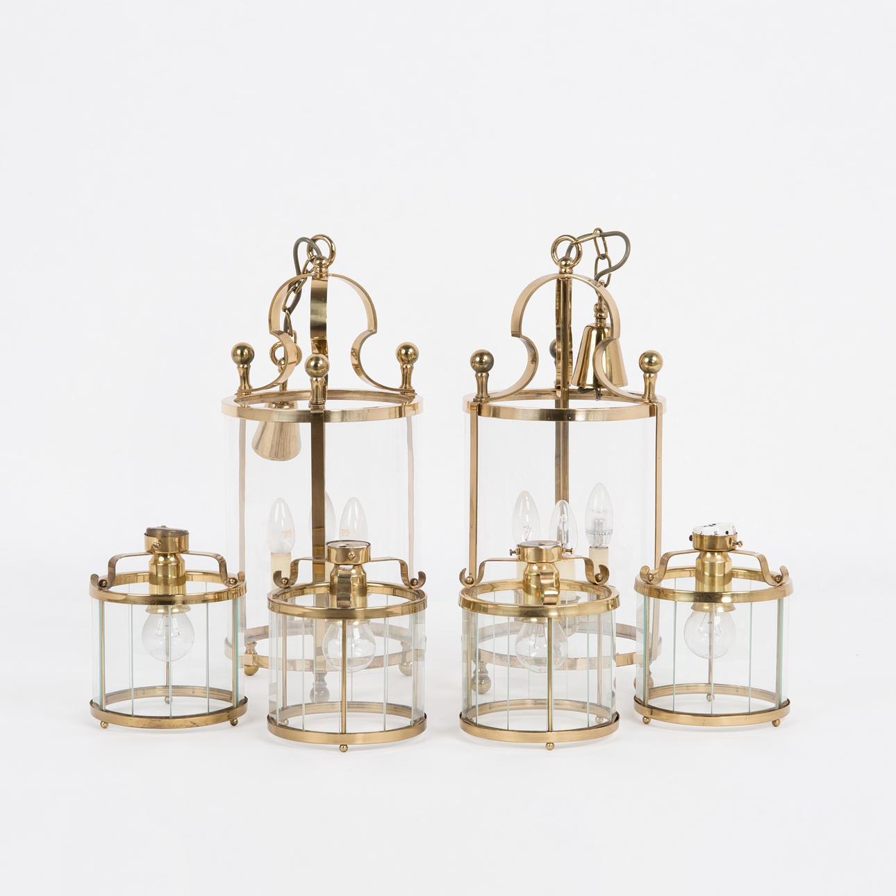 Seis plafones/lámparas, latón, cristal. Convolute que consta de dos grandes lámparas de techo en forma de farol con cuerpo redondo y tres lámparas cada una con conchas de vela, H.88cm, D.24cm, y cuatro pequeñas lámparas facetadas dodecagonales, cada una con una lámpara, H.23cm, D.18cm , cada uno hecho de vidrio y un marco de latón. (6).