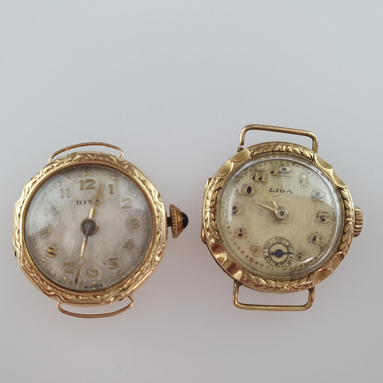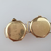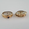 Esfera con números arábigos dorados aplicados, dorado. Agujas, 1 "Liga", tapa interior punzonada con grado y marca de ardilla, nº 24767, segundero pequeño a las 6h, 1 "Rita", tapa punzonada interior con grado y 'JNO', nº 0104516, conjunto de corona con un cabujón azul , DM 21 mm cada uno, sin correas, funcionaba cuando estaba catalogado.