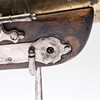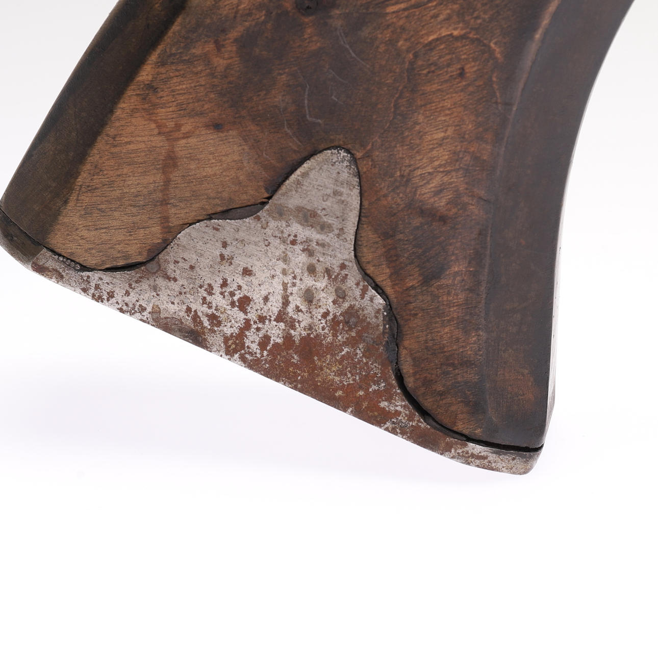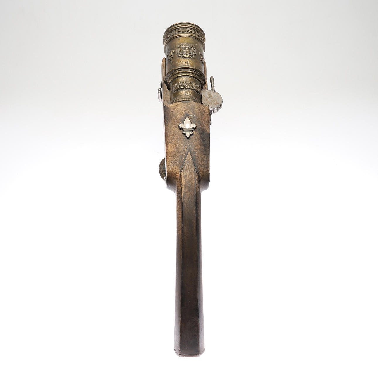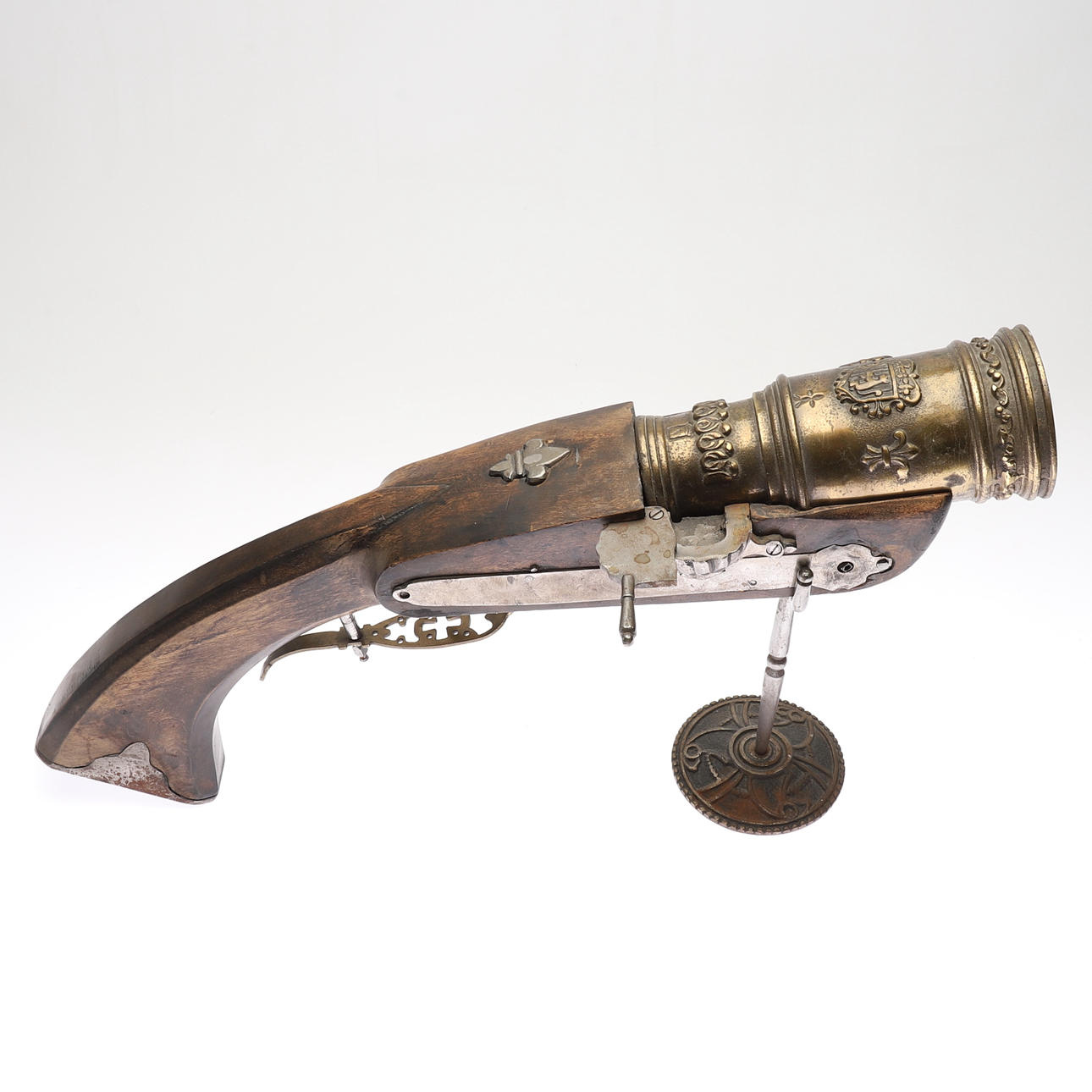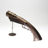 Latón y madera. Con soporte. Longitud aproximada de 59 cm.