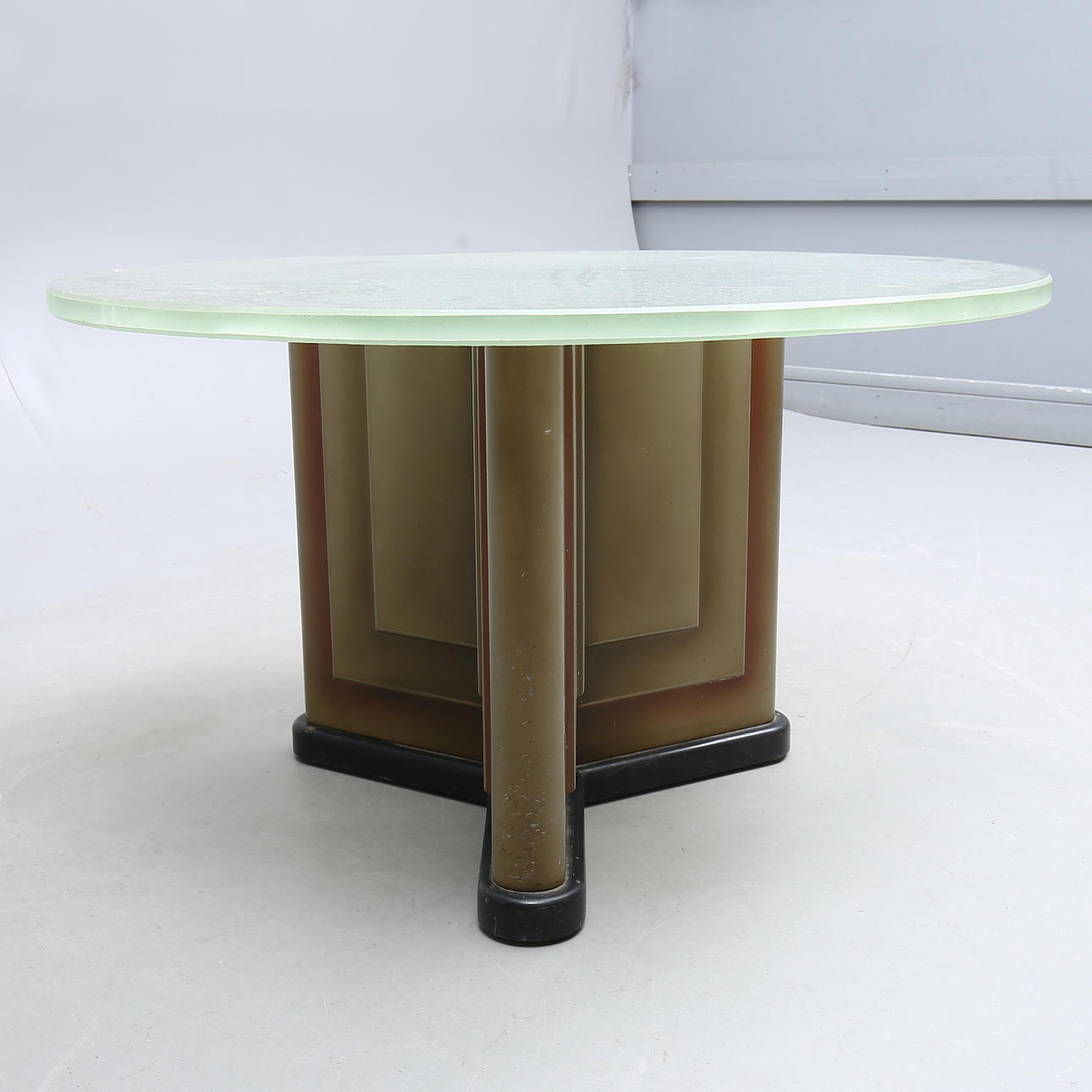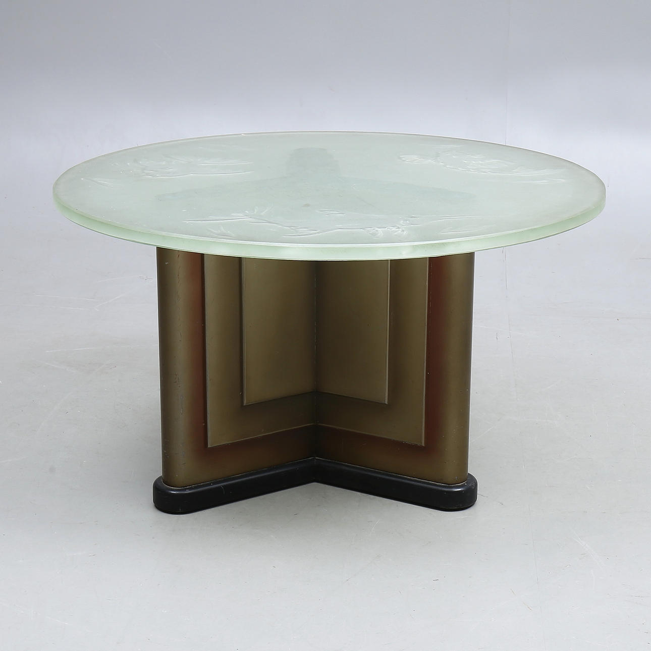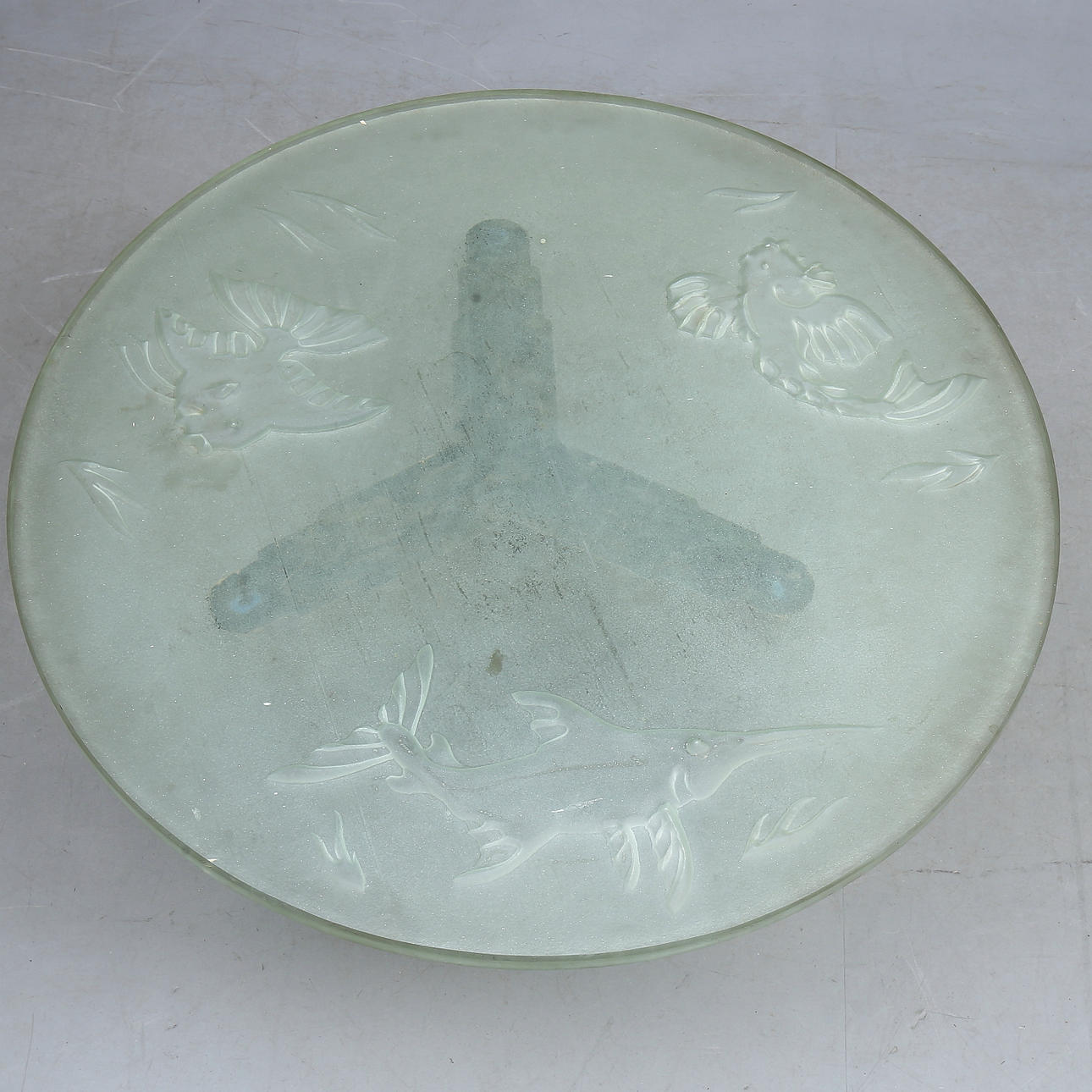 Diámetro aproximado 90 cm, altura aproximado 52 cm. Tapa de cristal con decoración de peces.