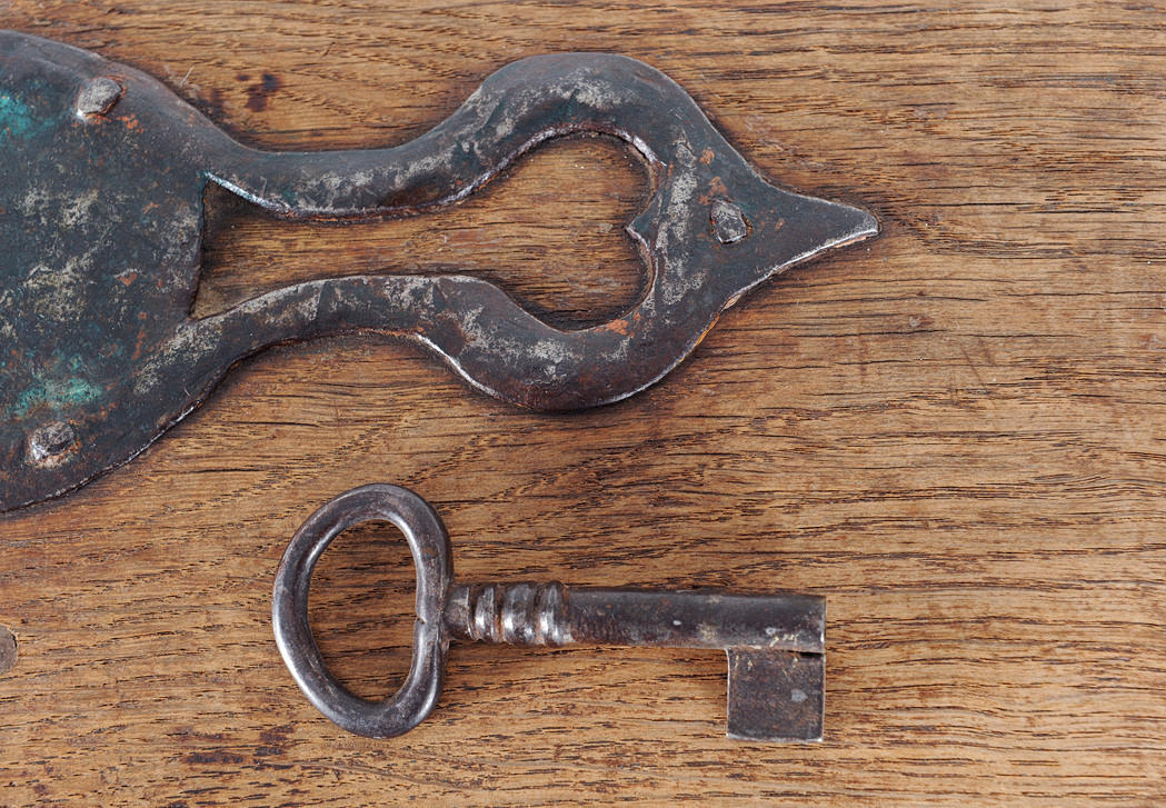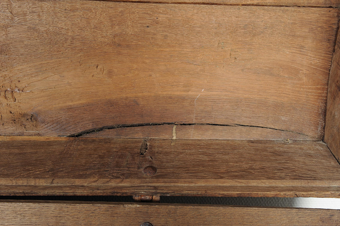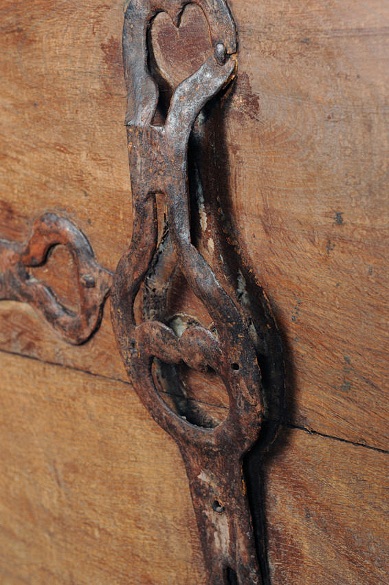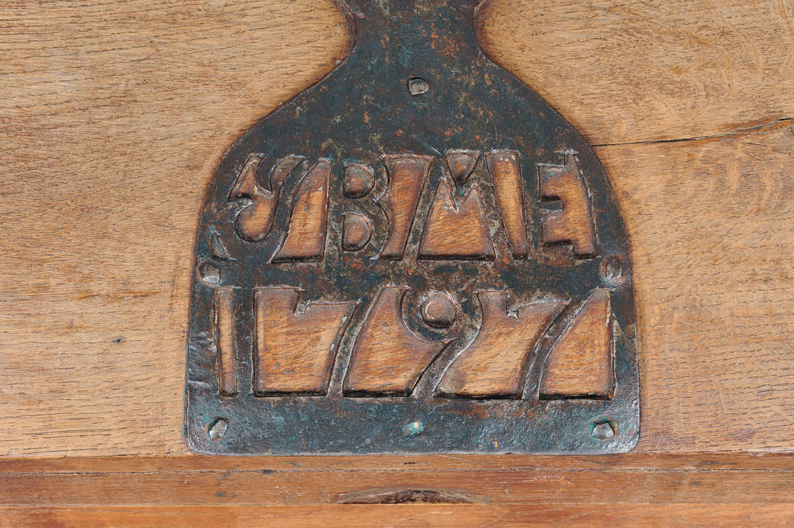 Cuerpo de roble macizo con herrajes decorativos de hierro. Las iniciales "JBME" y el año "1797" en la tapa con bisagras curvas. Altura 73cm. Ancho 137 cm Fondo 62 cm.