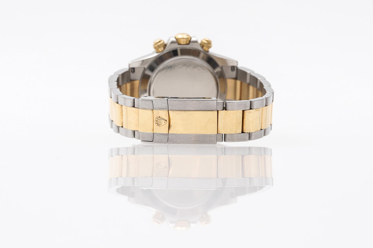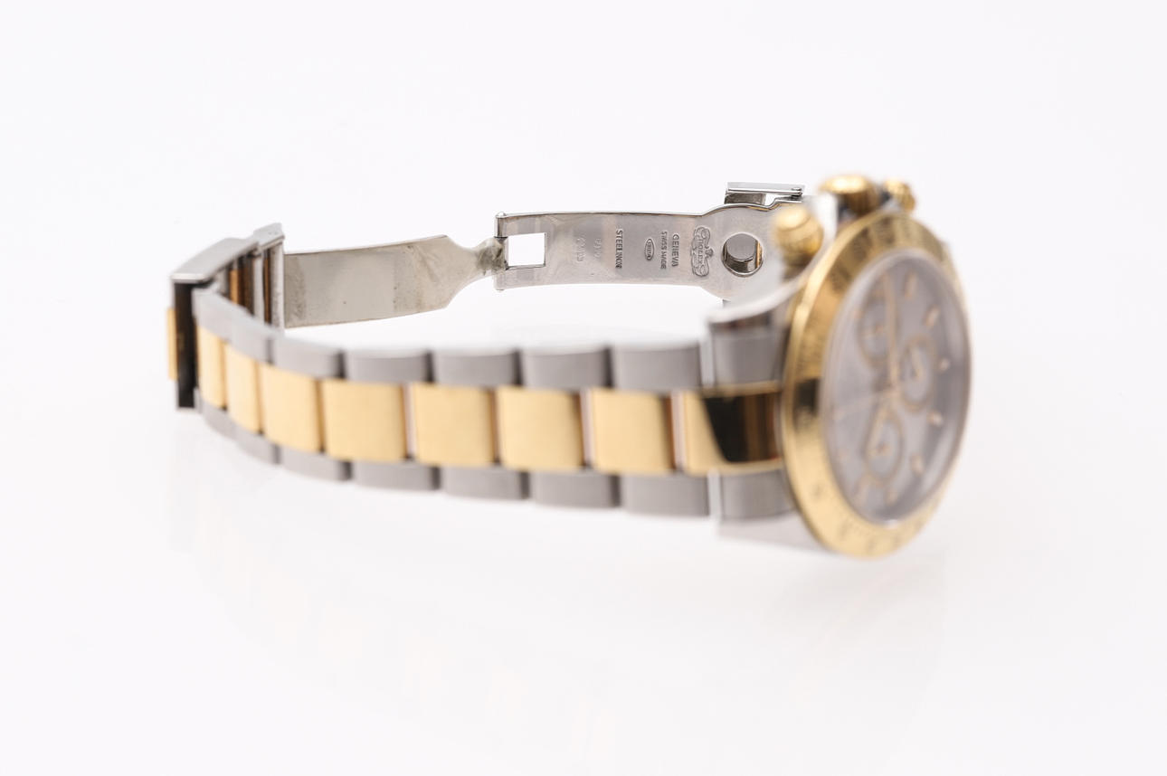 Rolex, Daytona, reloj de pulsera, año 2000, movimiento automático, oro/acero, cristal de zafiro, cronógrafo con contadores de minutos y horas, corona a rosca con emblema Rolex, posterior eslabón Rolex Oyster en original de 2008 ref no. 78493/PJ10, ref. 116523, número de serie. K382087, diámetro aproximado 38 mm.