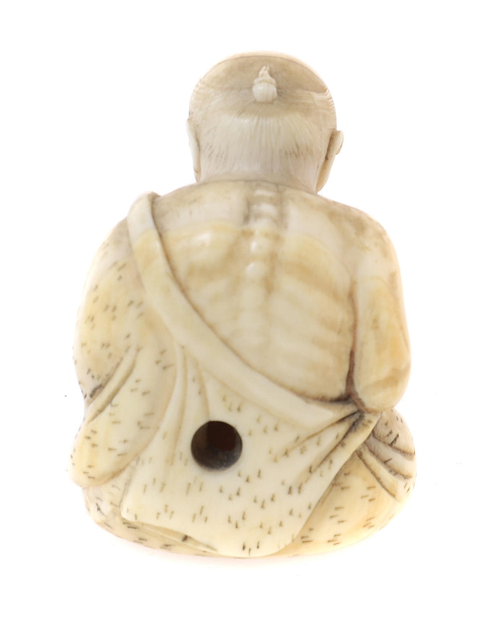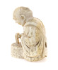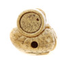 se muestra tallando estrías en una piedra de moler de piedra arenisca, sin firmar, 4 cm de alto.