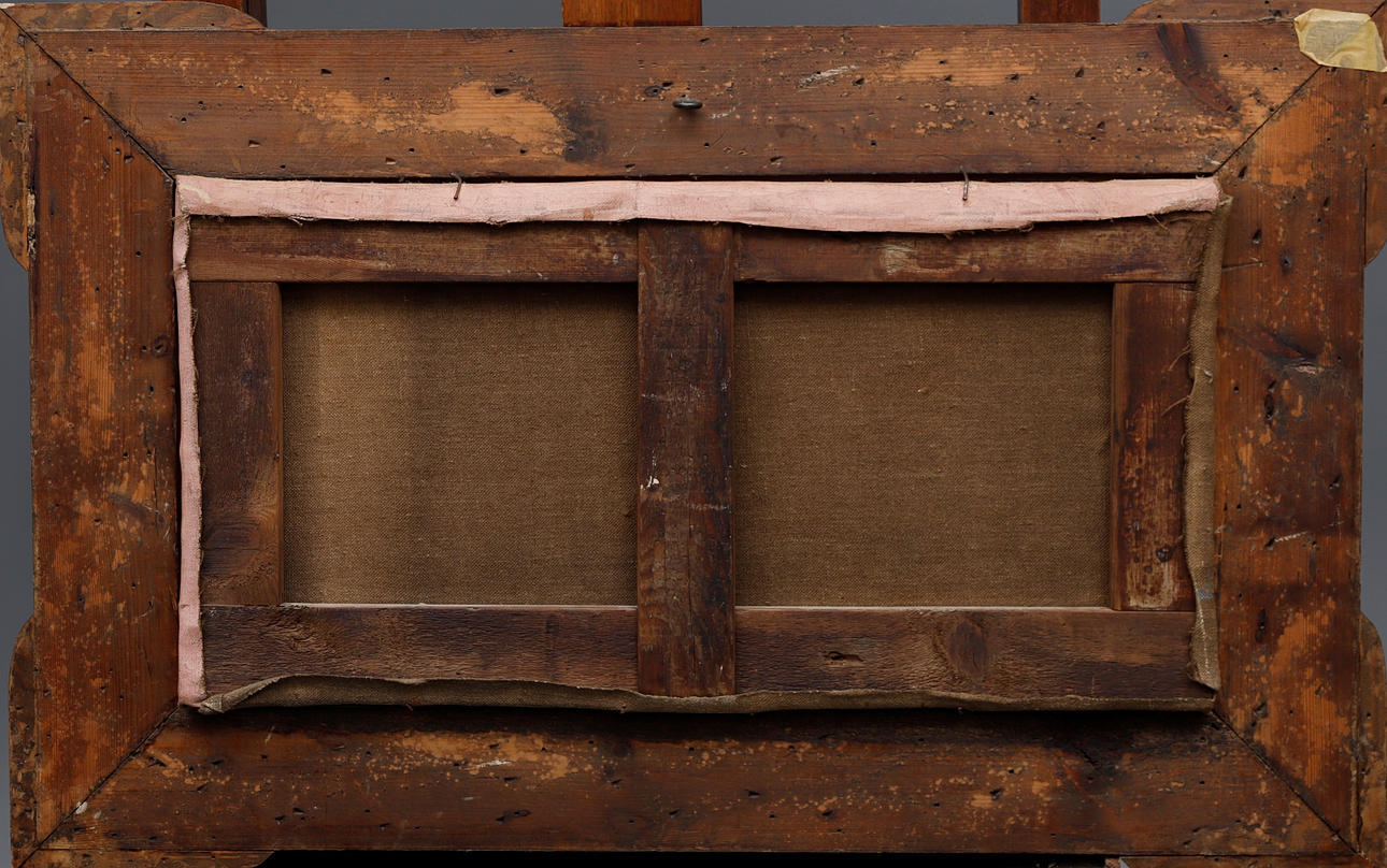 Leve golpe en la zona central de la composición, afectando a la capa pictórica. Marco en madera estucada y dorada, con leves faltas.