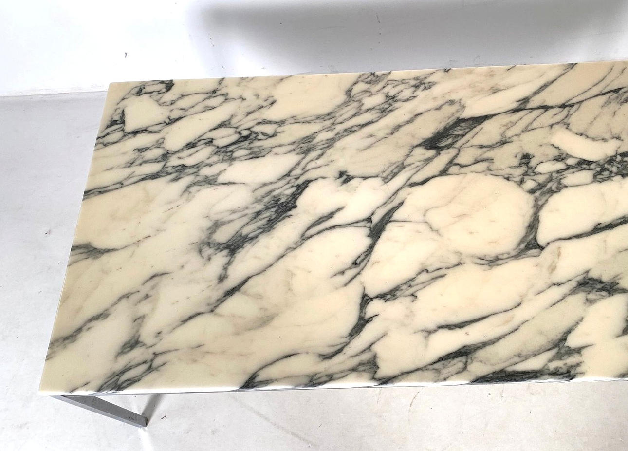 FLORENCE KNOLL mesa de centro / mesa de centro / mesa de mármol. Estructura de acero tubular rectangular cromado, tapa de mármol con bandas sueltas. Ancho 150 cm, altura 48 cm, profundidad 70.