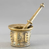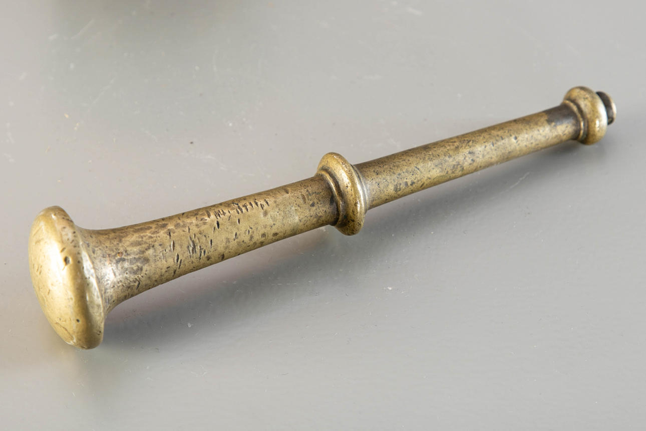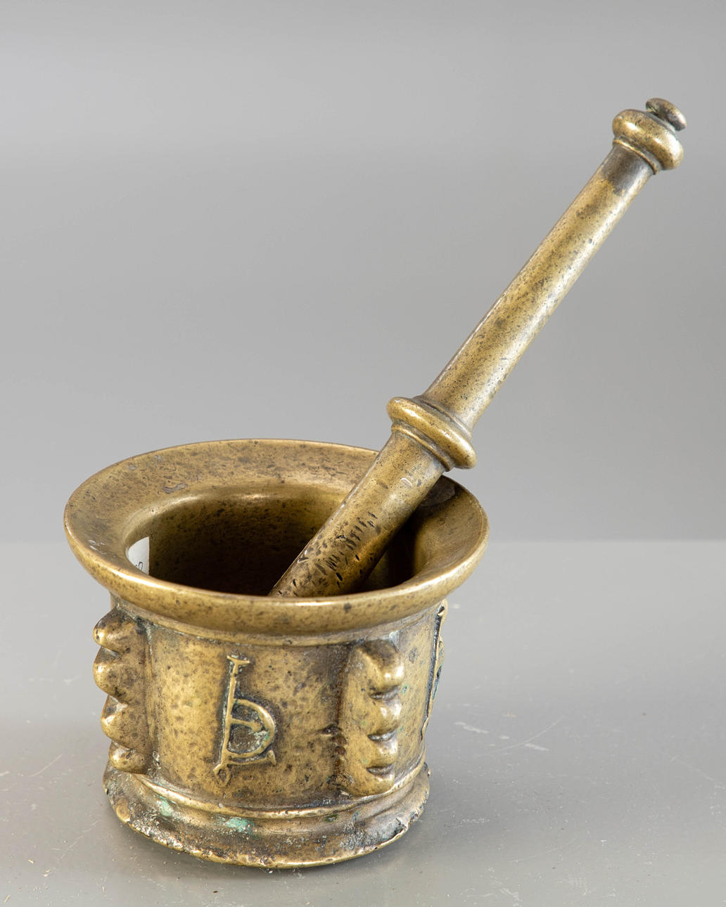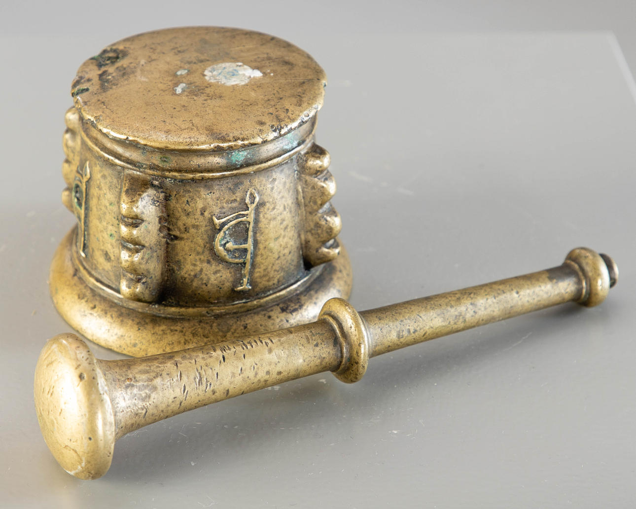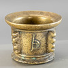 Pared cilíndrica de bronce sobre base ranurada. Costillas pellizcadas alternadas con letras en relieve. Al x Pr: 9,5 x 12,5 cm. Procedencia- De una colección privada- Ver subasta de Christie's, febrero de 1981, "A COLLECTION OF MEDIEVAL MORTAS" - Cat. No: 108.