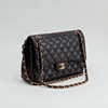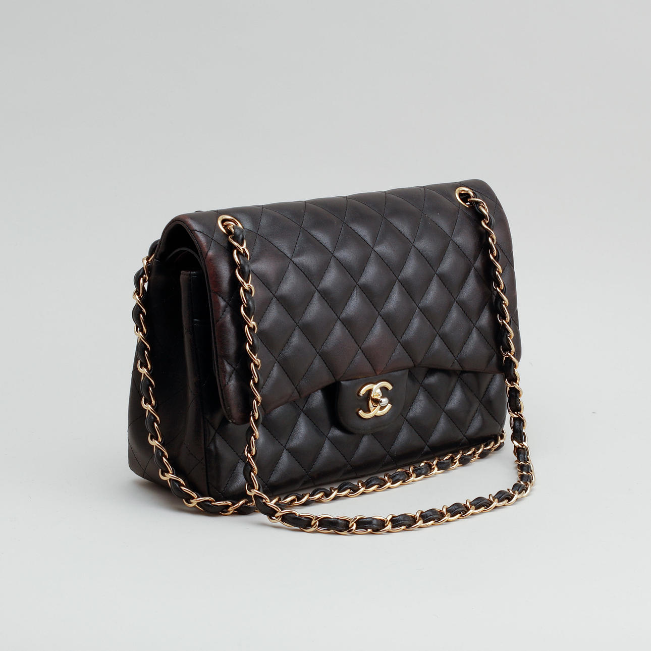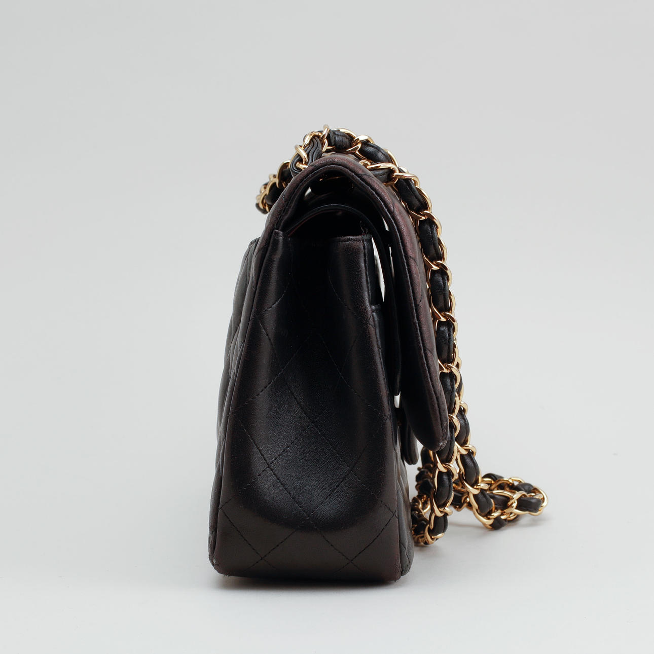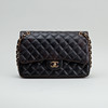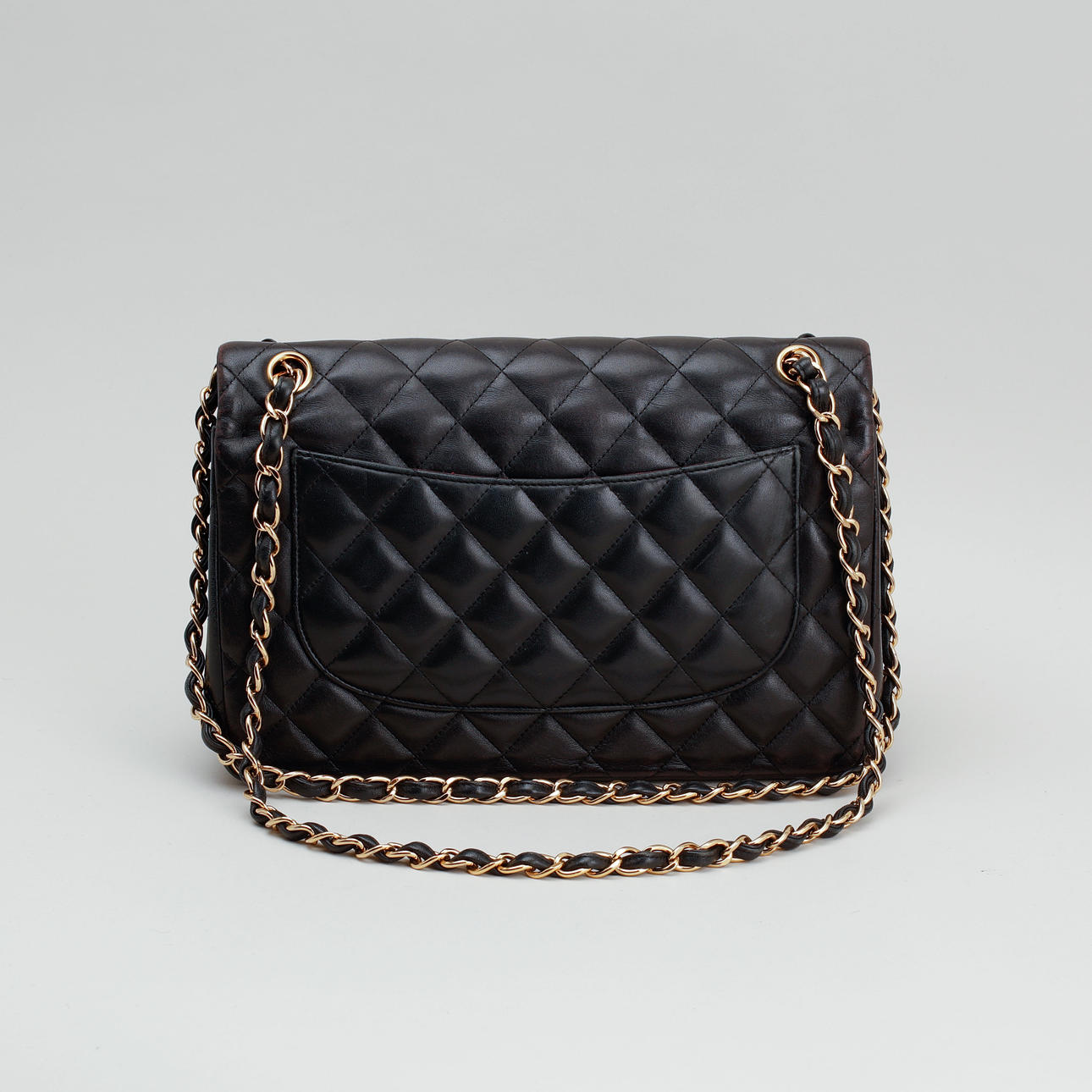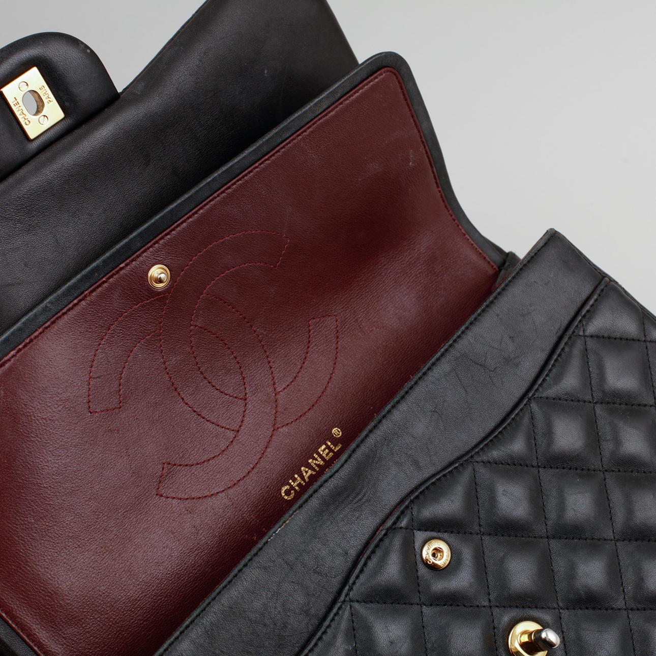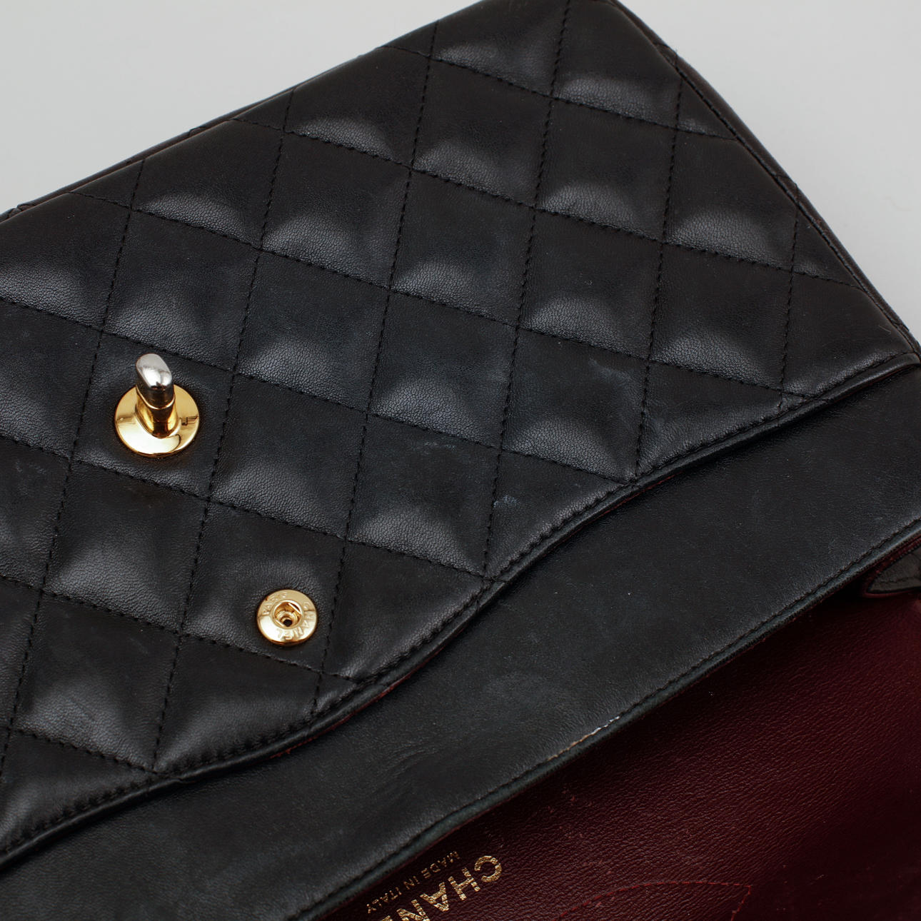 Bolso bandolera en piel acolchada con detalles en metal dorado. Forrado con piel de color burdeos. Un total de seis bolsillos interiores, uno de ellos con cremallera y un compartimento exterior en la parte trasera. "CHANEL PARIS" en la cerradura. El interior marcado "CHANEL MADE IN ITALY" y con un código de fecha.
