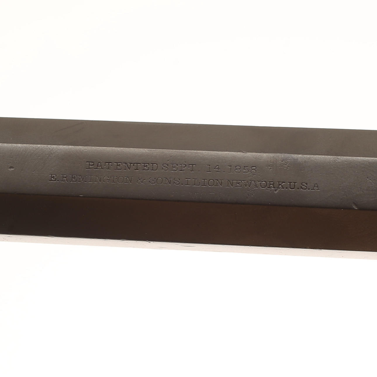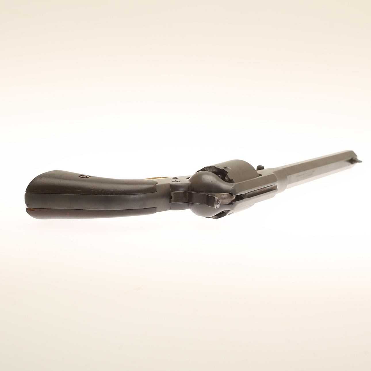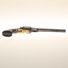 Calibre aproximadamente 11 mm. Revólver de percusión fabricado por Remington. Longitud unos 35 cm.