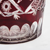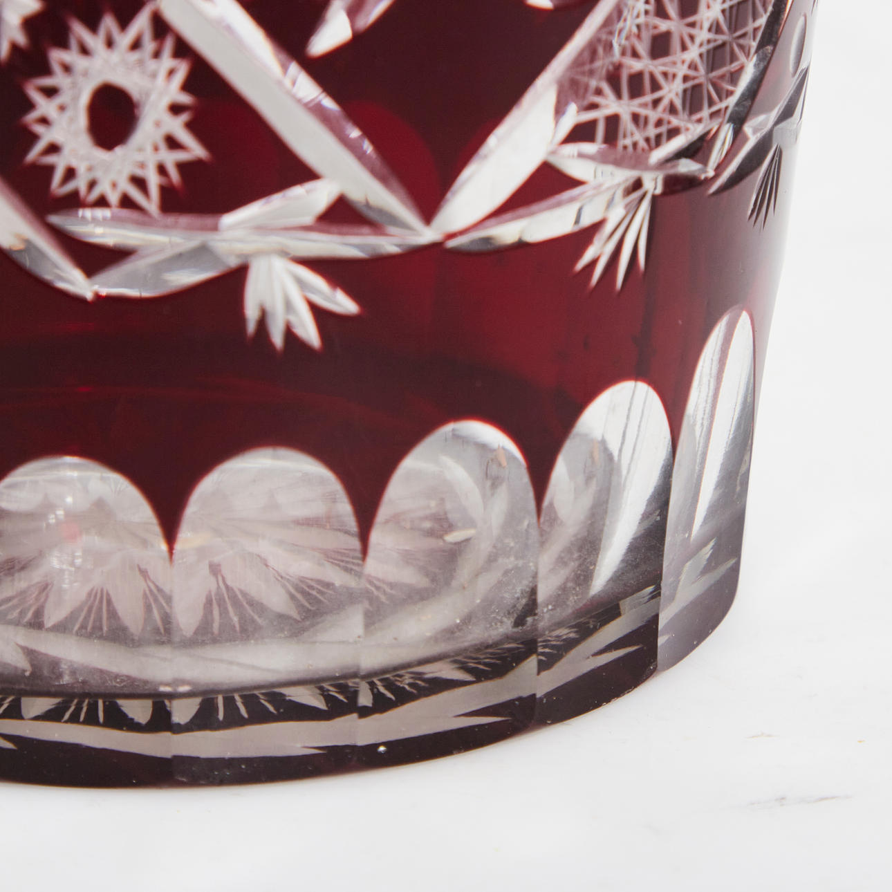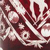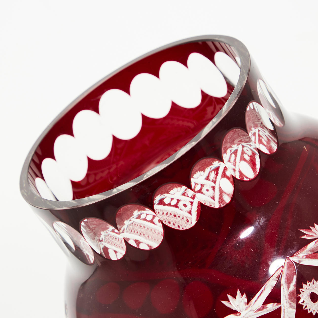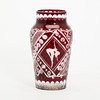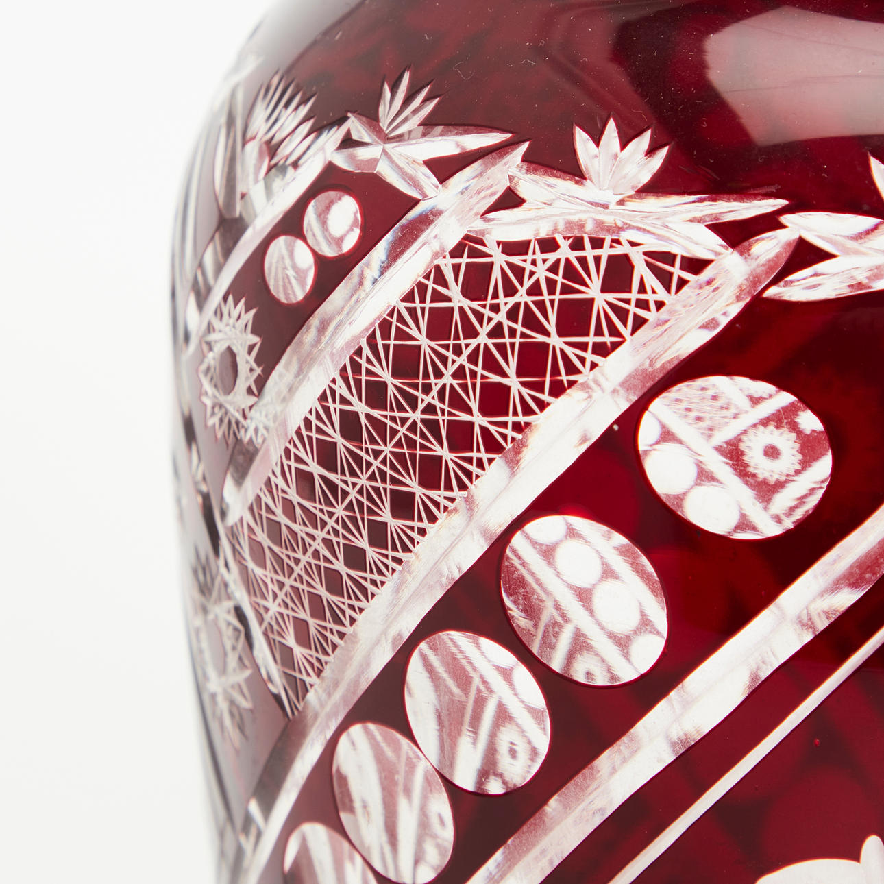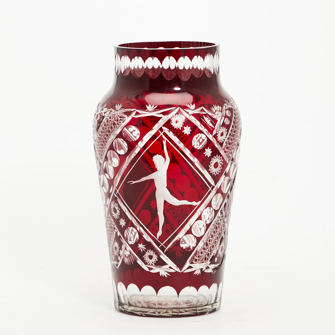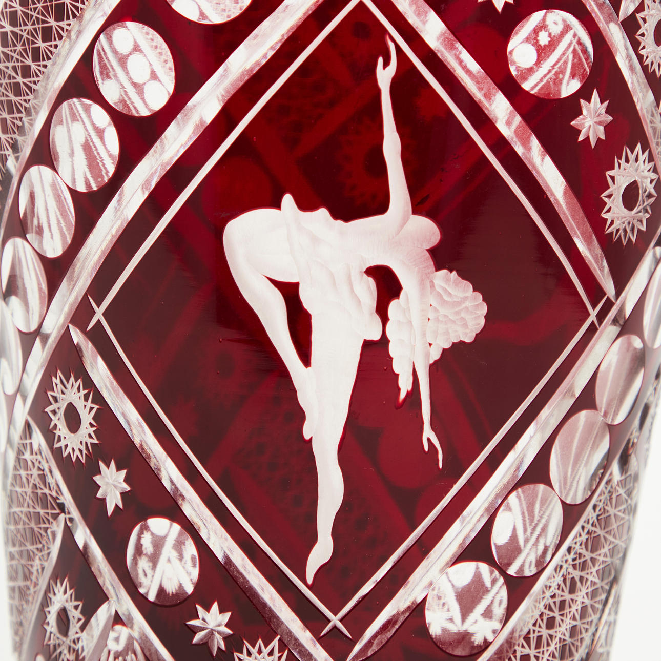 Jarrón, cristal. Jarrón de cristal revestido de rojo rubí, cortado a mano con decoraciones ornamentales y representaciones de bailarines, forma ovoide con hombro aplanado y cuello corto, H.31cm, D.19cm.