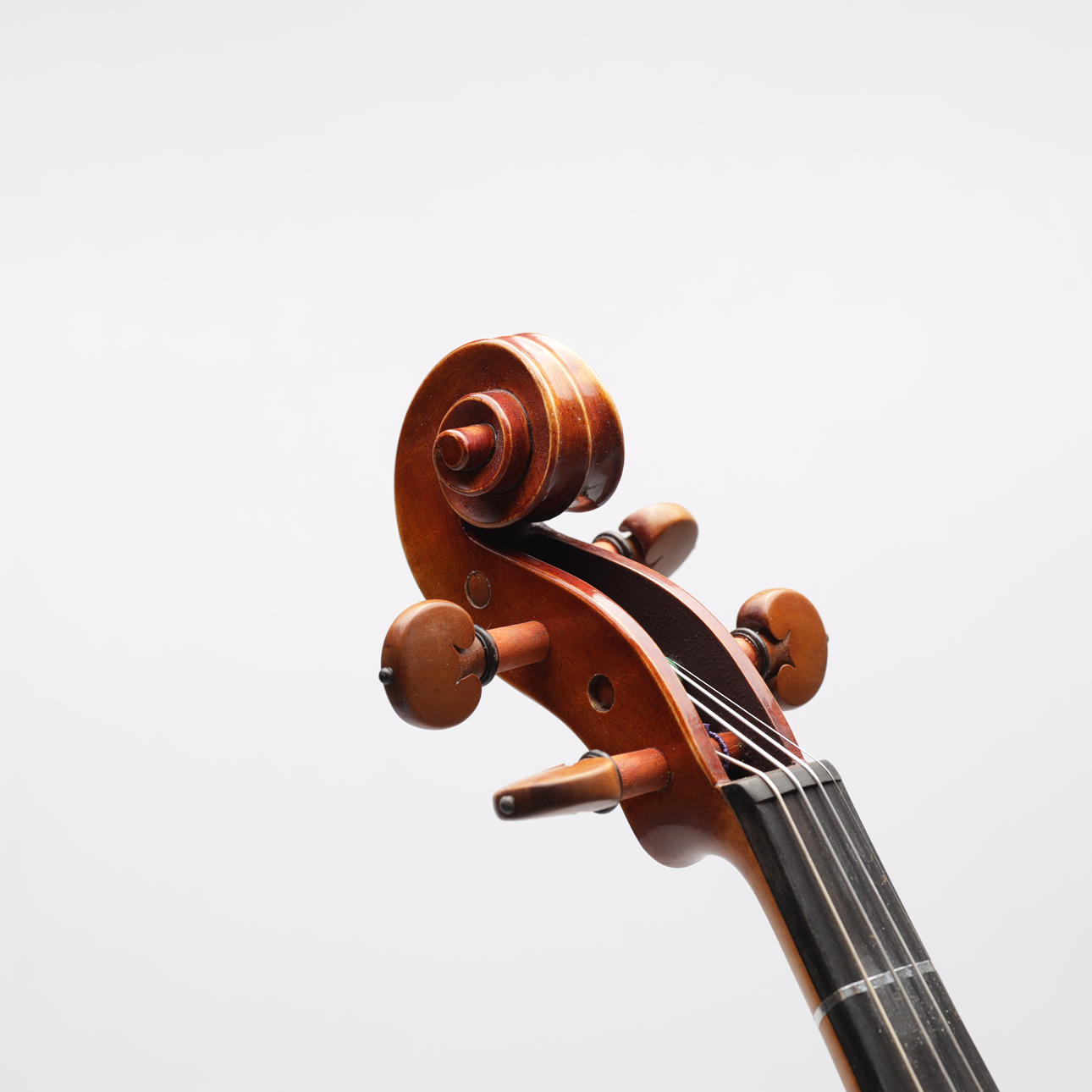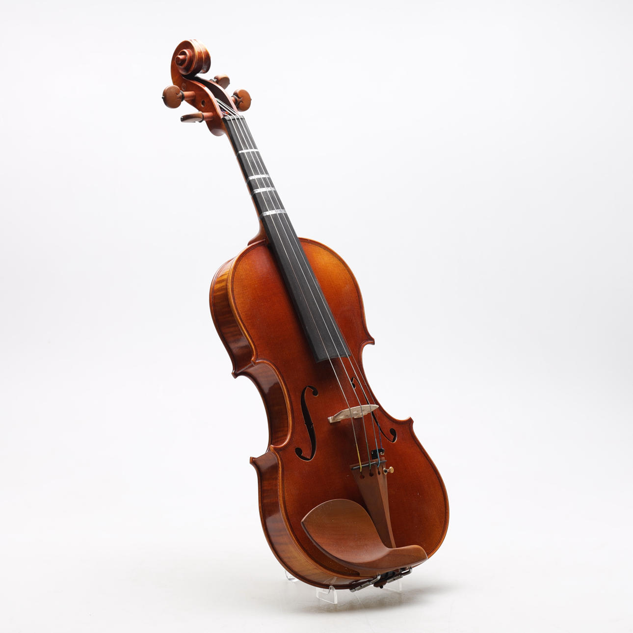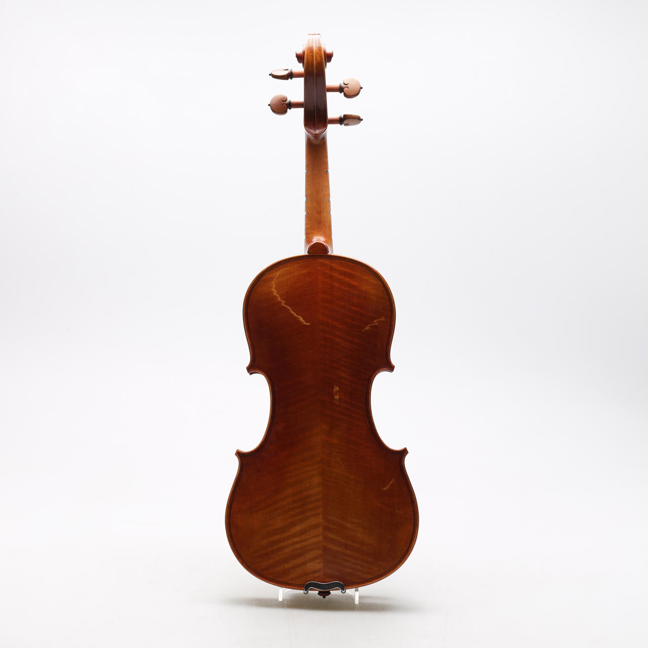 Violín hecho a mano con tapa en abeto y fondo en preciosa madera de arce flameado, superficie pulida a mano, diapasón en ébano y mentonera y mentonera en boj. Longitud del cuerpo aproximadamente 36 cm, longitud total aproximadamente 60 cm.