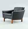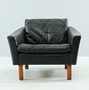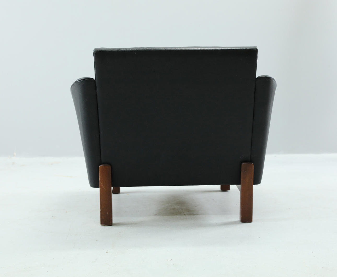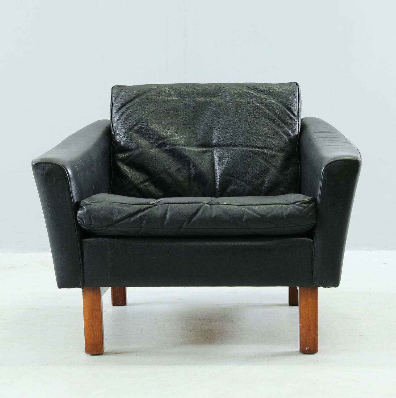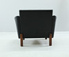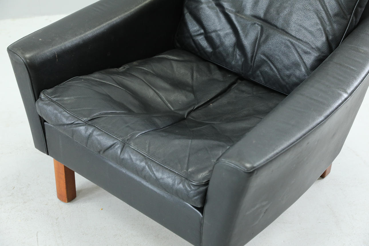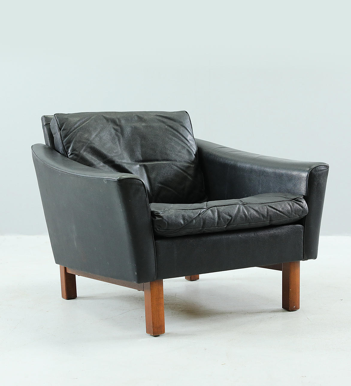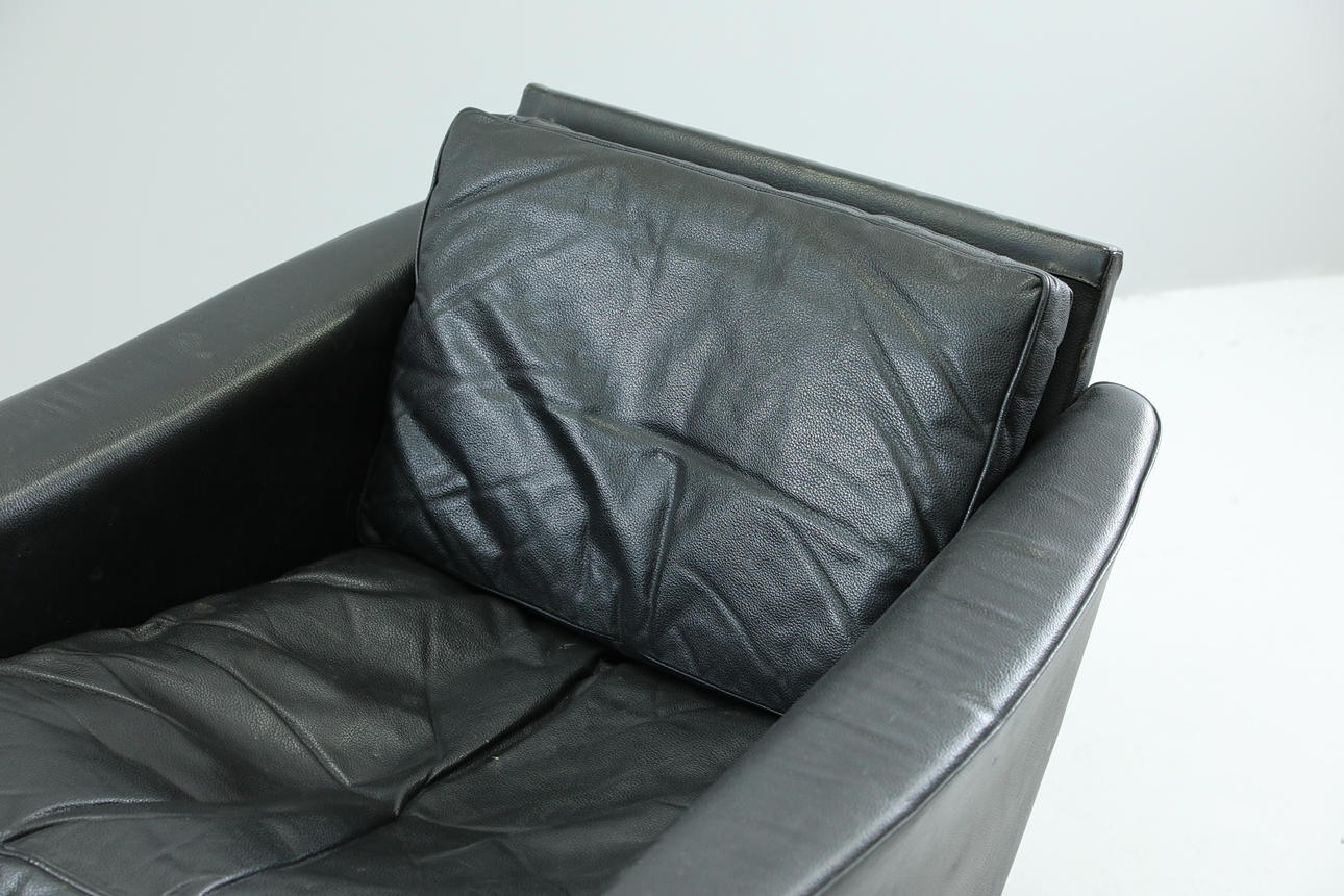 Plumas sueltas y tapicería de cuero negro. Patas de teca. Longitud 86, profundidad 85, altura 75, altura del asiento 42 cm.