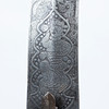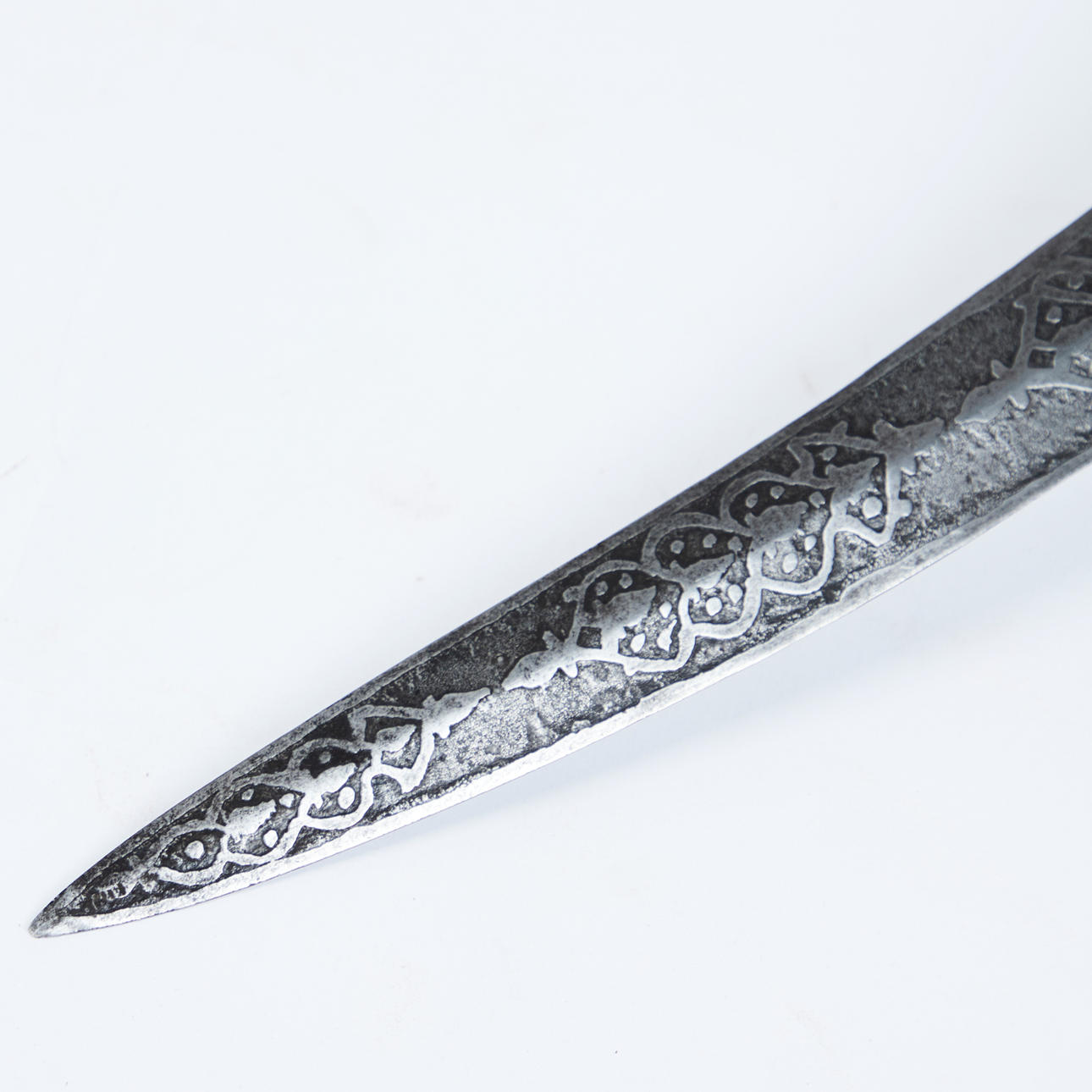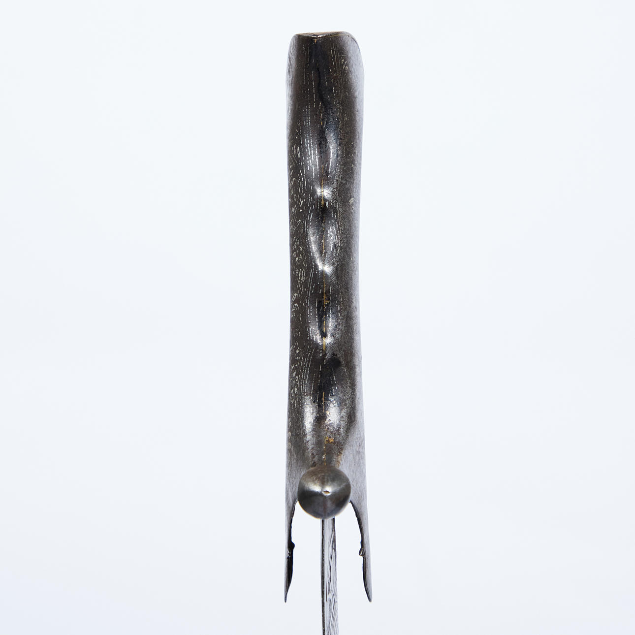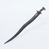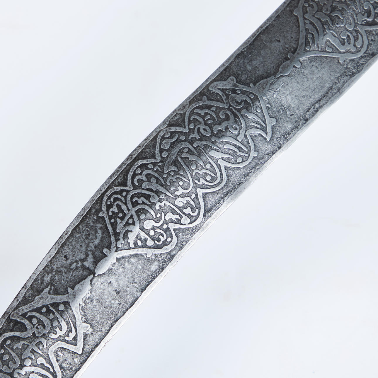 Espada, probablemente del siglo XVIII. Espada con hoja de acero flameado cortada plana con inscripción árabe, empuñadura originalmente ondulada con incrustaciones geométricas de plata en todo su perímetro, L.97cm.