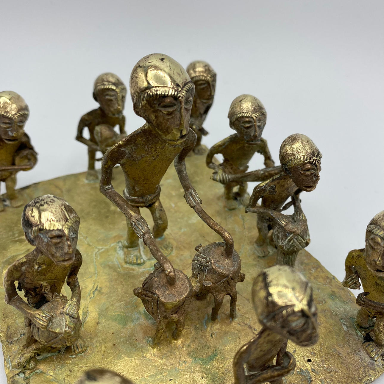 Escultura de bronce de Benin que representa a 10 músicos con varios instrumentos.
