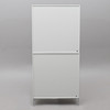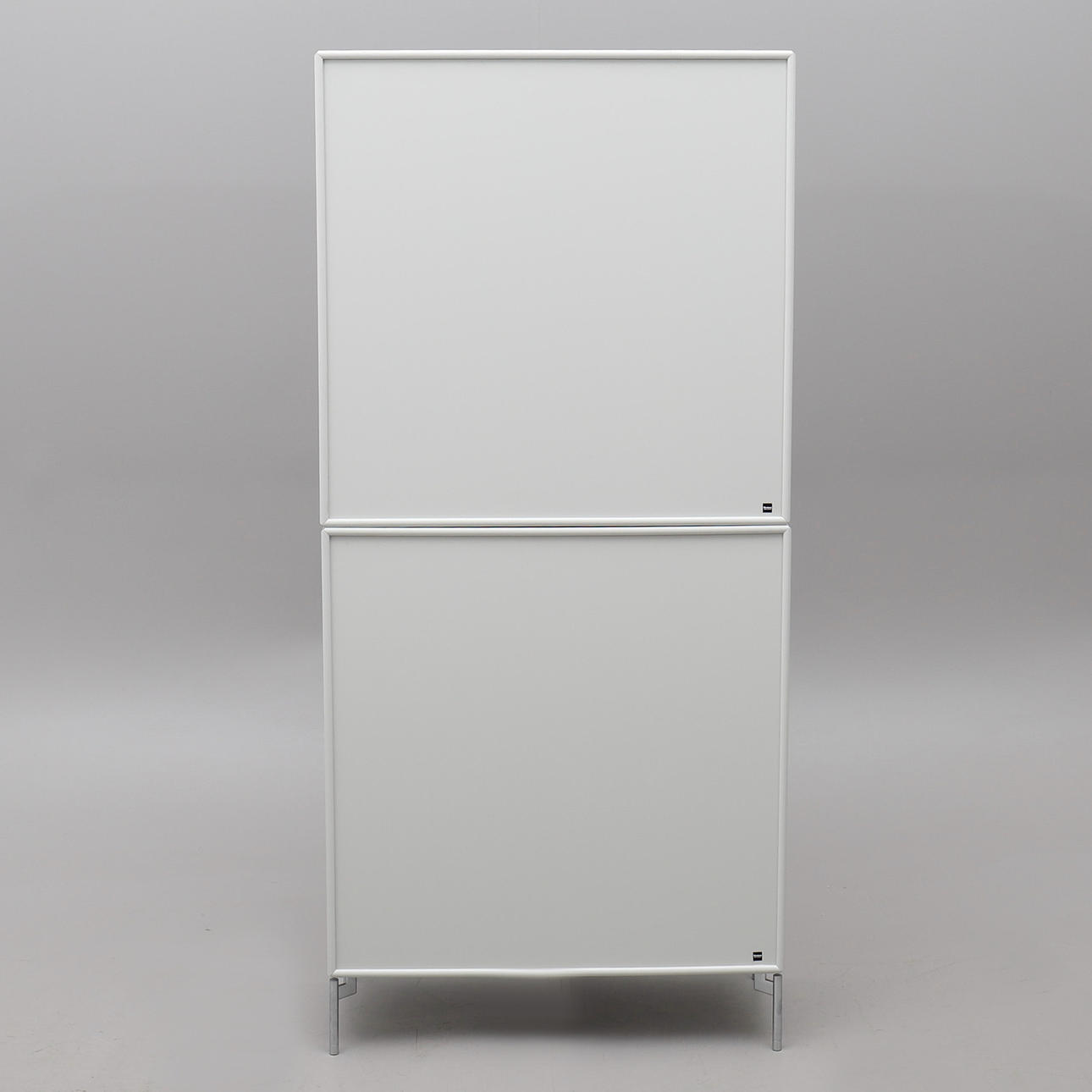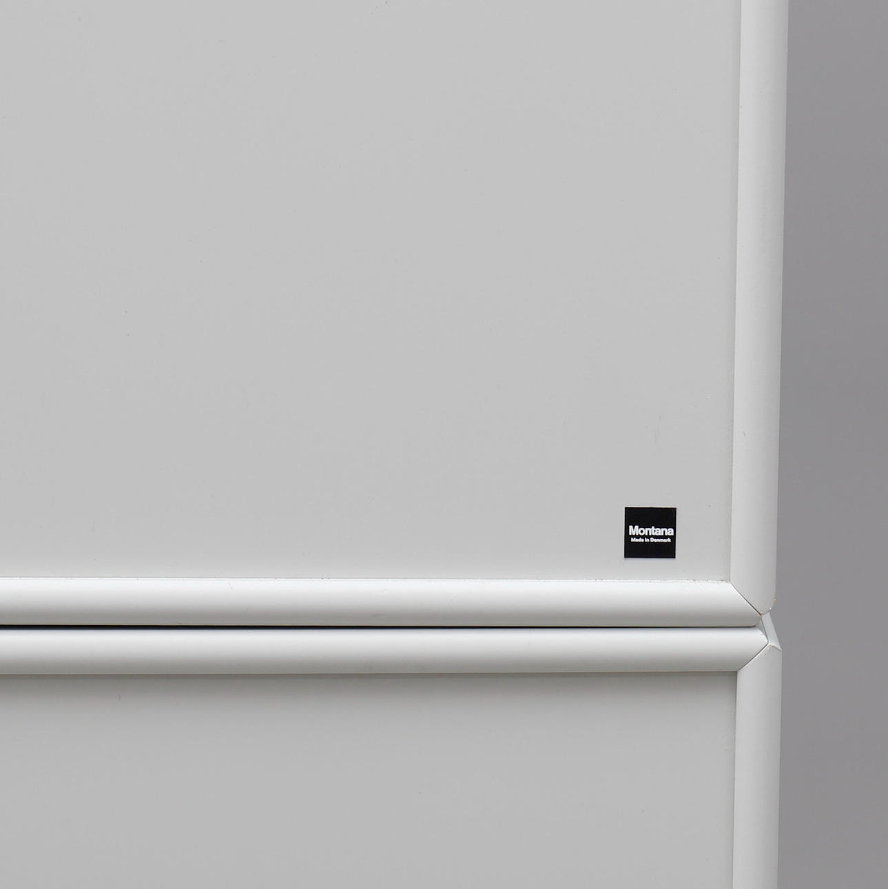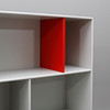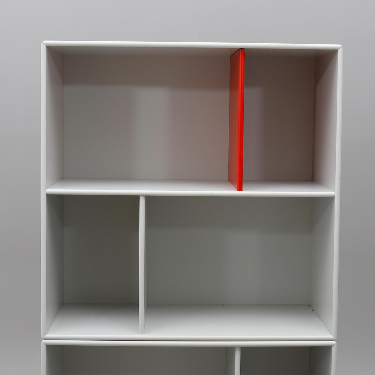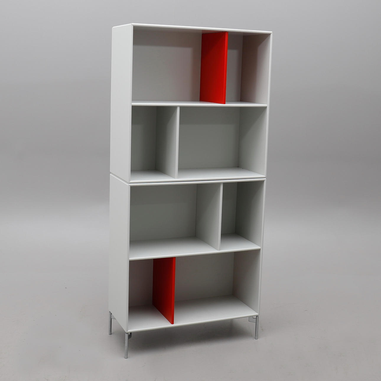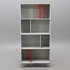 Lacado en gris, algunas baldas lacadas en rojo. Dos piezas. Sobre patas de aluminio. Ancho 70, fondo 30, alto 171 cm.