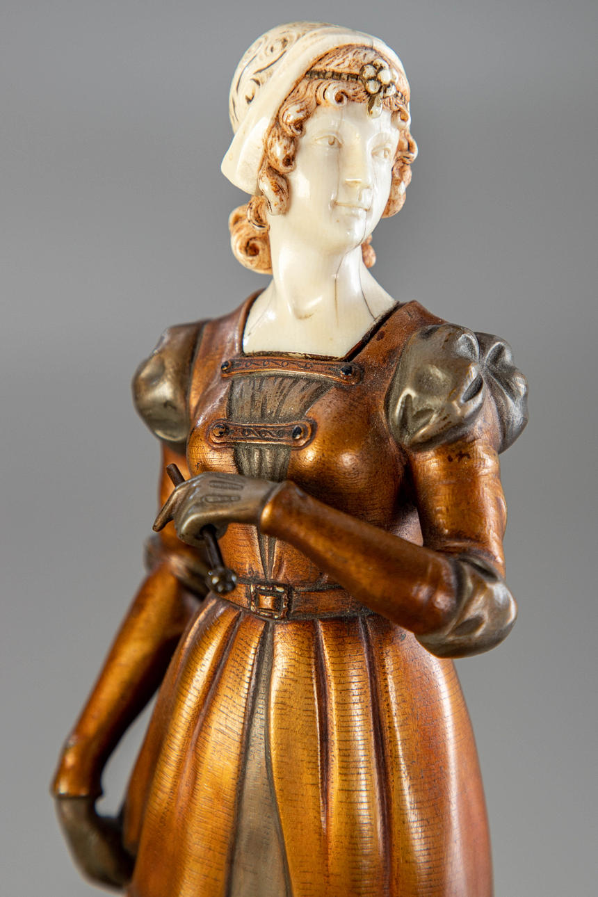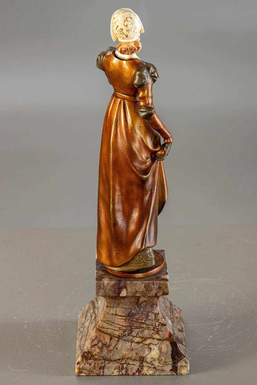 Hans Keck (1875-1941), mujer caminando, bronce, pátina multicolor, con marfil tallado, firmado 'H. Keck fec.', figura de altura aprox. 22 cm, con base de altura aprox. 30 centimetros.