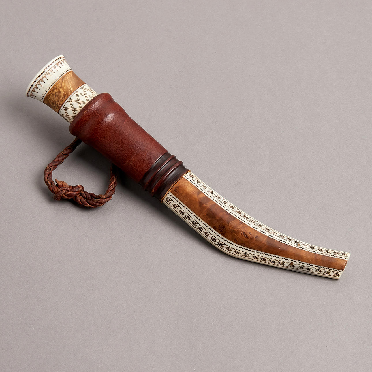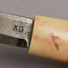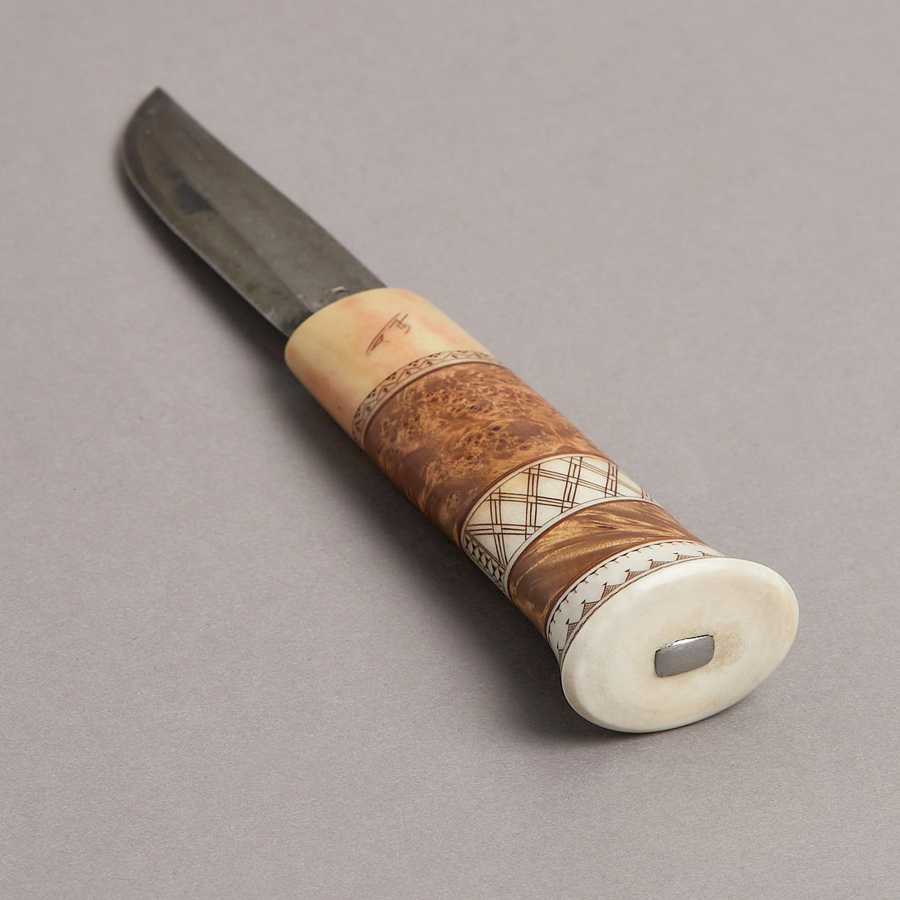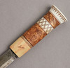 Cuerno de abedul y reno con decoración grabada, firmada SL, la hoja forjada a mano firmada KG, longitud 23,5 cm Svante Larsson, nacido en 1940 en Lappträsk, hoja numerada el principal "no sami" que fabrica cuchillos sami