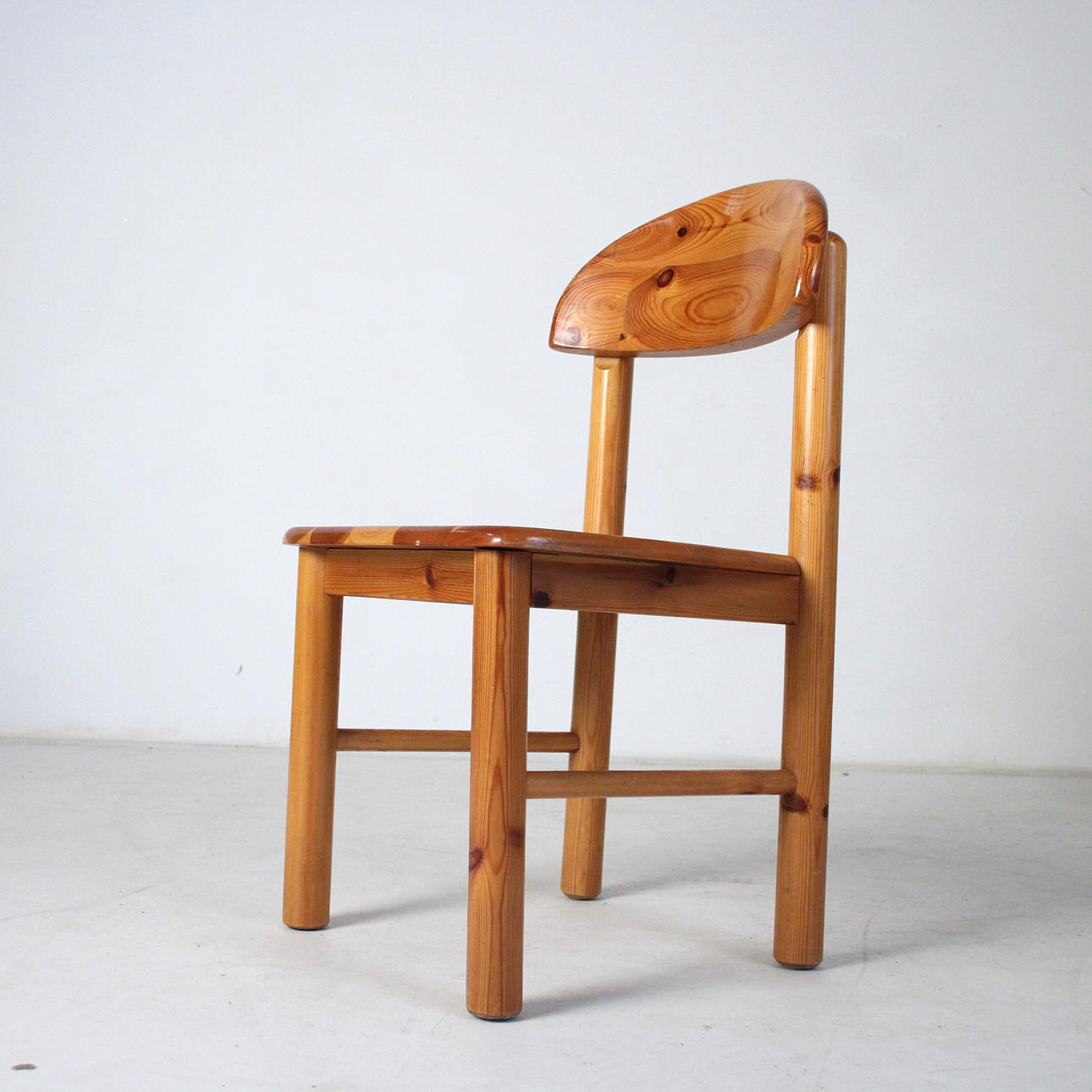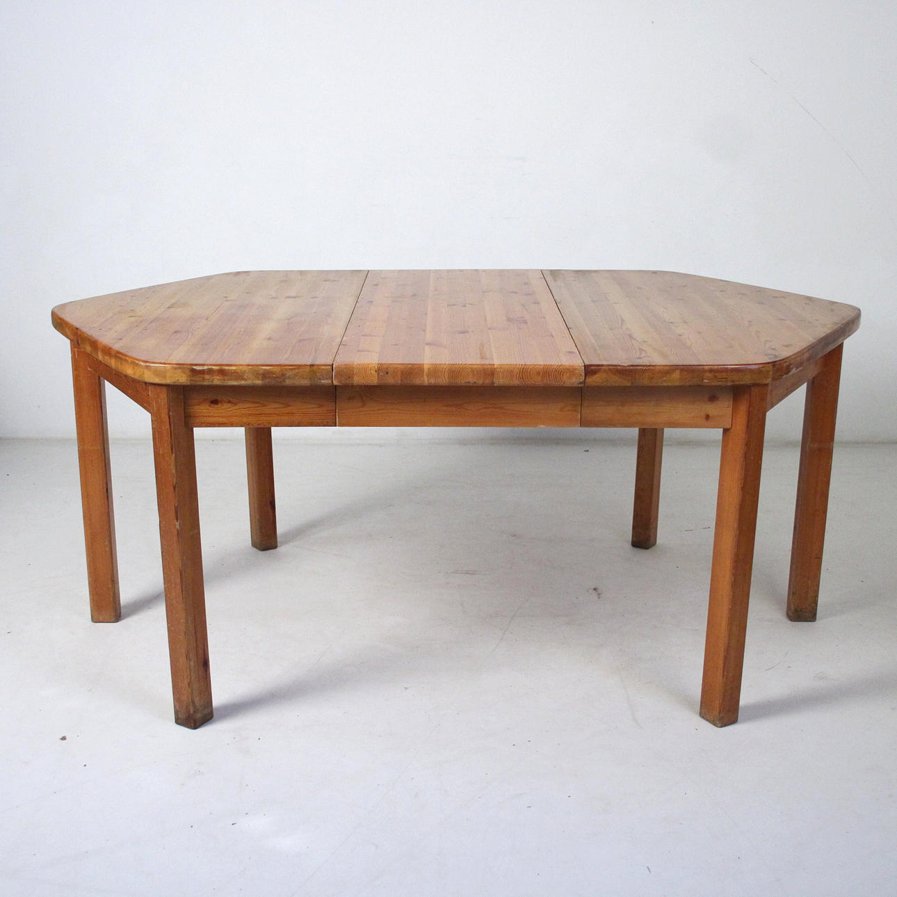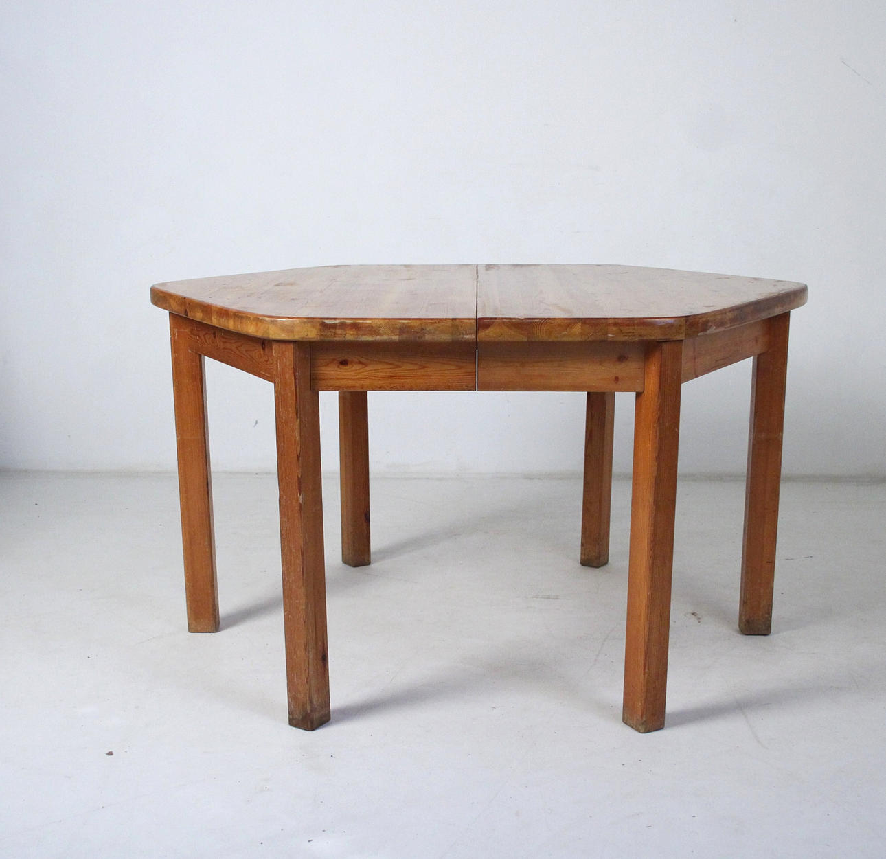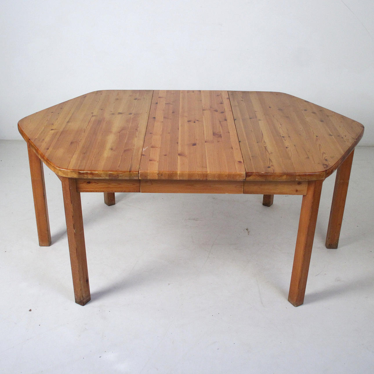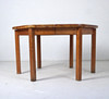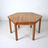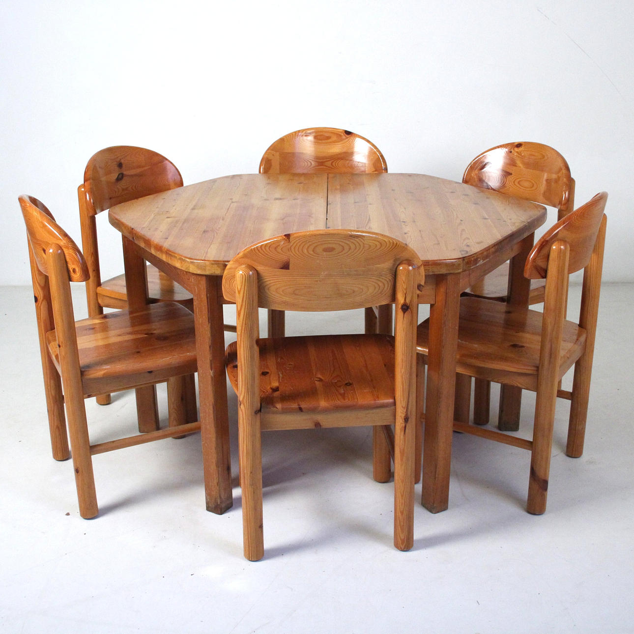 Rainer Daumiller 6 sillas + mesa. 6 sillas de pino macizo, lacado transparente y mesa hexagonal. Mesa con tapa extensible. Dimensiones de la mesa: H. 75cm, W. 135-180cm, D. 120cm, dimensiones de las sillas: H. 88cm, W. 50cm, D 50cm.