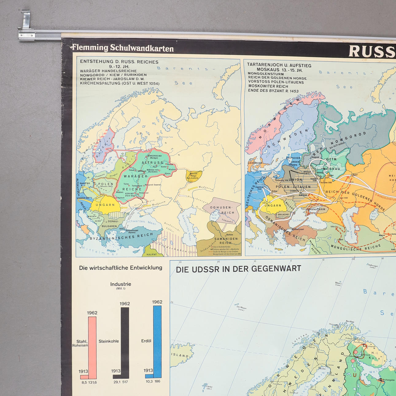 Mapa del desarrollo histórico de la Unión Soviética hasta la década de 1960. Publicado por Flemmings Verlag, Hamburgo. Montaje para suspensión.