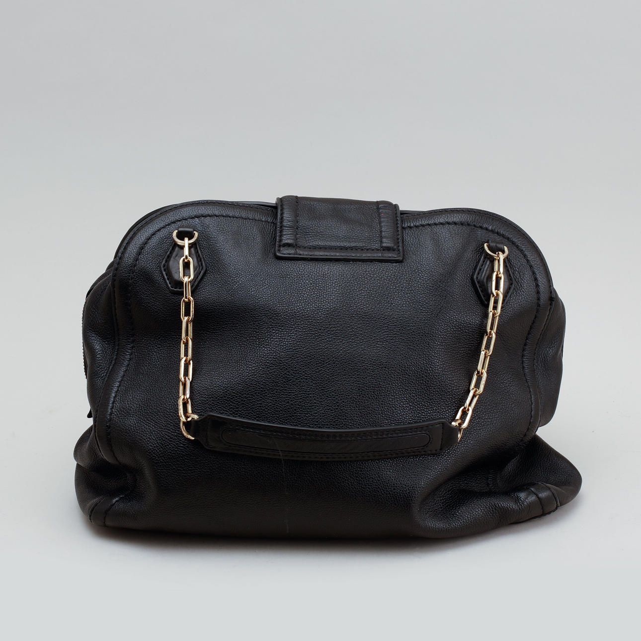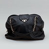 Piel negra con detalles de metal grabado en amarillo. Interior forrado con tres compartimentos, uno de ellos con cremallera. Cierre con cremallera y solapa imantada. Con bolsa de polvo. Longitud aproximada 34 cm, profundidad aproximada 12 cm, altura excl. mango de 28 cm aprox.