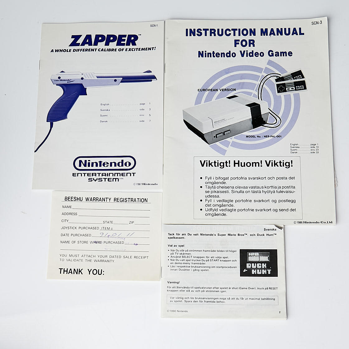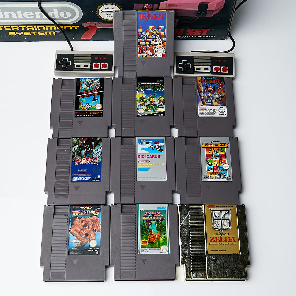 Incluye consola, dos mandos, zapper, el juego doble Duck Hunt/Super Mario Bros, manuales de instrucciones y fecha/prueba de compra Otros juegos incluidos: The Legend of Zelda (versión europea), Teenage Ninja Turtles, Chip & Dale Rescue rangers, Ikari Warriors , Trojan, Kid Icarus, Dr X Mario, World Wrestling y Track & Field 2.