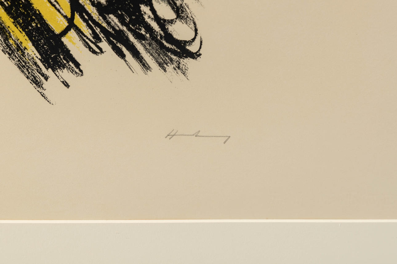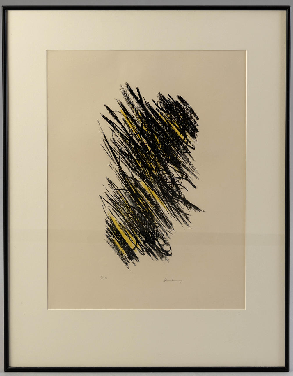 Hans Hartung (1904-1989), L 25, litografía en color, 1957, firmada y numerada, copia 55/100, aprox. 48 x 27 cm, enmarcado tras un cristal, con marco aprox. 91x71 cm.
