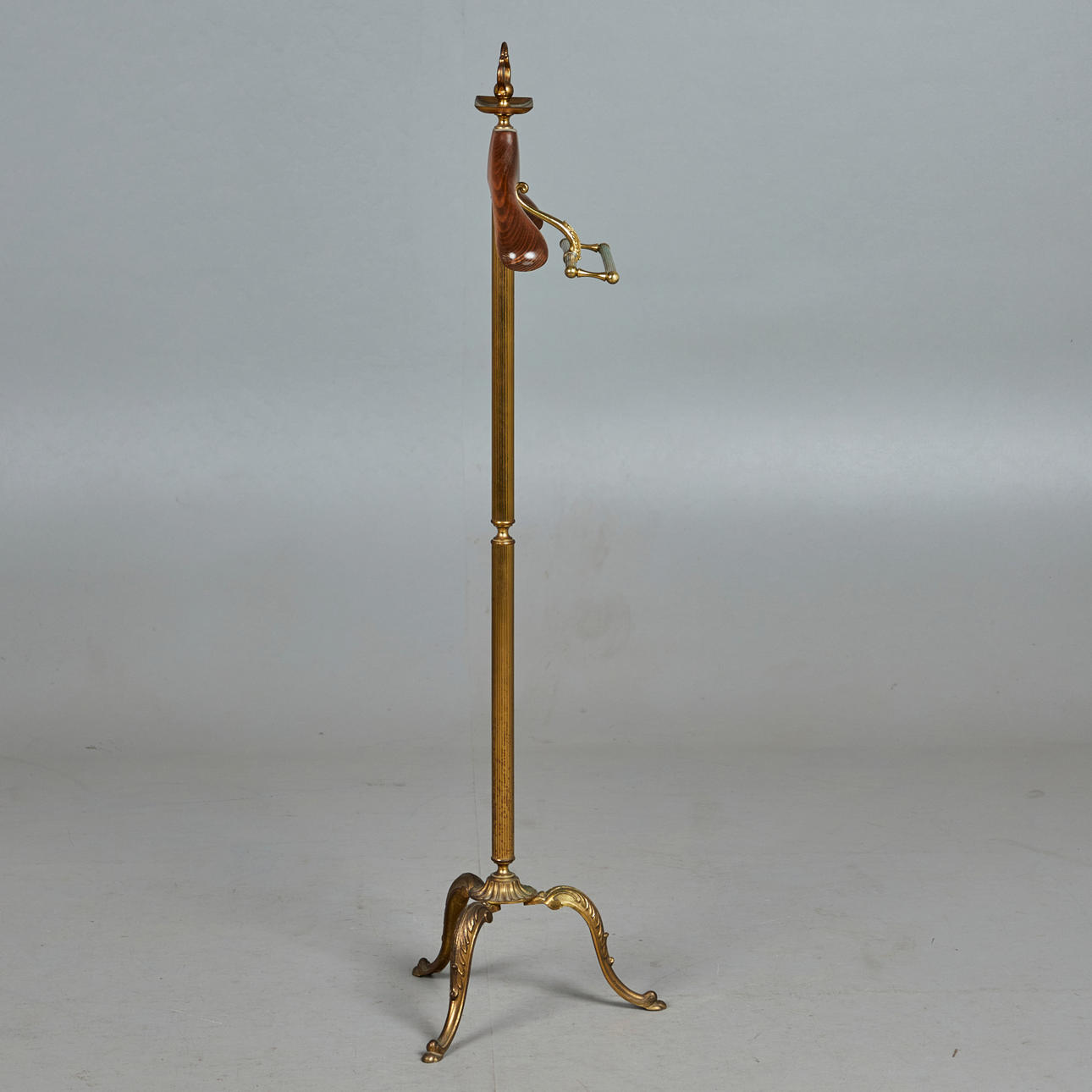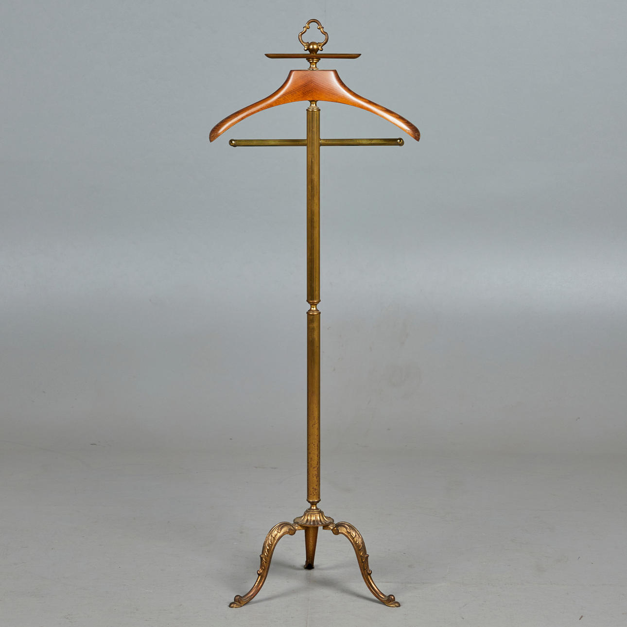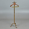 Perchero, latón, madera, años 60. Construcción de latón con un trípode curvo, con una percha de madera en la parte superior, dos barras para ropa y un estante de latón, H.130cm, W.47cm, D.33cm.