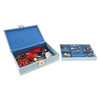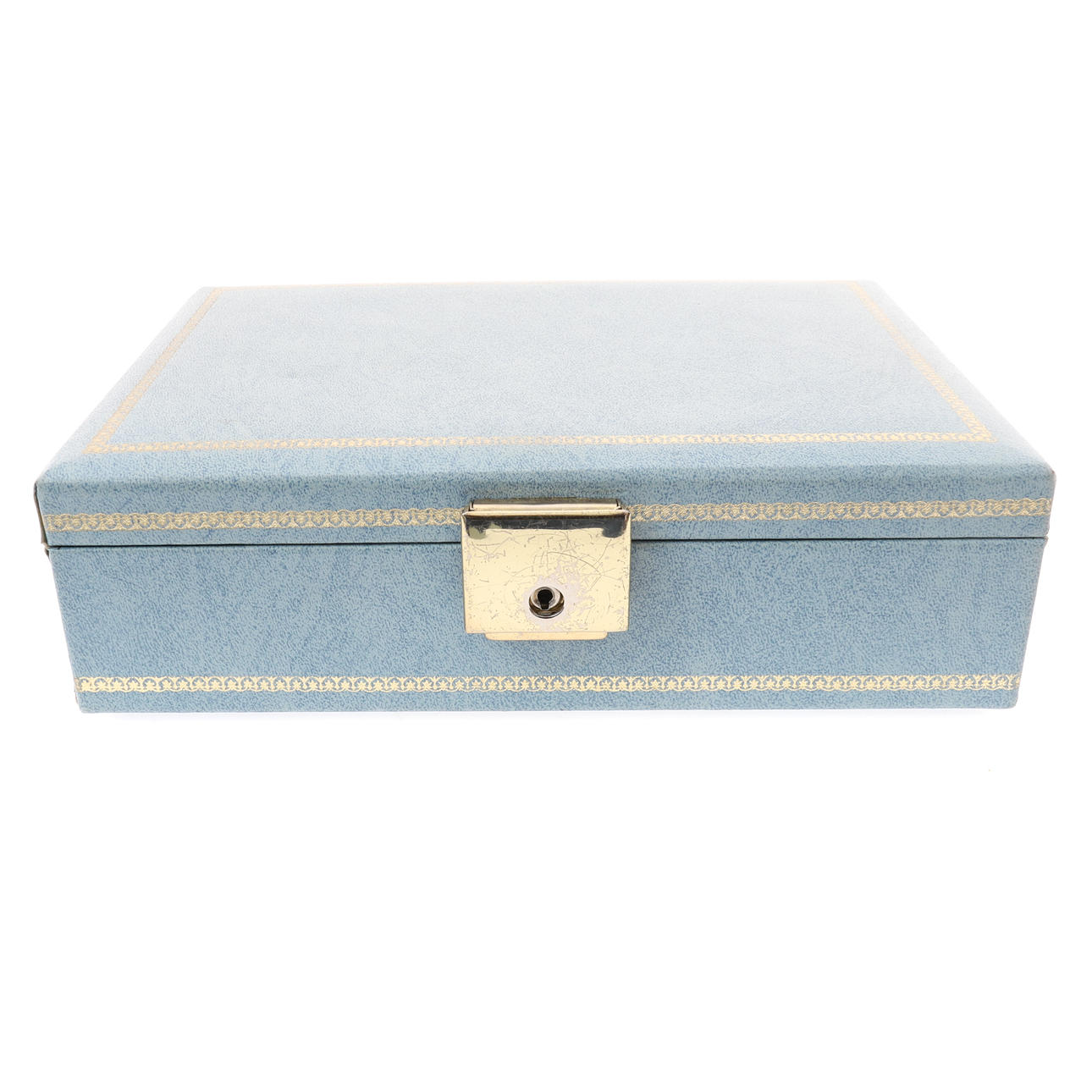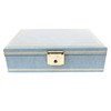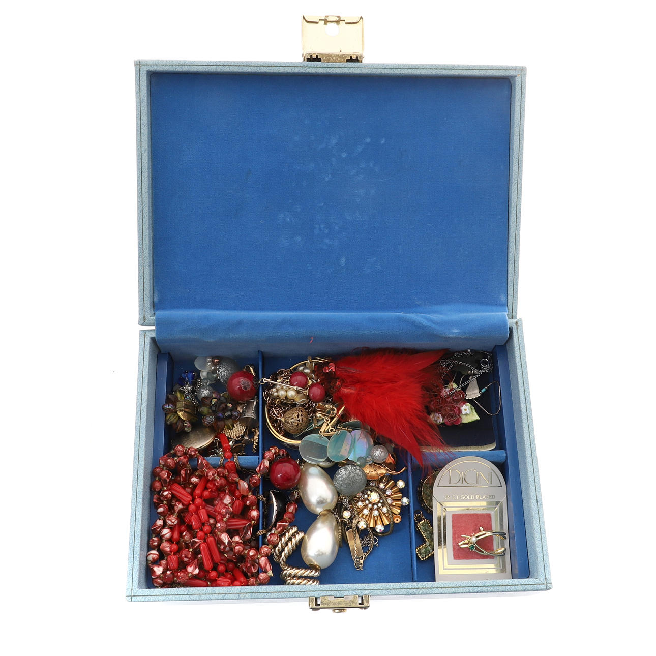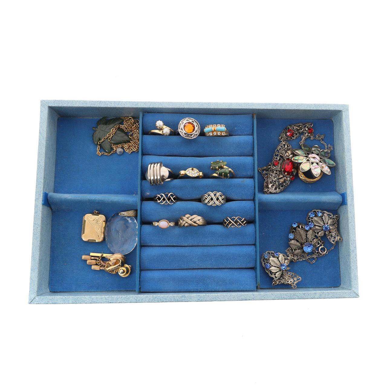 incluidos anillos, aretes, colgantes, collares y otros artículos, en un joyero azul pálido (cantidad).