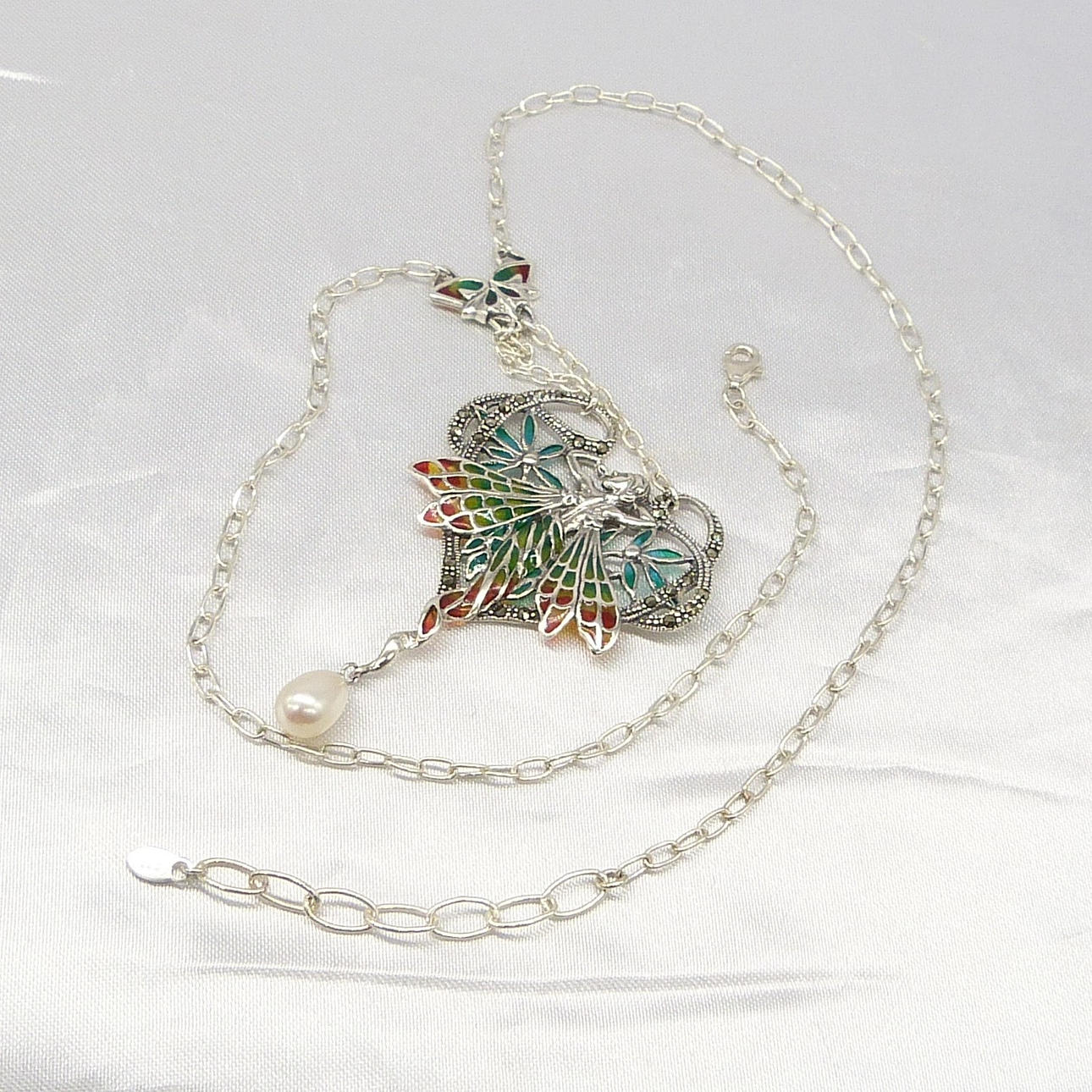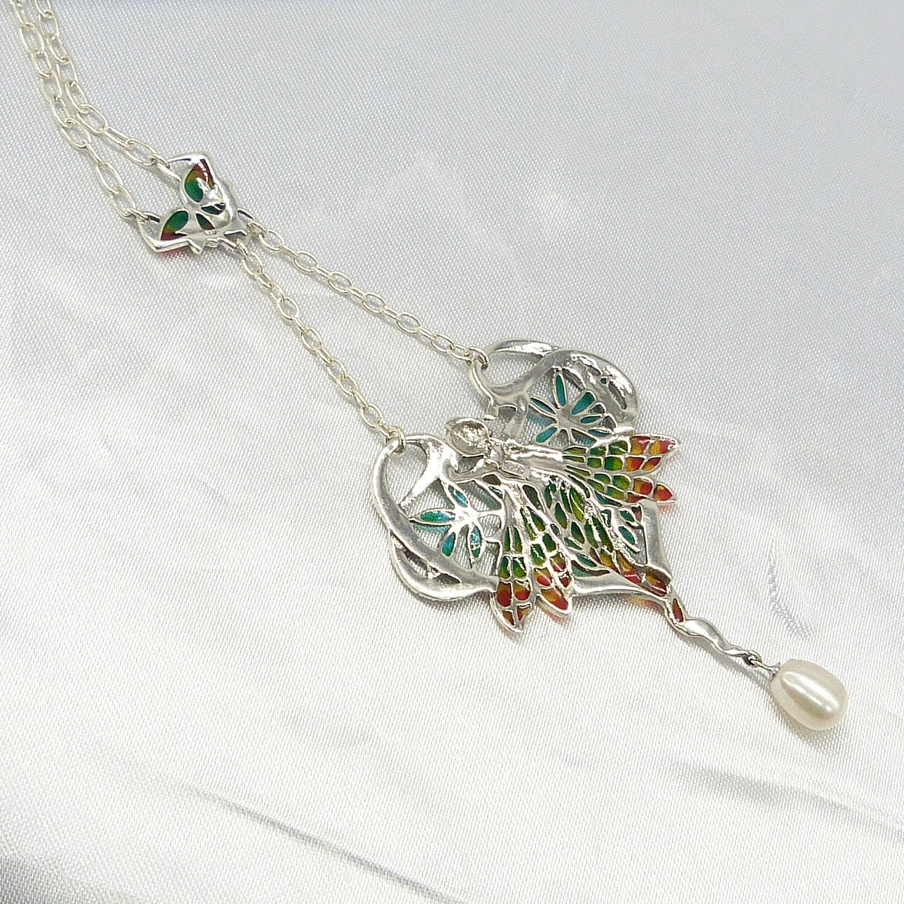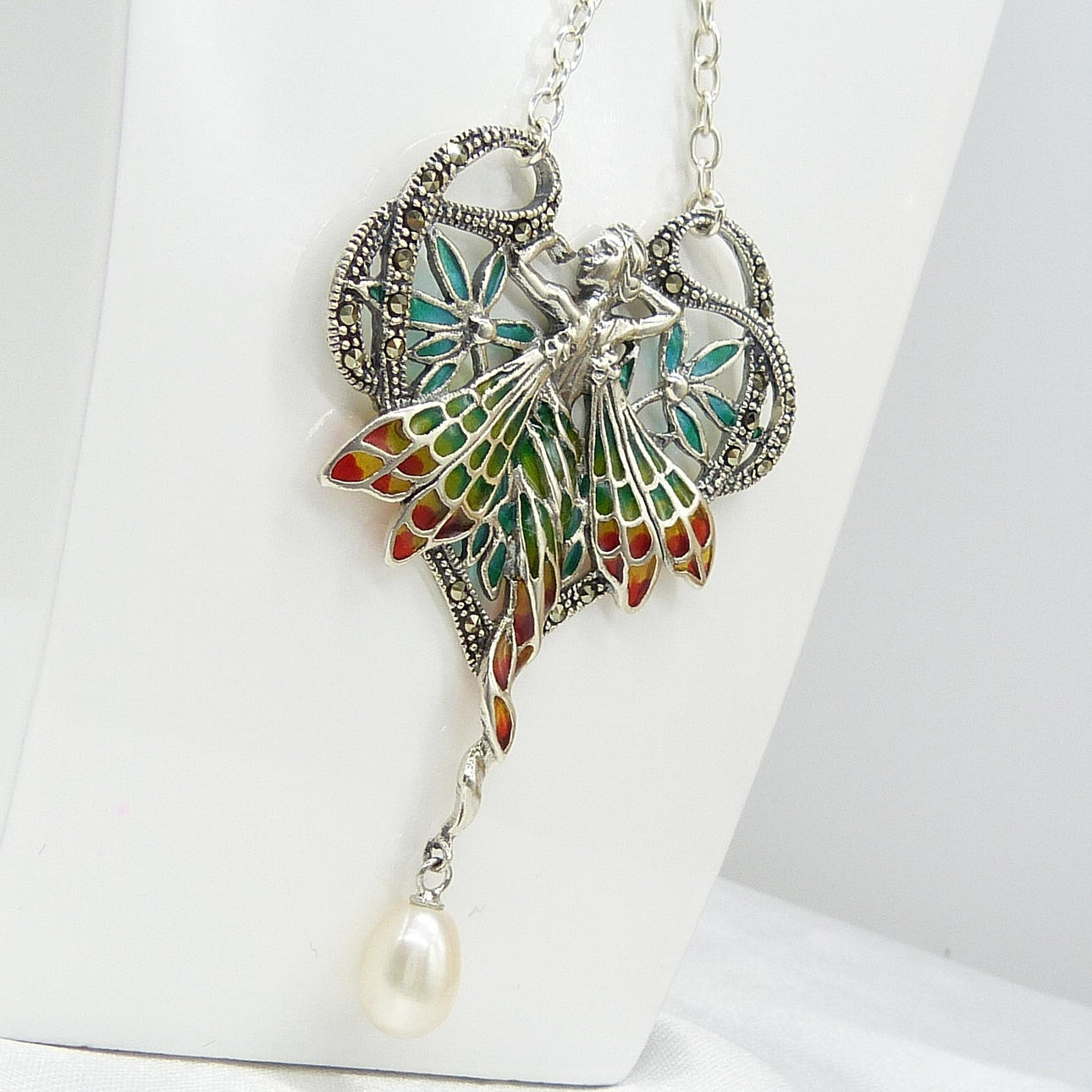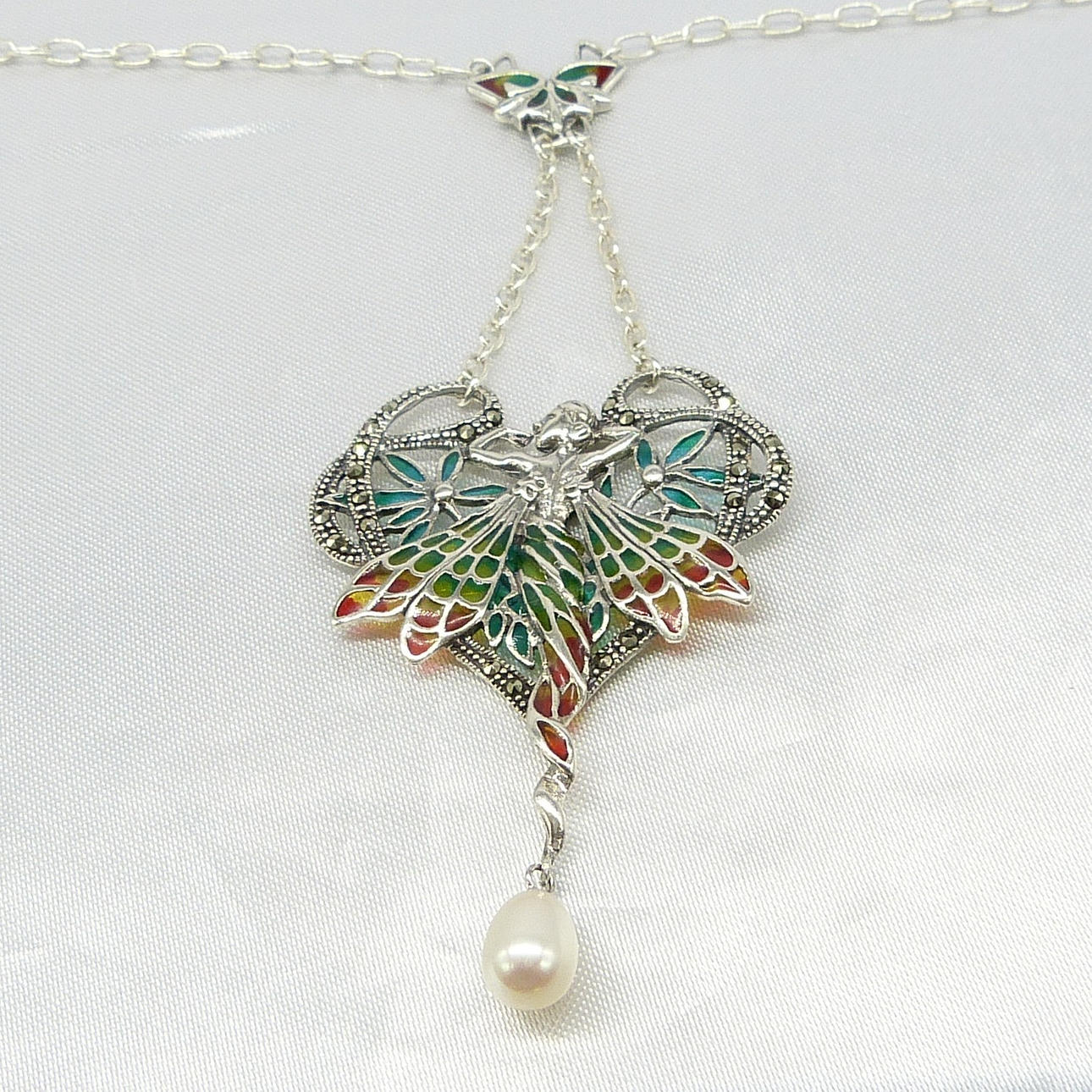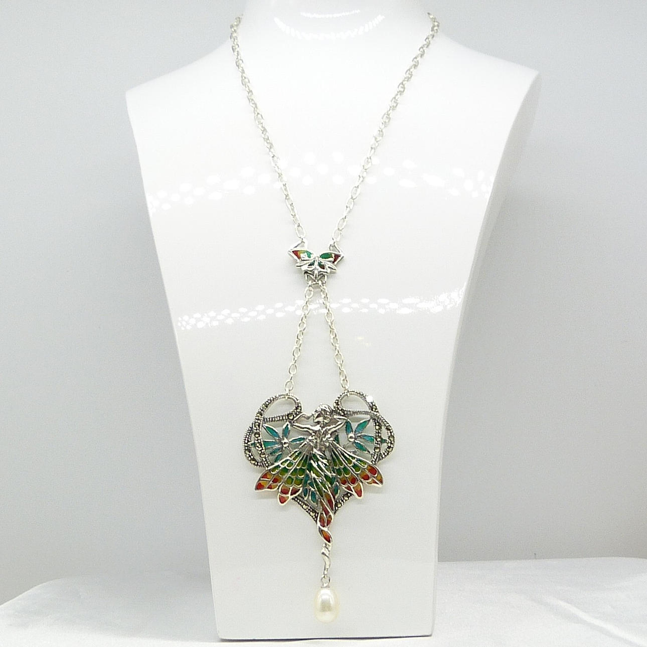 Un collar de plata plique-à-jour que representa una ninfa y está engastado con perlas cultivadas y marcasitas.